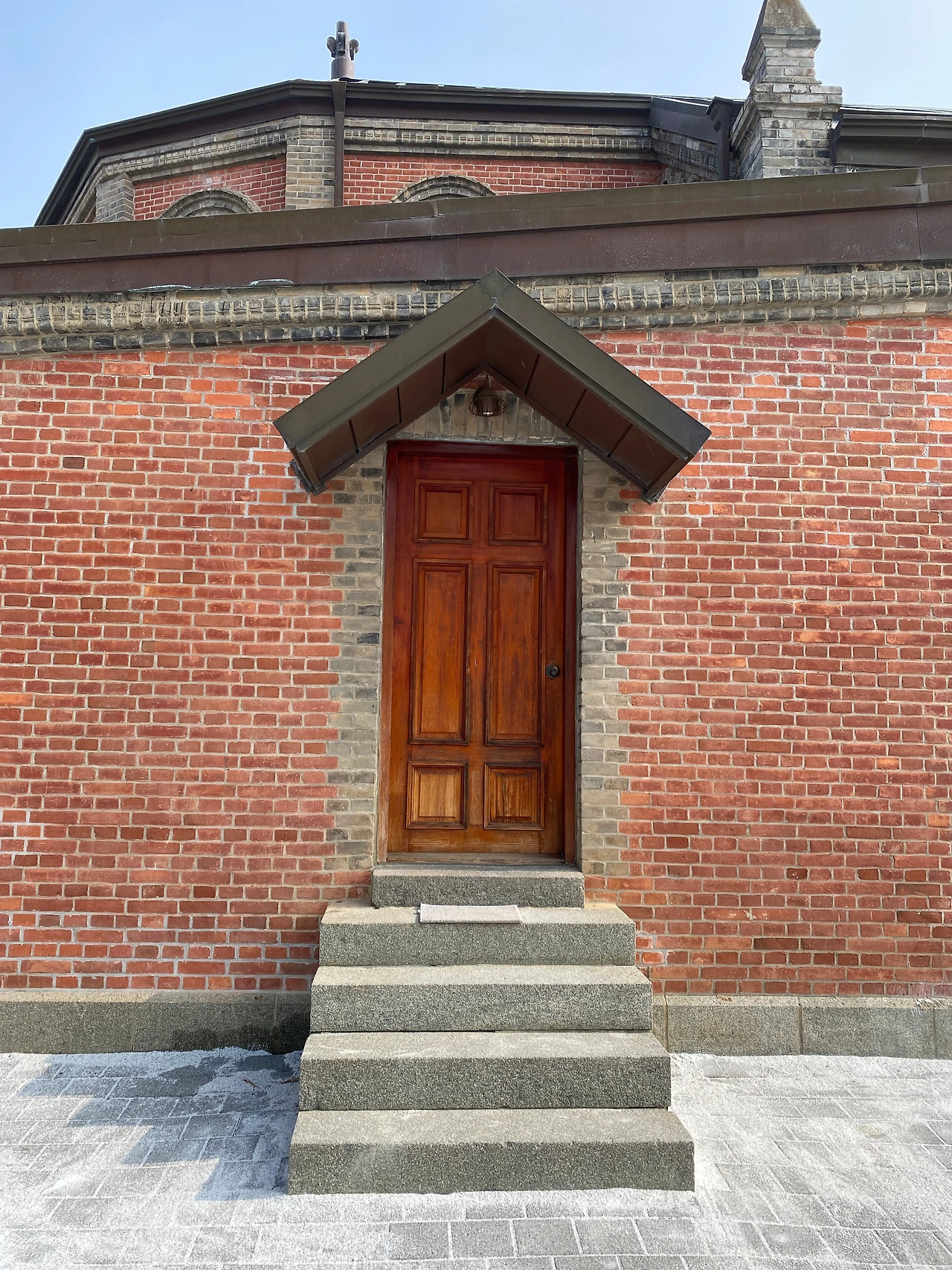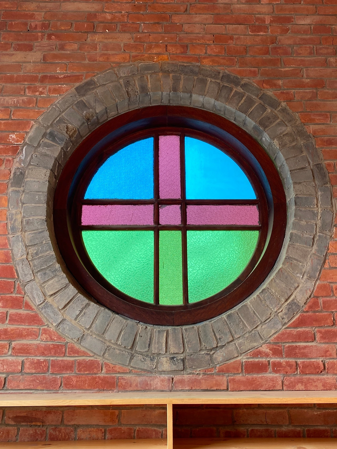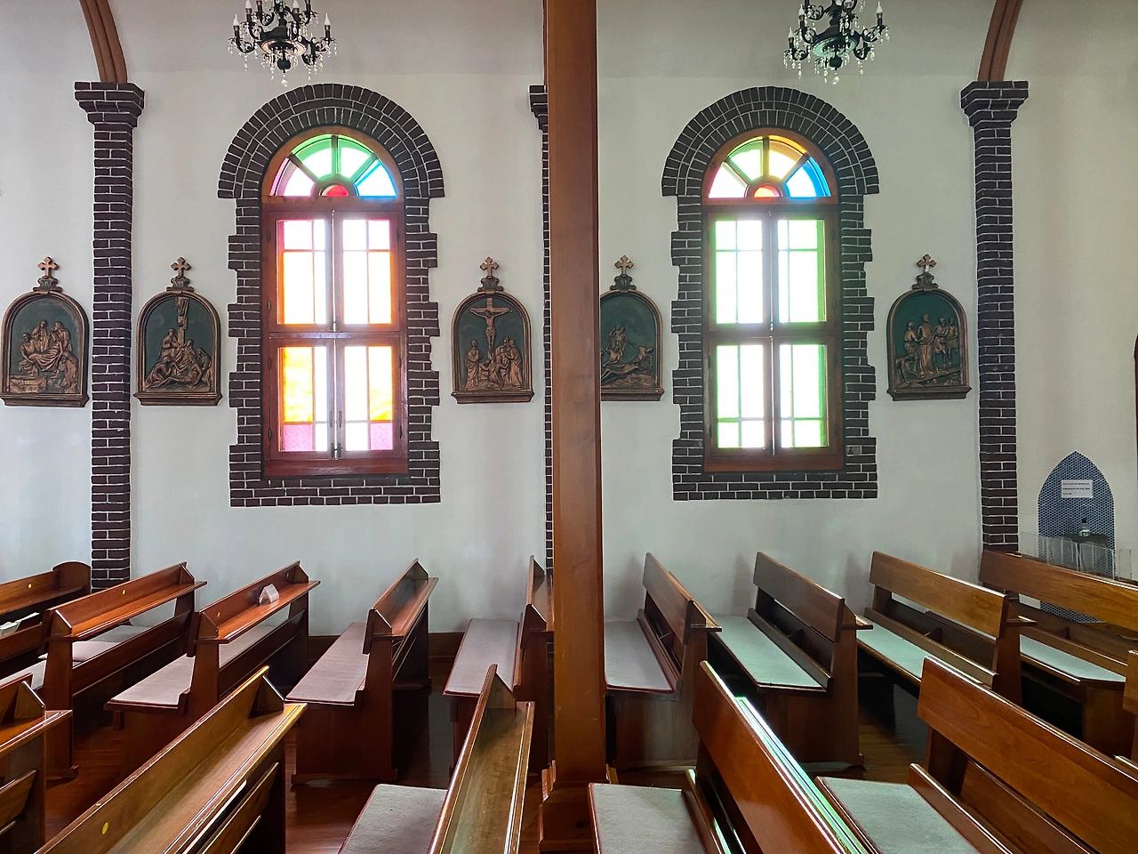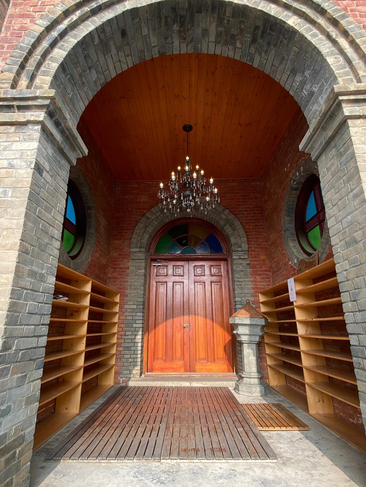 성당 안은 눈이 휘둥그레 해질 만큼 아름다웠다. 흰색 바탕의 천정과 그래서 더 뚜렷하게 보이는 목골, 아치형 스테인 글라스 창문엔 검은색 벽돌을 둘러 포인트를 주니 눈에 확 들어오고, 스테인글라스를 뚫고 들어오는 창연한 햇살을 더욱 아름답게 했다. 제대 쪽은 반원형으로 안으로 움푹 들어가 있는 모습이다. 그러다 보니 중앙에 십자고상이 한눈에 들어와 예수님의 고통이 그대로 전해지는 듯했다. 회중석은 이 지역 성당의 특색인지 3등분된 삼랑식 구조로 되어있다. 주랑은 목조로 되어있다. 성당의 아름다움에 취해 한참을 둘러보다 밖으로 나왔다. 들어갈 땐 보지 못했던 입구 양쪽의 둥근 스테인 글라스 창이 눈에 확 들어왔다. 오래된 문들도 세월의 흔적이 묻어있어 더욱 은은한 빛을 내는 듯했다