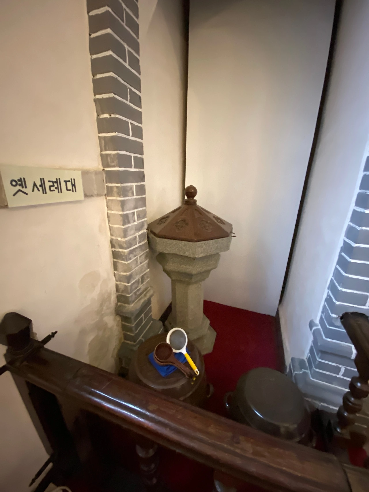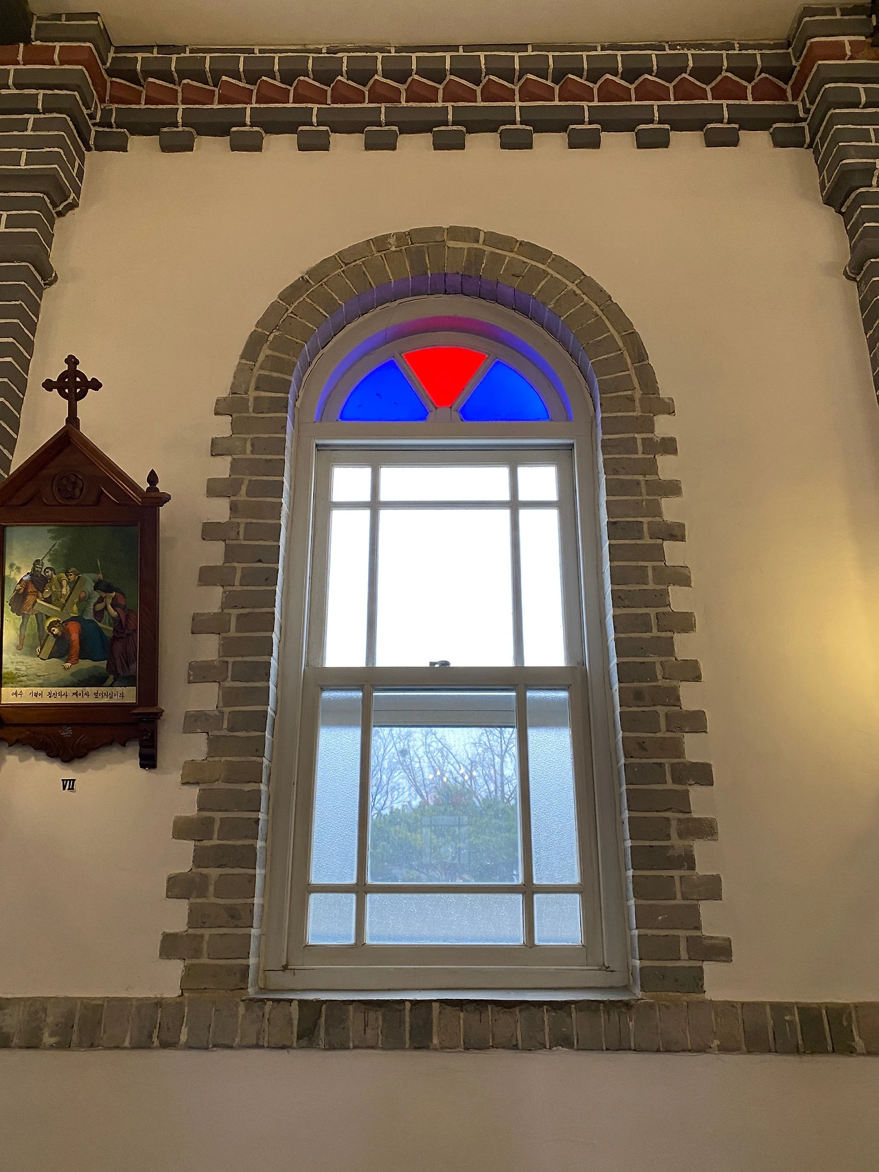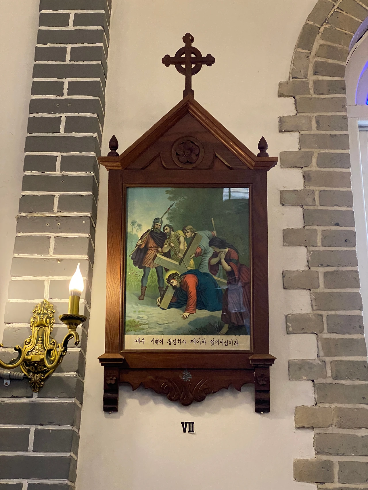 양측으로 난 창은 역시 둥근 아치인데 위쪽에만 스테인글라스로 장식하고 아래는 투명한 유리와 불투명한 유리를 배치시켜 화려하진 않지만 세련되 보이기도 했다. 유리창 좌우로 십자가의 길 14처가 마치 동화책의 삽화같이 그려져 있다. 아래엔 오래된 옛체로 그림을 설명하고 있다. 이마저도 너무나 고풍스럽다. 예감이 맞다면 그 옛날 처음 성당이 지어질 때 부터 있었던 것같다. 뒤쪽의 고해소 역시 처음의 것을 그대로 보존 한 것같은 특이한 고해소가 있었다. 안에 들어가면 모든 죄를 고백할 수 밖에 없을 듯한 모습이다. 옛 세례대까지 원형 그대로 보존하고 있었다. 아름답다고 유명해진 공세리 성당의 떠들석한 외부의 혼잡한 모습 그리고 감곡성당의 내부 주랑에 못을 박고 전기줄을 칭칭감아 모니터를 설치한 모습에 상한 마음의 상처가 조금쯤 치유되는 느낌이었다.