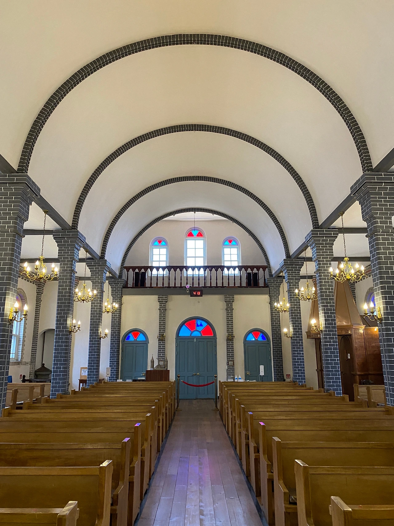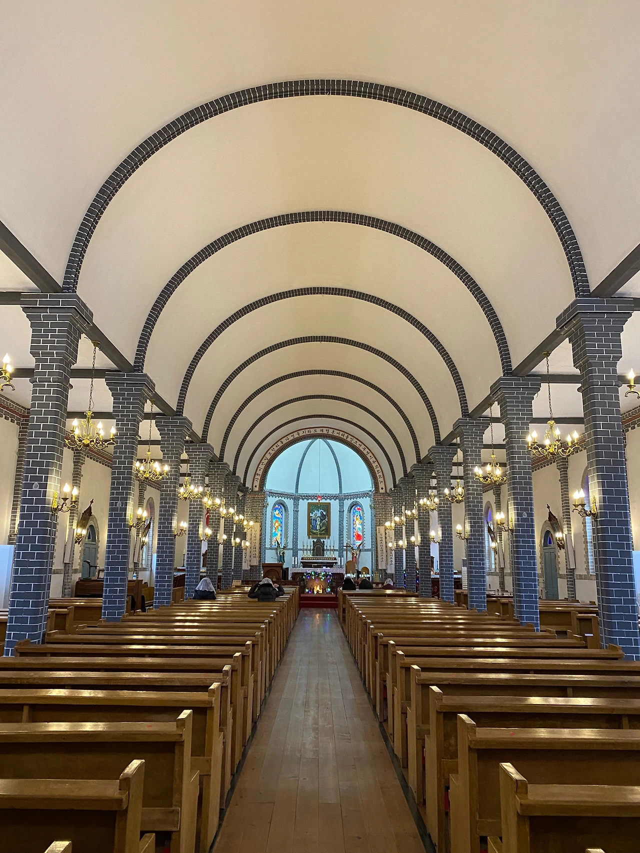 세개의 둥근 아치형으로 만든 세개의 문은 성당으로 들어가는 입구다. 중간은 양쪽의 문보다 조금 크게 만들어 놓아 이 또한 미적인 요소를 더해준다. 안으로 들어서니 돔형으로 둥근 천장이 이채롭다. 회중석은 양쪽의 기둥으로 삼등분한 삼랑식 구조다. 기둥은 석조로 크지않게 가지런하게 줄지어 서있어 아름답다. 저녁미사 준비중인지 몇 사람의 신자들이 드문드문 앉아서 기도로 미사를 준비하고 있었다. 주보를 보니 7시 미사인데 한 시간이나 일찍와서 기도하는 그들의 모습에 신심이 보인다. 그만큼 간절한 무엇인가가 있겠지 생각하니 성당의 아름다움에 취해 여행하는 내 모습이 조금쯤 숙연해지기도 했다.