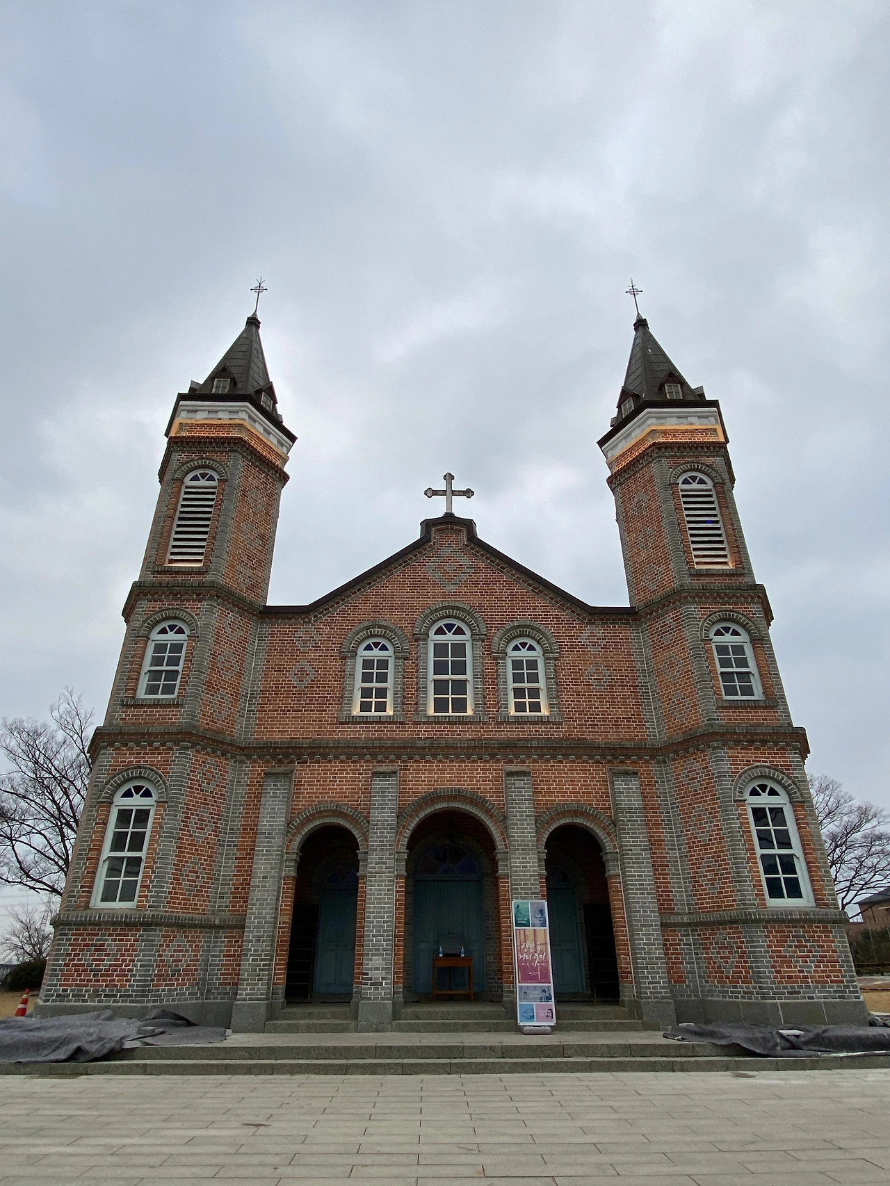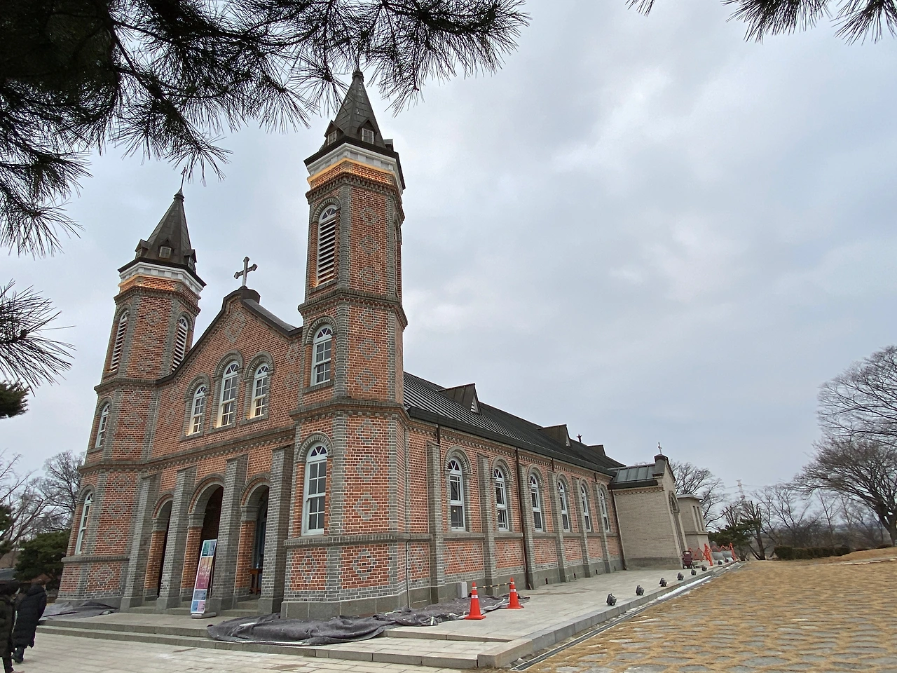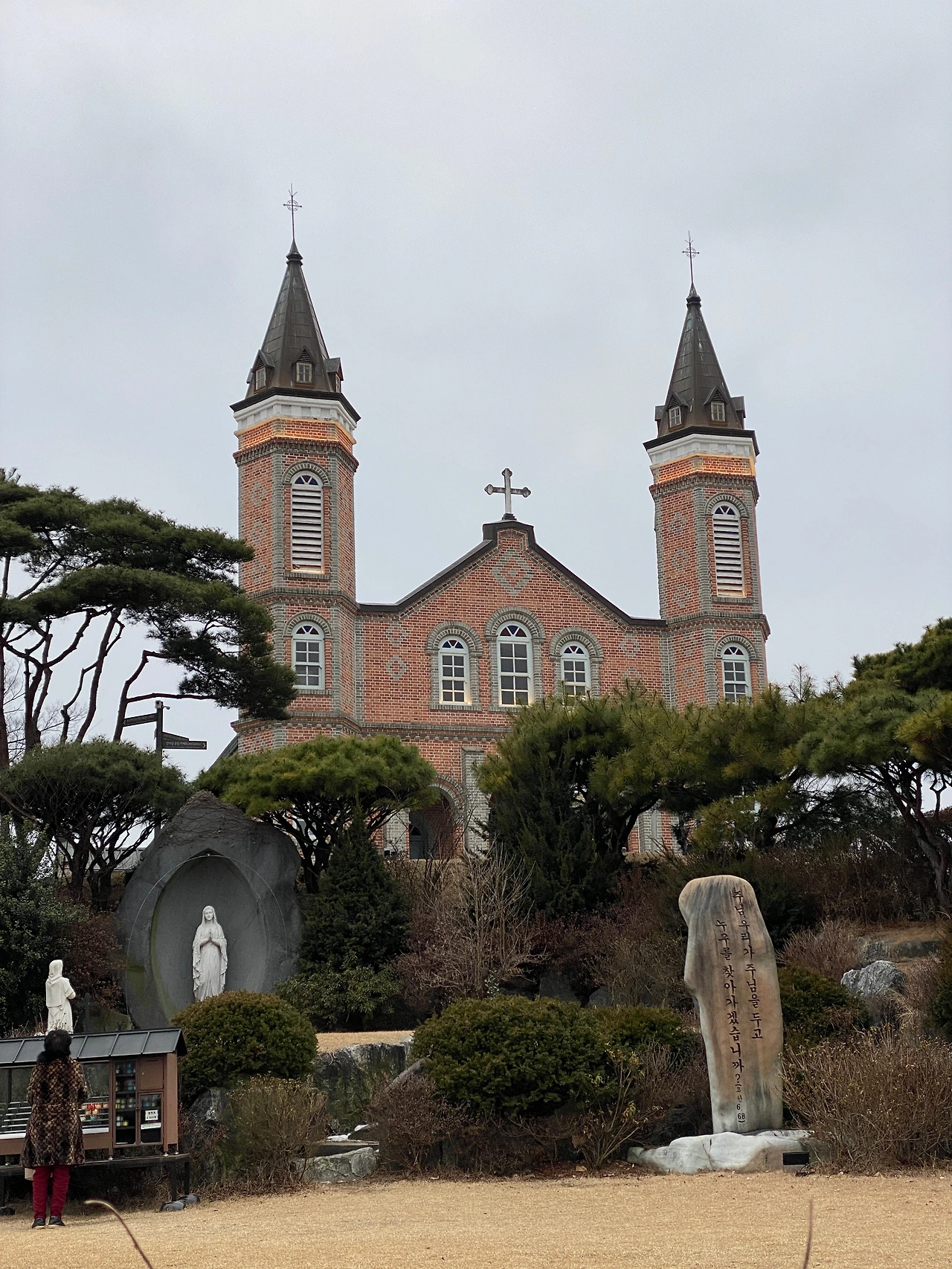 내포의 성당들을 돌아보기로 한 첫날 네번째로 도착한 곳이 당진의 합덕성당이다. 주차장으로 들어서니 올려다 보이는 언덕위 두개의 첨탑이 온통 마음을 사로잡는다. 성당 아래에 조성된 성모당에서 기도하는 신자들의 모습이 사뭇 경건하고 간절하다. 아름다운 성당의 모습이 고풍스럽게 언덕위에 우뚝 솓아 있으니 아래에서 바라보는 그 모습에 압도되는 듯한 심정이 되었다. 두개의 첨탑으로 건축된 성당은 처음 본다.