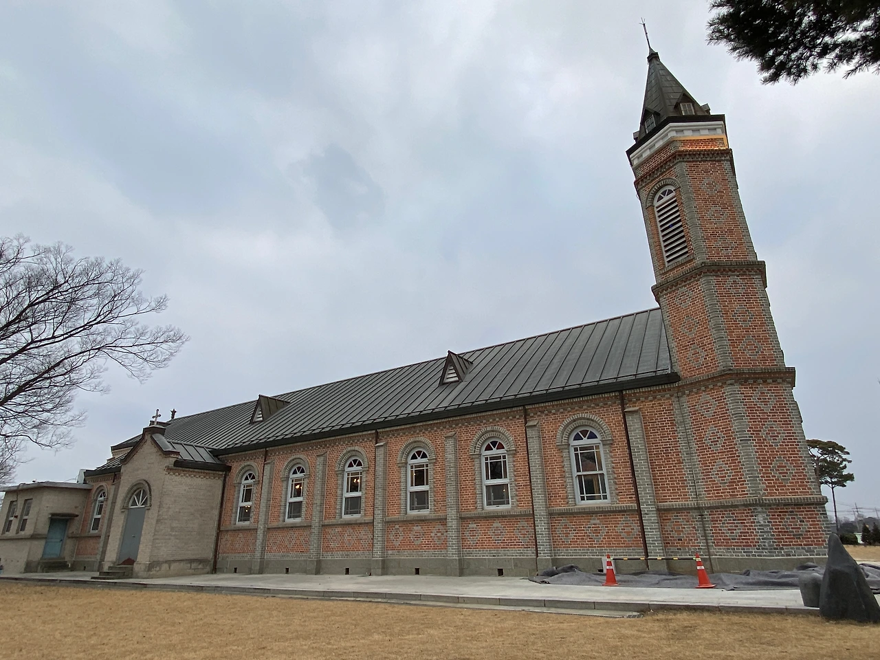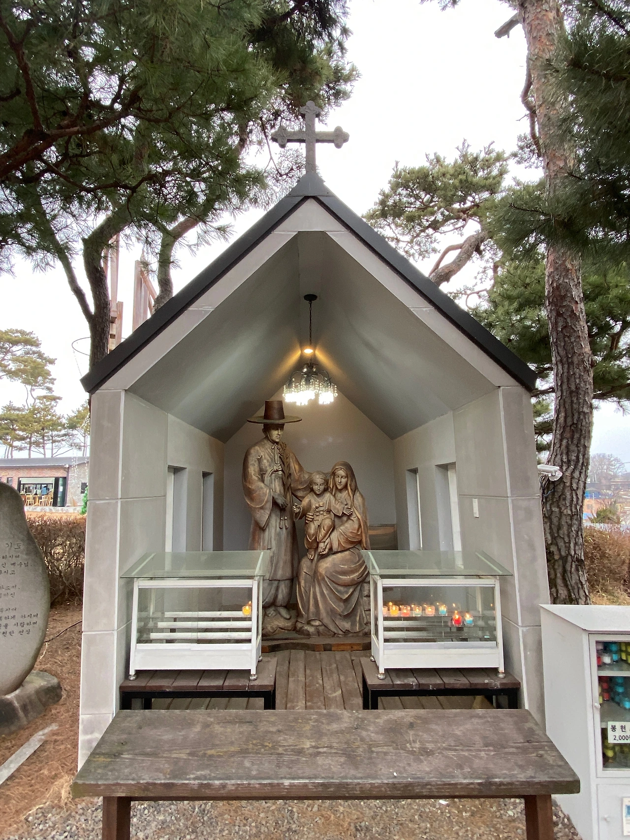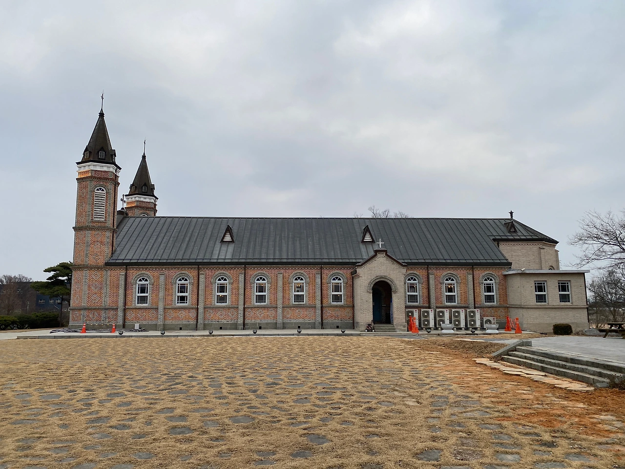 내포의 성당들을 돌아보기로 한 첫날 네번째로 도착한 곳이 당진의 합덕성당이다. 주차장으로 들어서니 올려다 보이는 언덕위 두개의 첨탑이 온통 마음을 사로잡는다. 성당 아래에 조성된 성모당에서 기도하는 신자들의 모습이 사뭇 경건하고 간절하다. 아름다운 성당의 모습이 고풍스럽게 언덕위에 우뚝 솓아 있으니 아래에서 바라보는 그 모습에 압도되는 듯한 심정이 되었다. 두개의 첨탑으로 건축된 성당은 처음 본다.