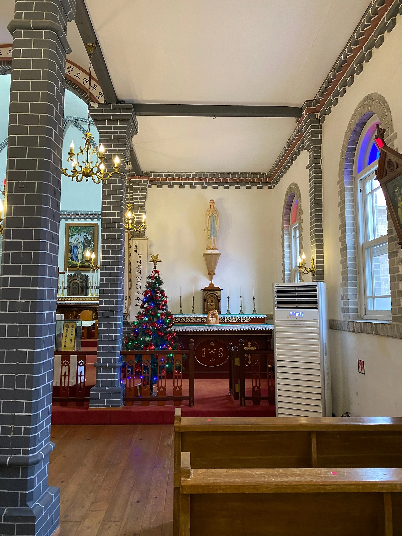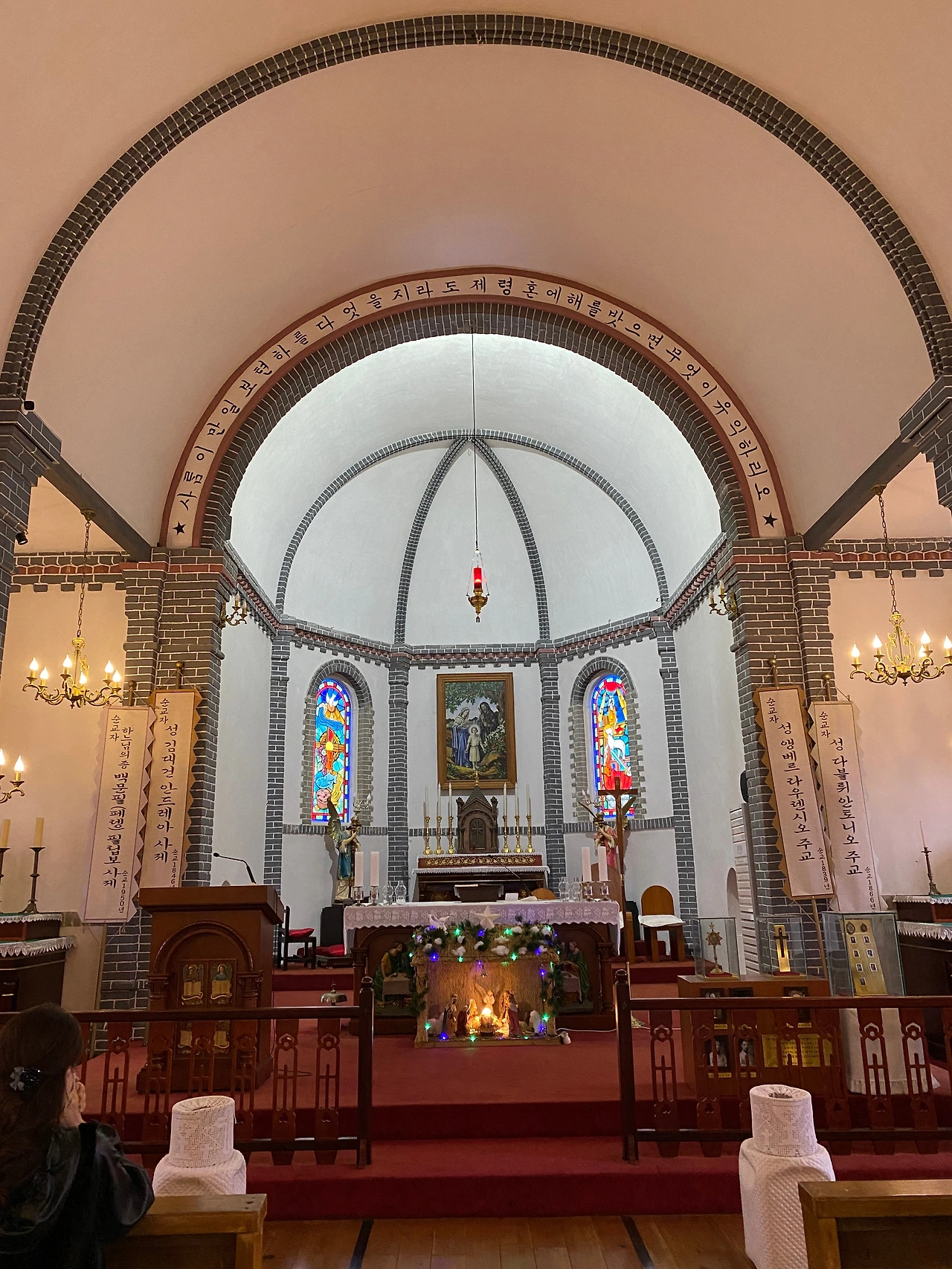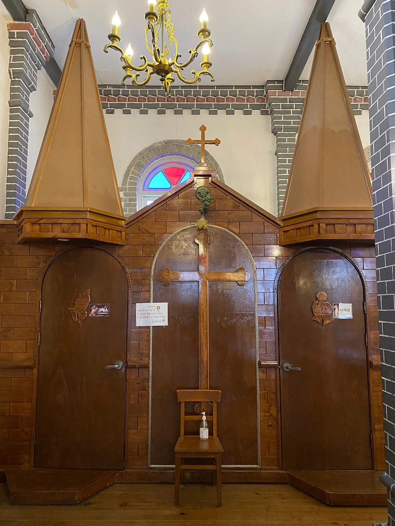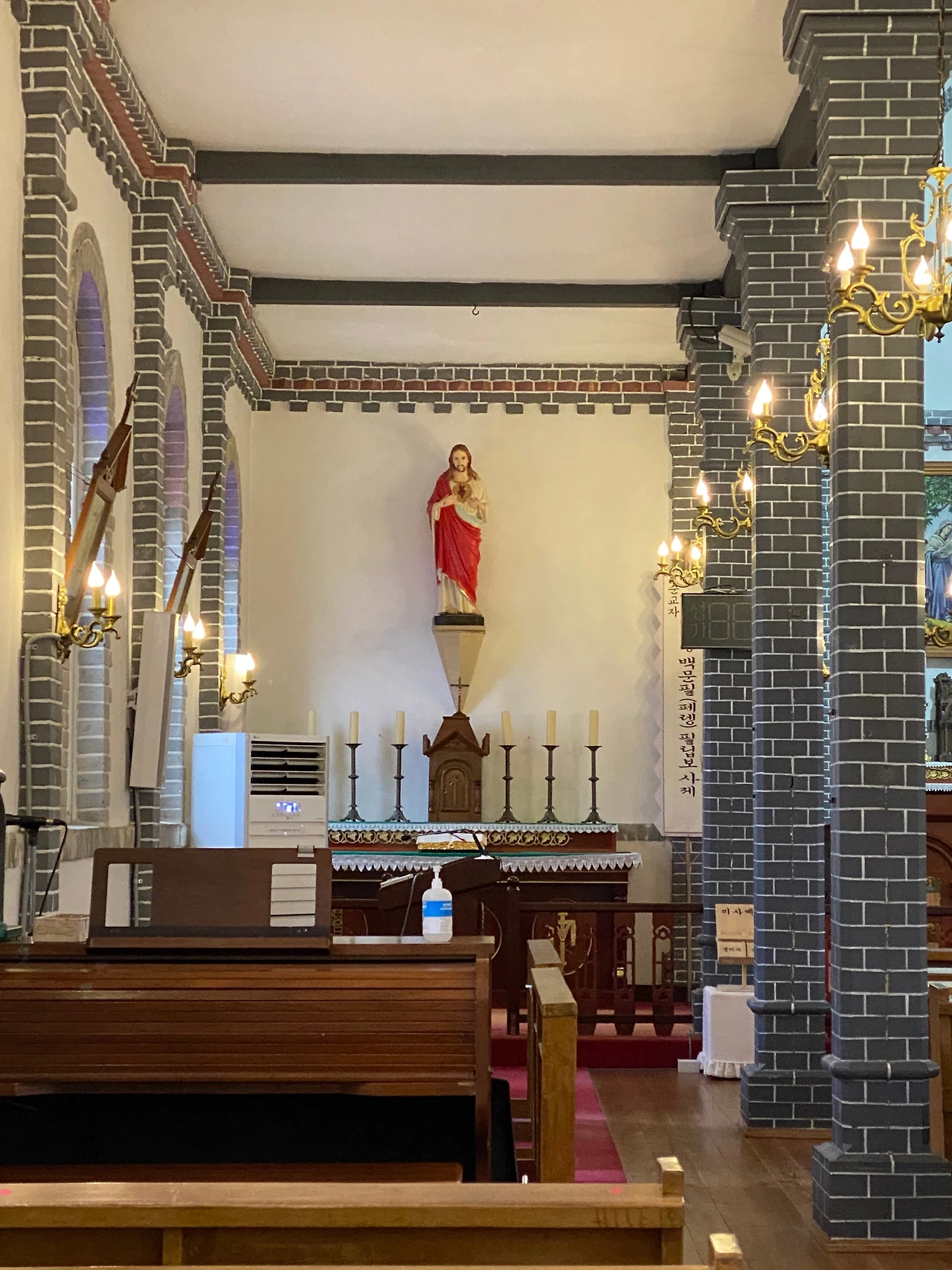 중앙의 제대 역시 특이했다. 보통은 십자고상을 중앙에 달아놓는 것이 보통인데 합덕성당은 중앙에 성가정화가 걸려있었다. 성당으로 들어오는 입구에서 본 성가정상이 생각났다. 아마도 합덕성당은 가정의 화목과 사랑을 중심 덕목으로 세우는 성당인가 싶기도 했다. 제대 양측의 예수성심상과 마리아상이 걸려있었다. 분명 여행전에 책에서 본 사진의 배치가 아니었다. 어쩌면 매번 이렇게 배치가 바뀌는 것인가 생각도 해보았다.