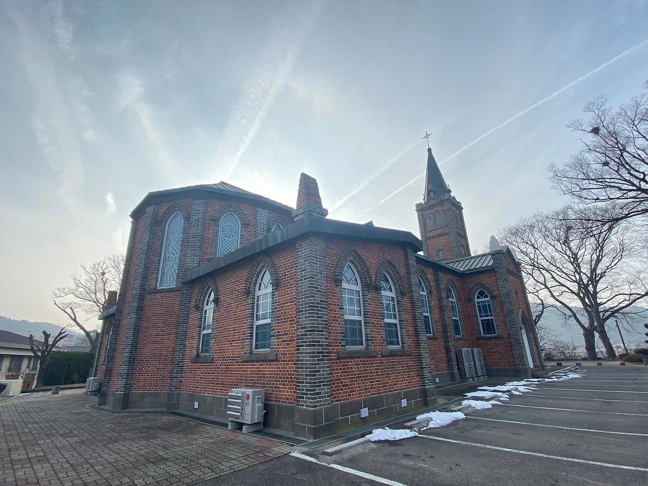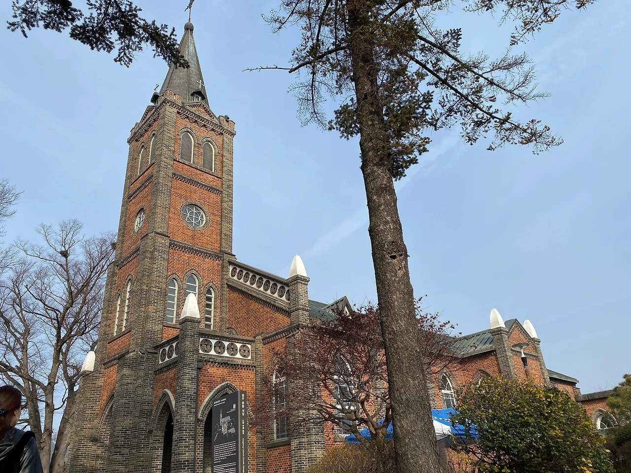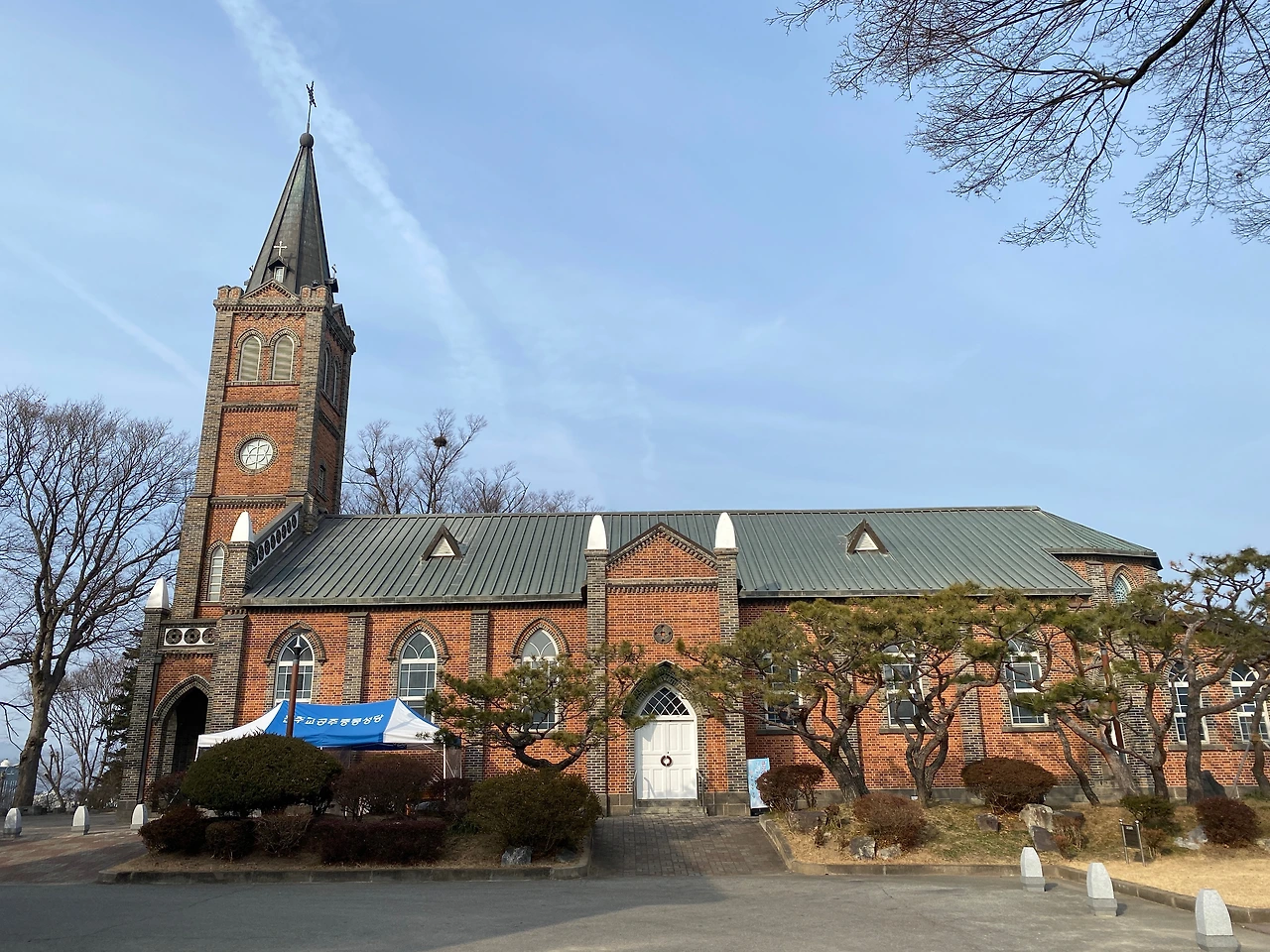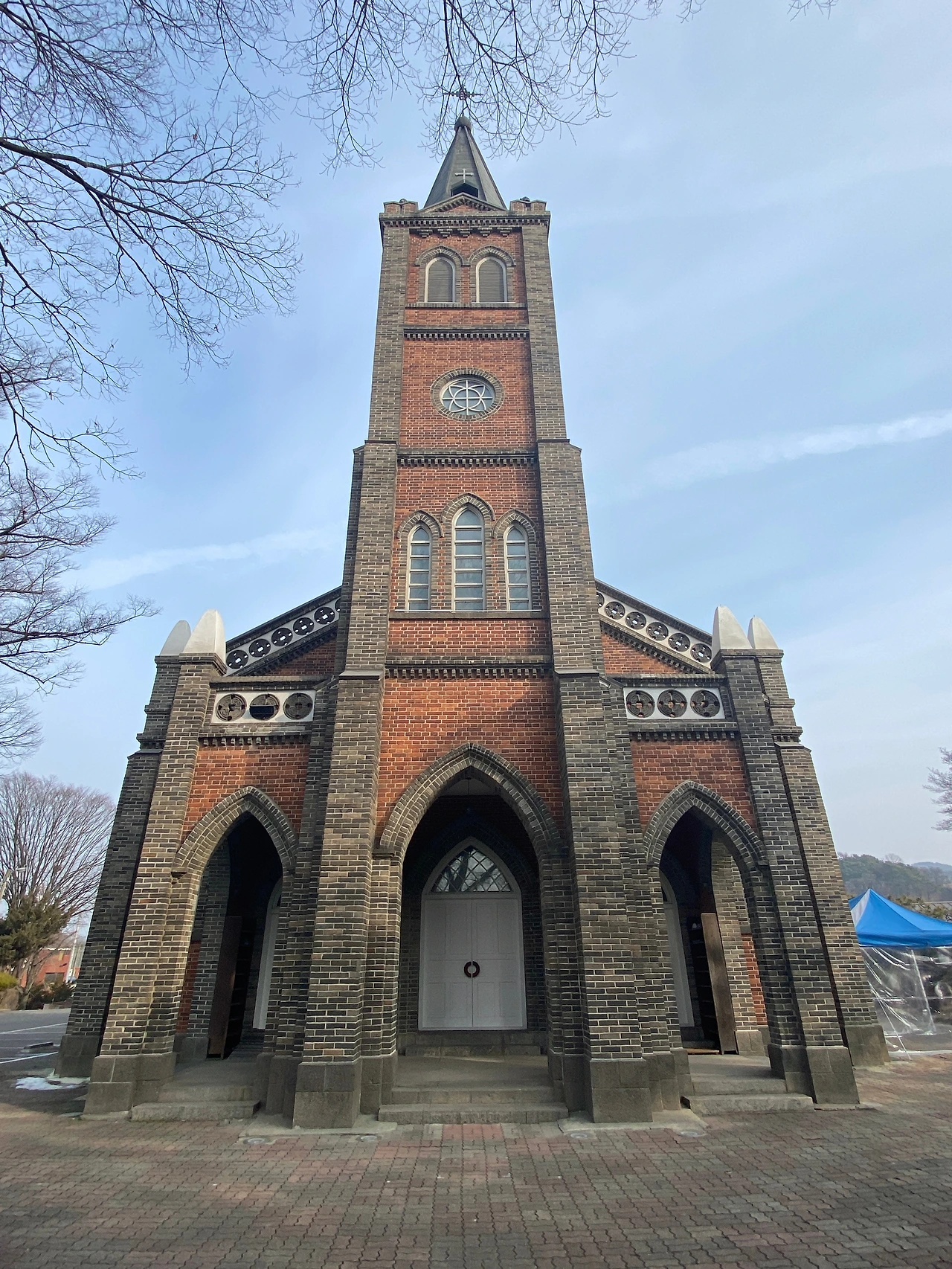 여러 아쉬움이 뒤섞인 지친 여정의 마지막은 공주 중동성당이었다. 조금쯤 가파른 오르막 도로를 올라와 왼쪽 언덕에 위치한 중동성당의 입구는 순례길을 마무리 하는 순례자를 맞기에 충분했다. 석조로된 아치형 입구는 그 세월을 짐작키도 하겠지만 조잡하기만한 콘크리트의 도시 가운데서 엄청난 무게의 품위와 경건함마저 느껴졌다. 마치 세상과 천국을 가르는 경계처럼 보였다. 입구 뒤로 붉은 벽돌의 계단이 마치 벽처럼 가파르다. 천국으로 오르는 계단이 아니겠는가 싶어 한단 한단 두려운 마음으로 올라갔다. 두근거리는 맘으로 몇계단 올라가지 않아 고딕풍의 성당이 바짝 고개를 젖혀 보였다. 언덕위 첨탑의 십자가가 하늘에 닿을 듯 보였다.