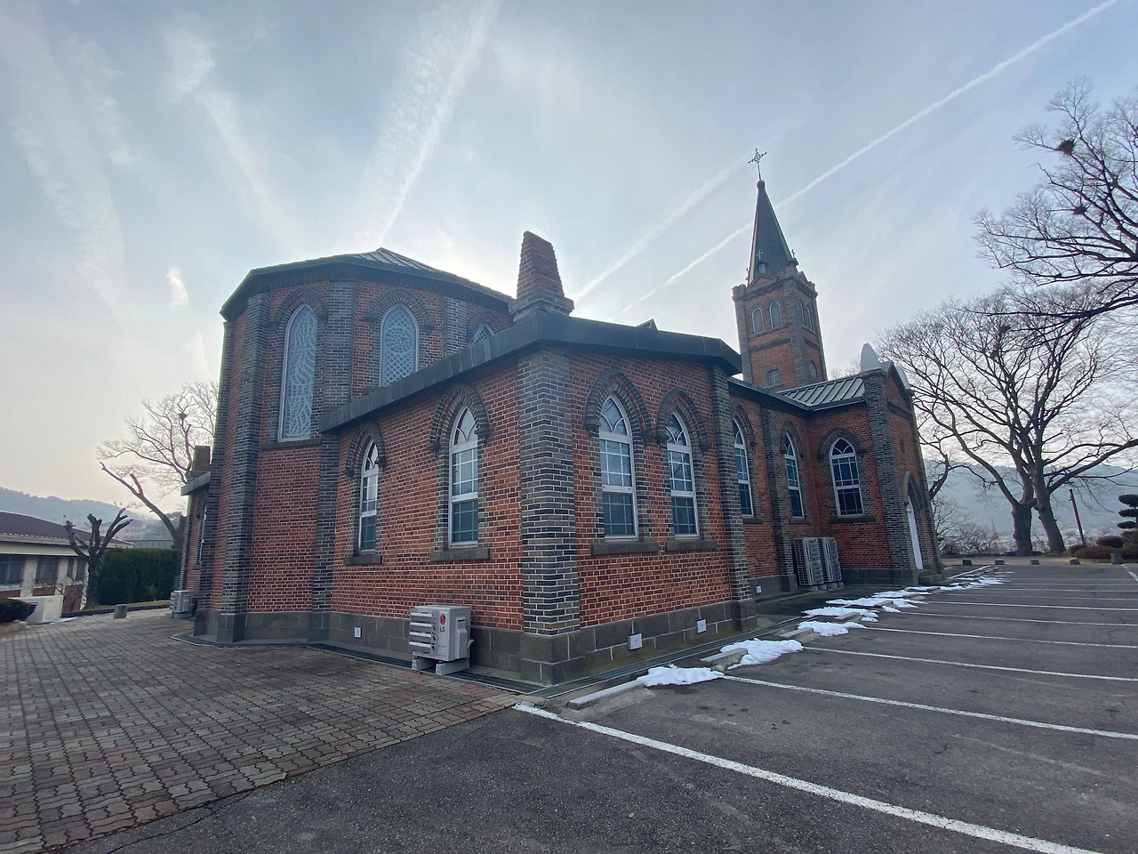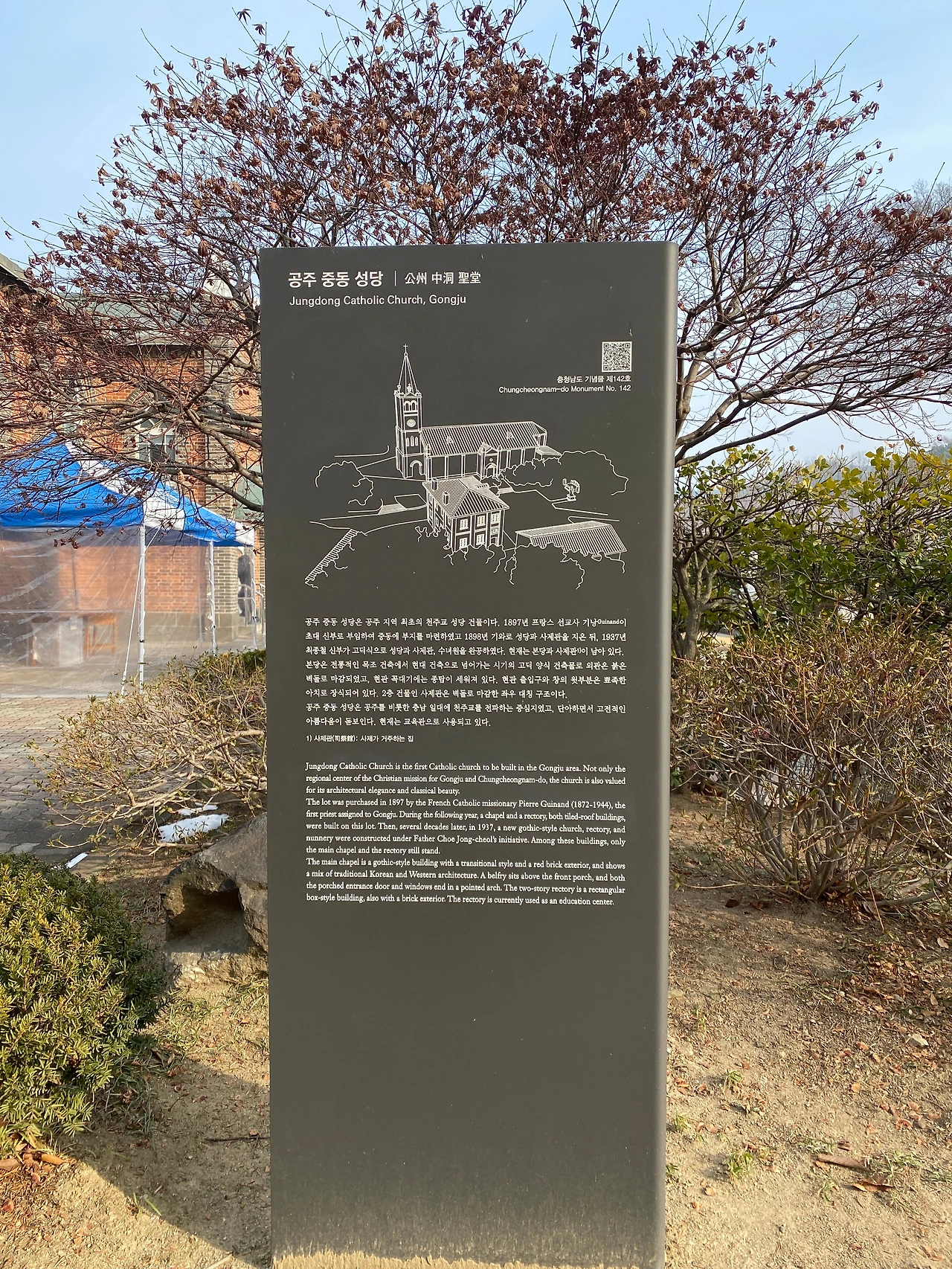 중동성당은 바로 이러한 공간의 본질을 일깨워주기 위한 적절한 곳이란 생각이 들었다. 마침 시간도 오후3시경이라 오가는 사람도 드물어 성당을 둘러보기 좋은 시간이었다. 성당은 오랜 시간에도 불구하고 깨끗하고 그러면서도 준엄한 모습이었다. 오래된 석재들이 어떻게 이렇듯 깨끗하게 보존 될 수 있는지도 의아스러웠지만 그러면서도 세월이 담아내는 짙은 회색과 강한 붉음이 놀라웠다. 언덕위 동산에 지어진 성당의 마당이 꽤나 넓었다. 공주지역의 첫성당이라한다.