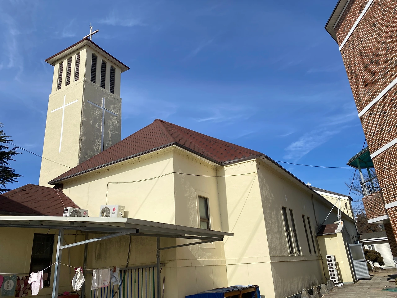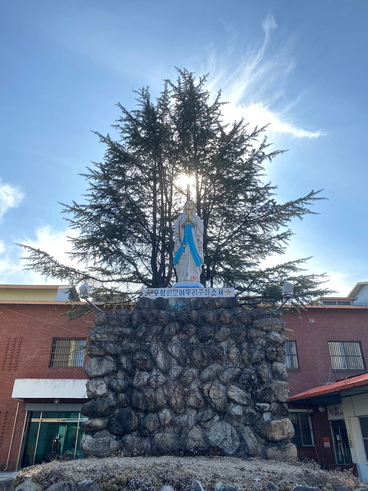 장식이 거의 없으며 그 흔한 스테인글라스나 샹들리에도 없다. 내외부가 그저 담백하고 간소하다. 1월 중순 오랜만에 맞는 화창한 주말. 하늘엔 붓이 스쳐간 흔적처럼 얇은 구름만 간간히 떠있고 햇살은 따스했다. 시리도록 푸른 하늘과 영천성당의 밝고 화사한 베이지색 외벽이 너무나 조화롭다. 군데 군데 낡은 티를 내는 곳은 보수하지 않아 세월의 흔적이 고스란히 묻어났다.