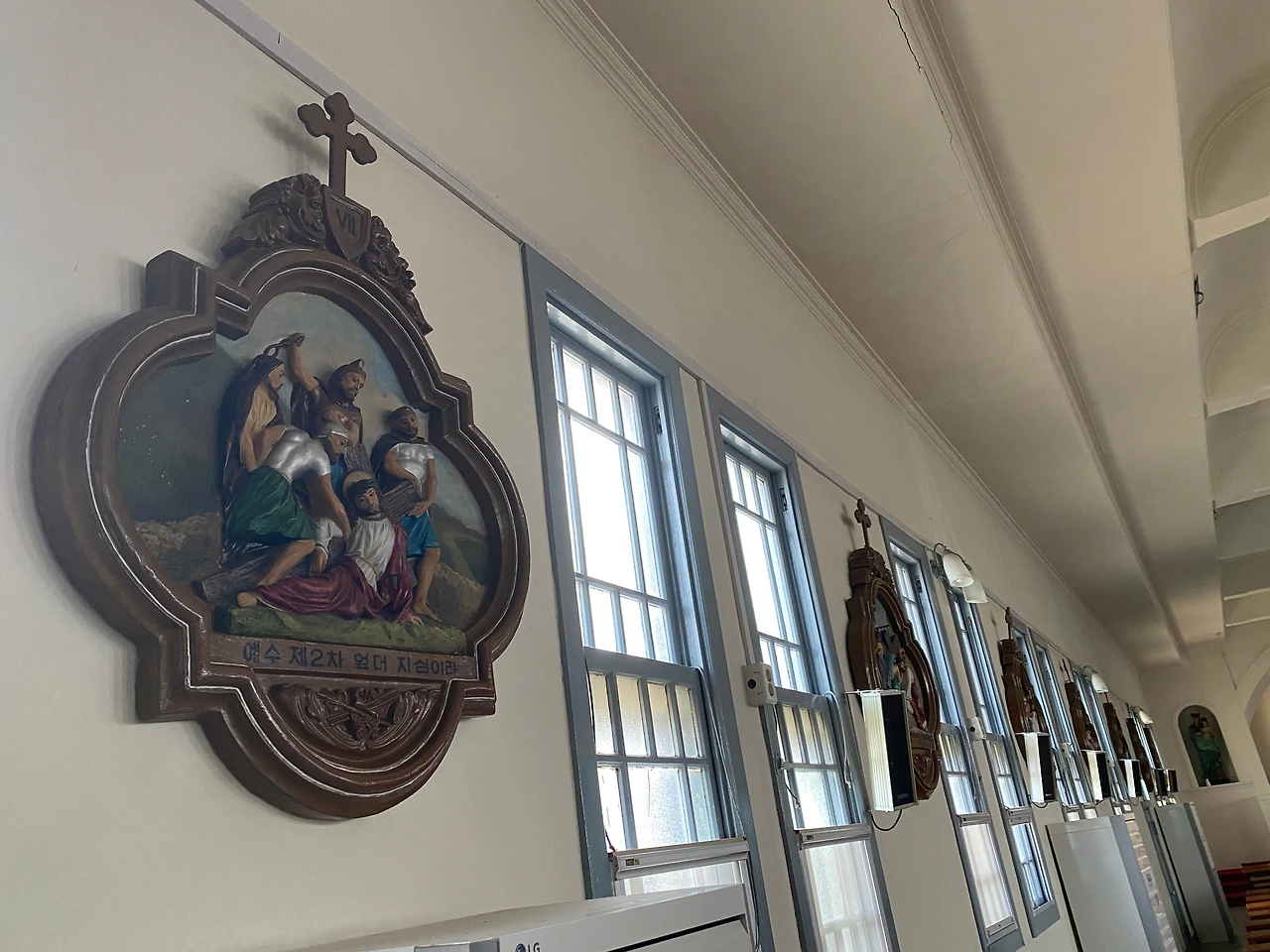 14처의 글귀와 오래묵은 나무에 그려진 예수님의 십자가 고난과 제대 양측에 둥근 아치형에는 성모상과 예수성심상이 자리하고 있다. 조각상의 색상이 강렬하고 흔히 보는 형식은 아닌 것같아 보는 눈이 즐겁다. 특히 십사처 그림 밑 설명하는 글귀의 글씨체나 그 글귀가 오래됨을 증명이라도 하듯하니 재미있다. "예수 십자가상에 죽어심이라" 경상도 영천이라 으라는 발음이 어로 된 것인지 알 수는 없으나 옛것이라는 느낌이 더 든다. 마당에 있는 성모상에도 글귀가 있는데 "구령의 모여 우리 구하소서" 라고 씌여 있다. 흰 바탕의 글귀가 70년대 글씨체 같아 정감있다.