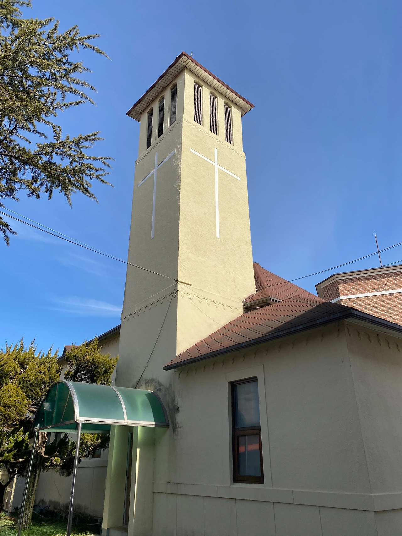 성당 전면의 아치창은 마치 웃는 모습이다. 석재나 벽돌로 창을 낸 아치창이 아니라 그저 흰색페인트로만 아치를 그리는 듯한 모습은 평면적이지만 오히려 더 미려하다. 중간엔 십자형으로 멋을 내어 소박하게 포인트를 주었다. 전체적인 건물의 모습은 지중해의 건축물과 닮아 이국적이다.