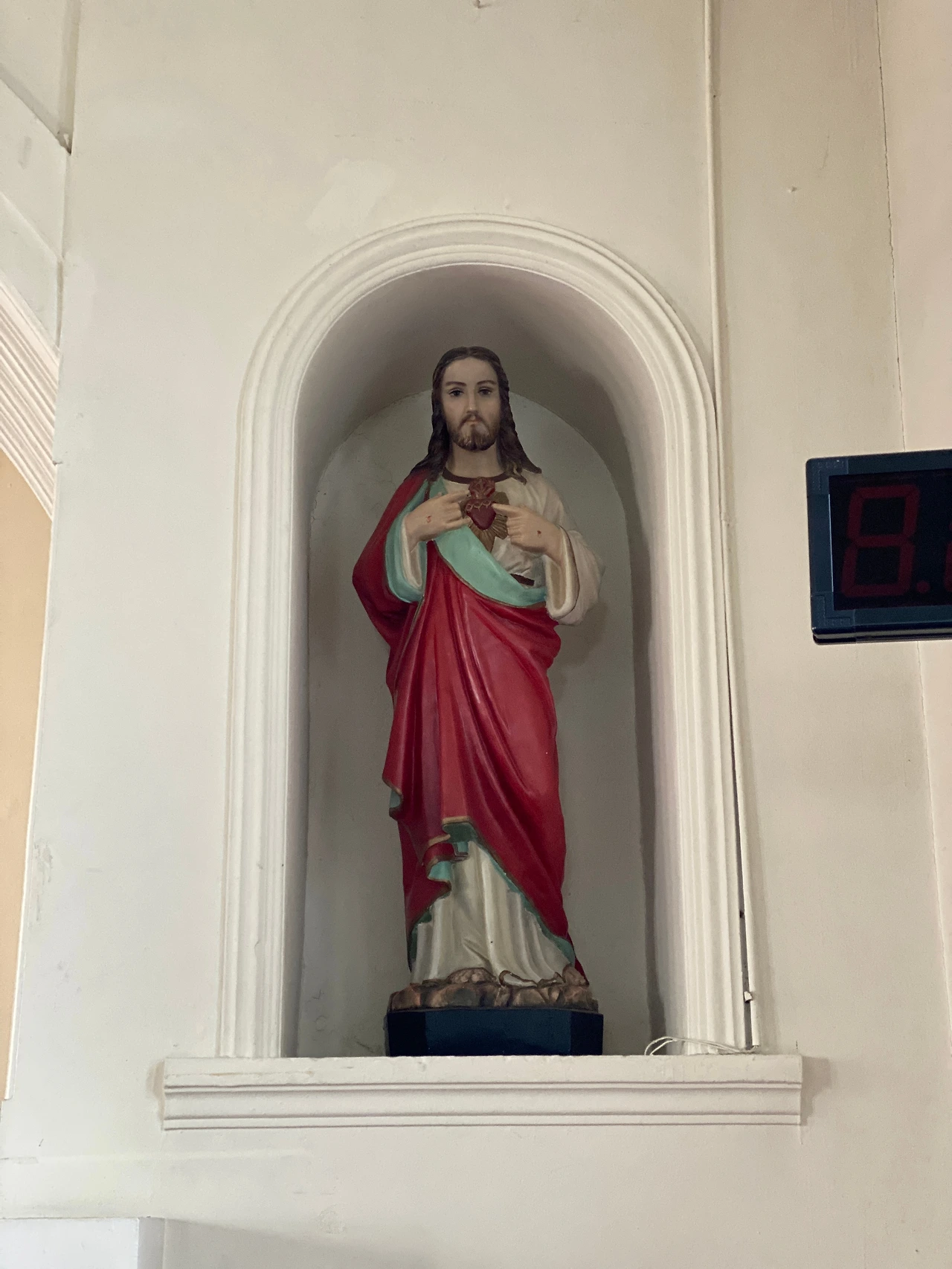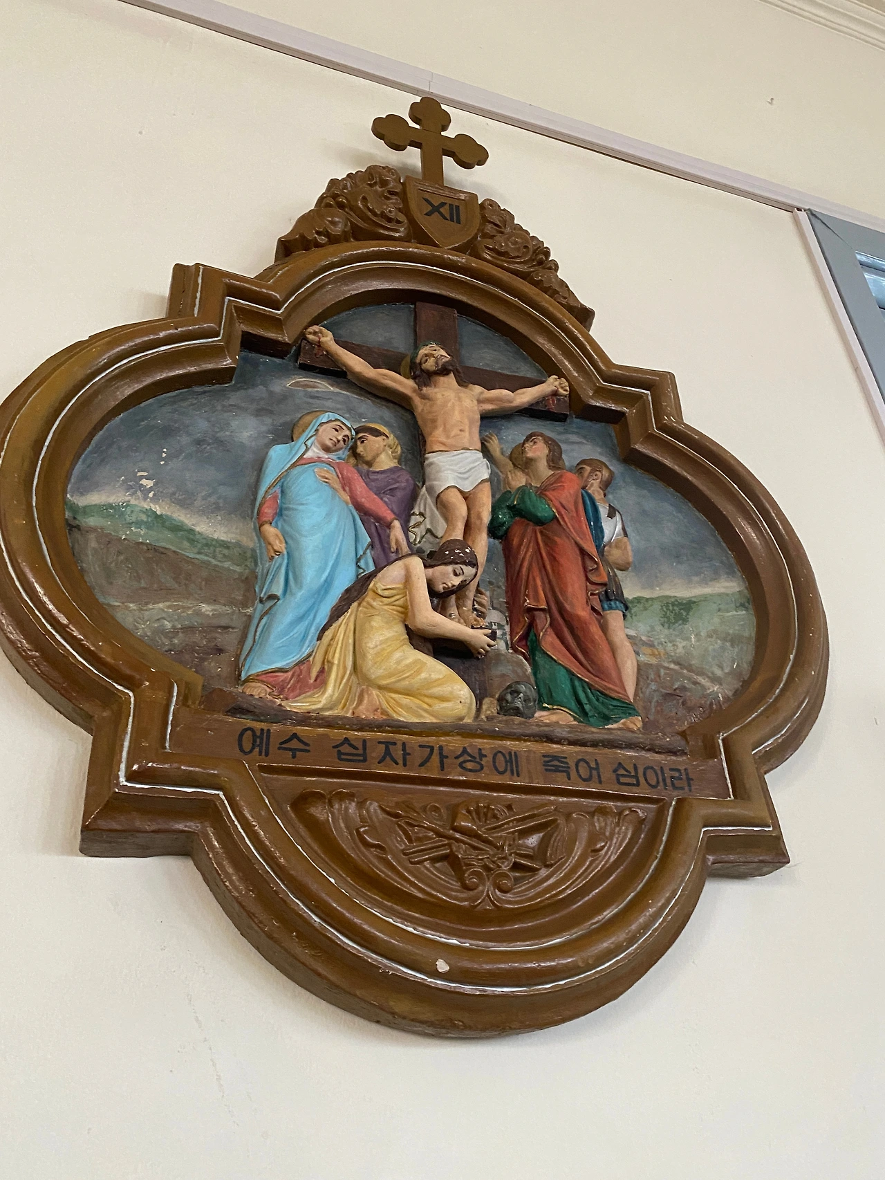 제대 뒤 십자고상과 함께 걸려있는 최후의 만찬 조각이 이채롭다. 그림이 아니라 입체적이며 단순하게 표현된 추상적 부조형식이다. 동으로 만든 것처럼 보이는데 예술적 가치로도 뛰어나게 보인다. 누가 만들었으며 누가 이 곳에 가져왔는지 알고 싶지만 검색해봐도 알 수가 없었다.