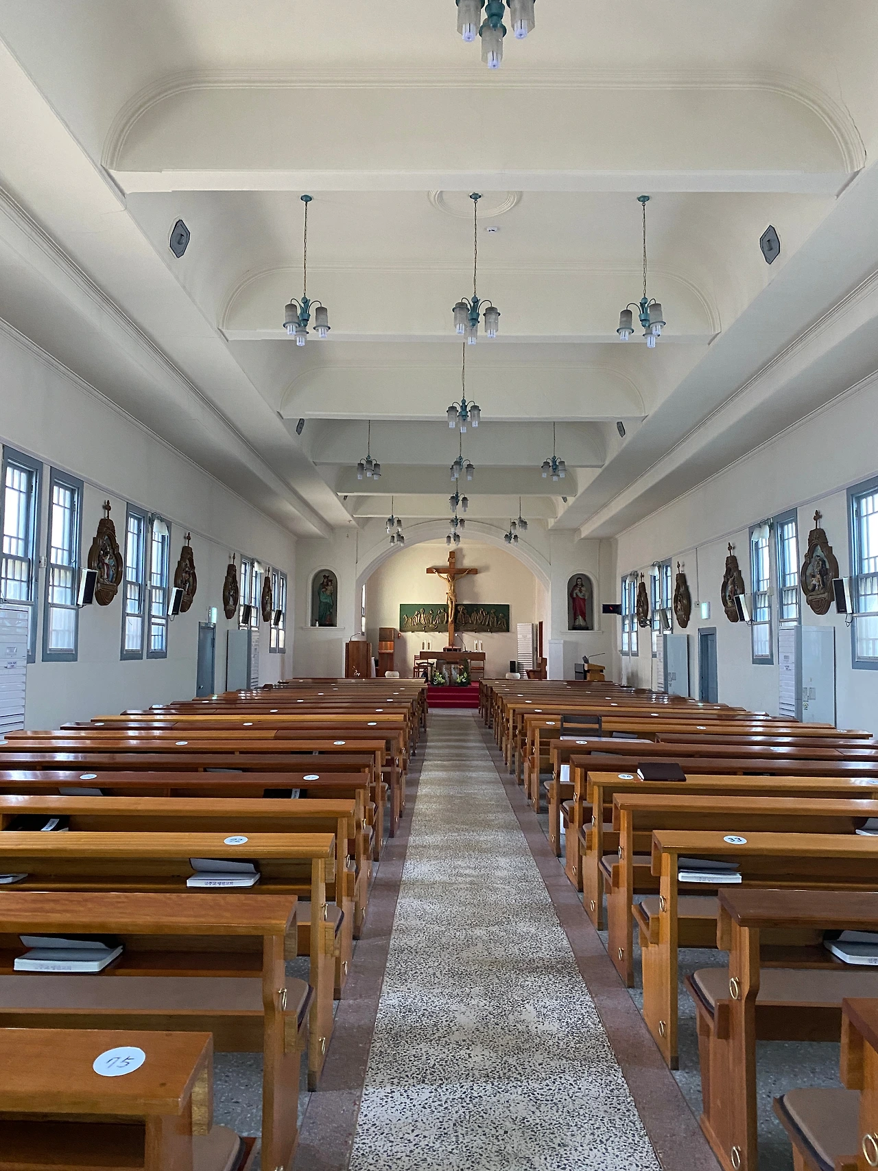 본당의 문을 열고 들어서면 길게 뻗은 공간안에 두줄의 회중석이 시원스럽게 놓여있다. 그리 넓지 않은 제대는 아치형으로 제대에 집중하기 좋은 구조다. 외벽과 마찬가지로 밝은 톤의 벽에 민트색 창이 기분좋은 시각을 만든다. 양쪽에서 들어오는 빛이 성당안의 내부를 은은하게 비춘다. 창은 사각이다. 위로 들어올릴 수 있는 구조이며 밖이 보이지 않는 질감있는 창이다. 이런 유리창은 투명창보다 안에서 느끼는 빛의 농도가 은은해서 좋다.