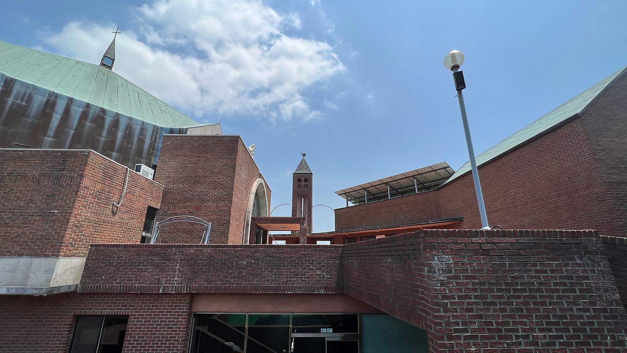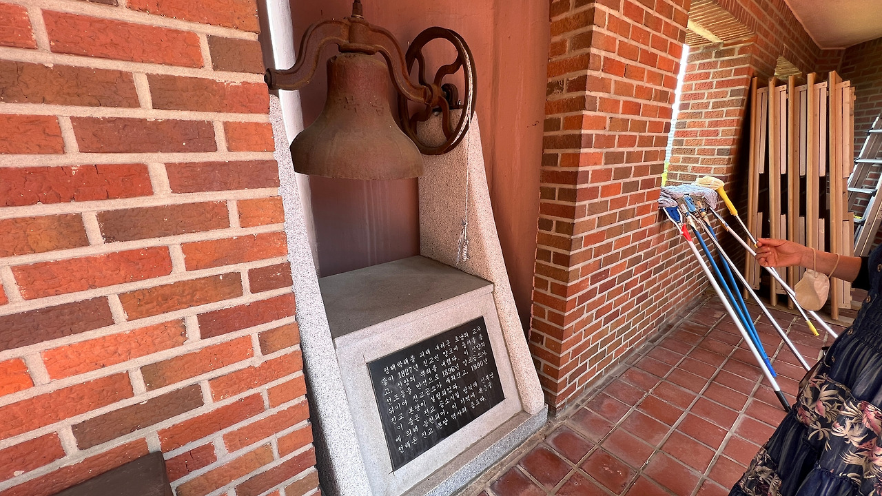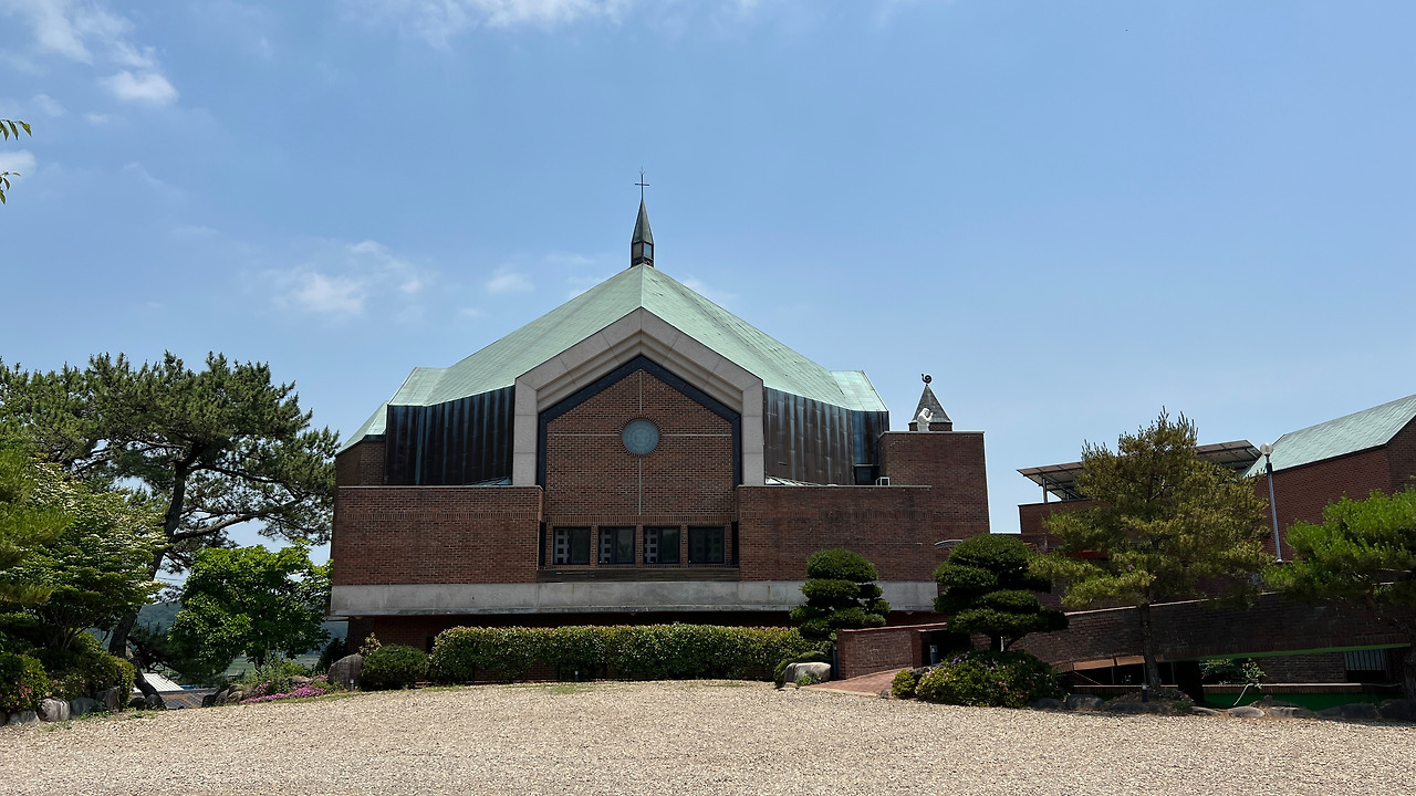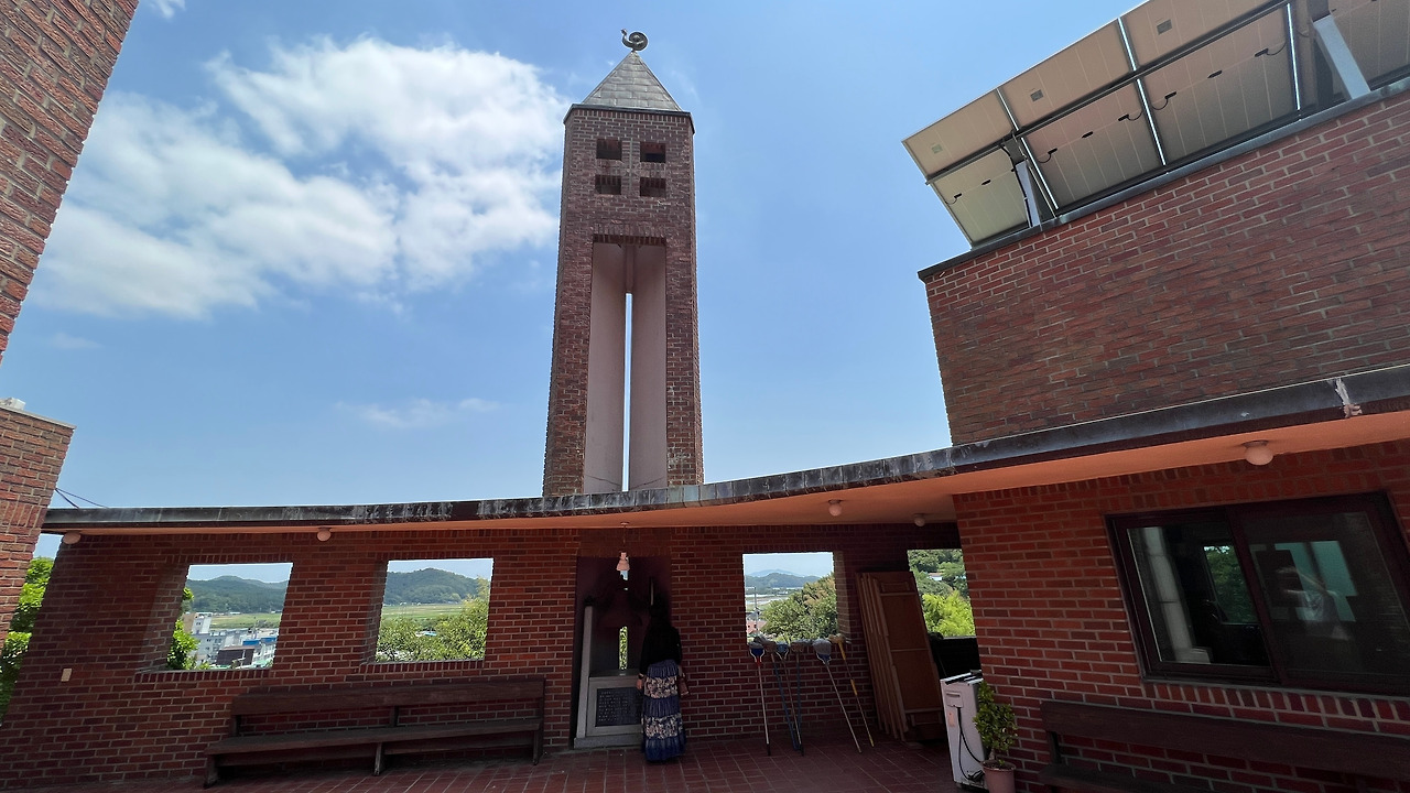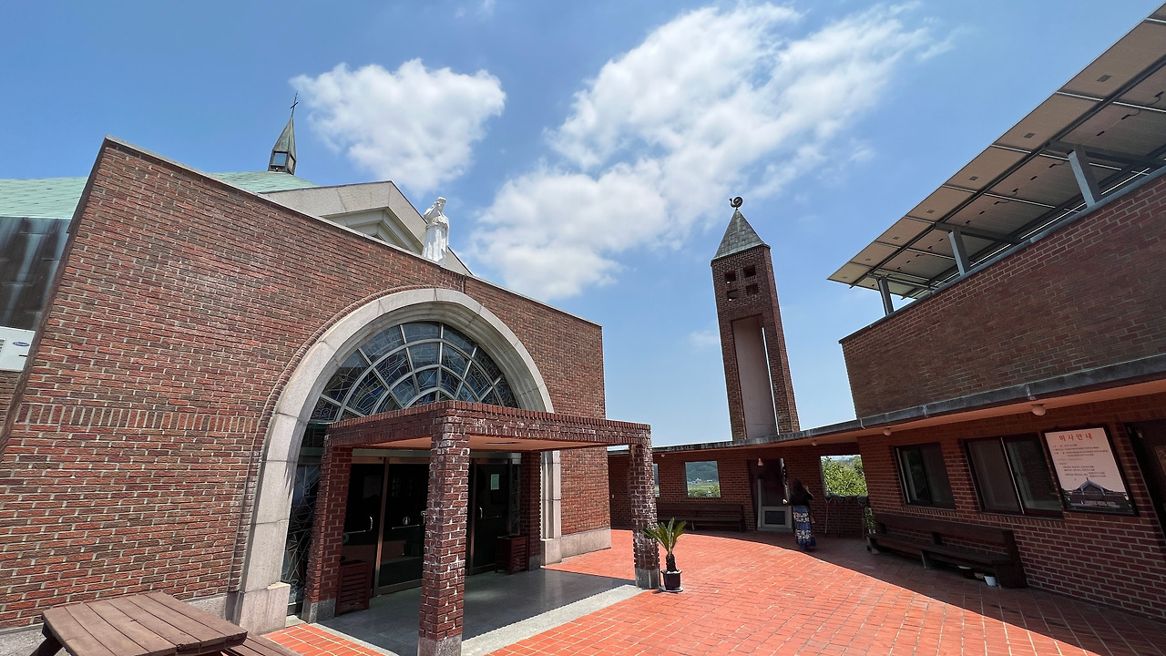 진교성당이 있는 진교리, 때이른 더위로 조금만 걸어도 땀이 비오듯 쏟아진다. 성당이 있는 아래쪽에 주차하고 위를 올려다 보니 성당의 모습이 보인다. 성당의 겉 모습은 소박하다. 높게 철탑을 올린 고딕풍의 성당은 아니지만 건축적으로 꽤나 세심한 정성을 기울여 지은 듯한 인상이다. 너른 앞마당과 시원한 그늘을 만들어내는 오래된 나무들이 방문자들을 처음 맞는다.