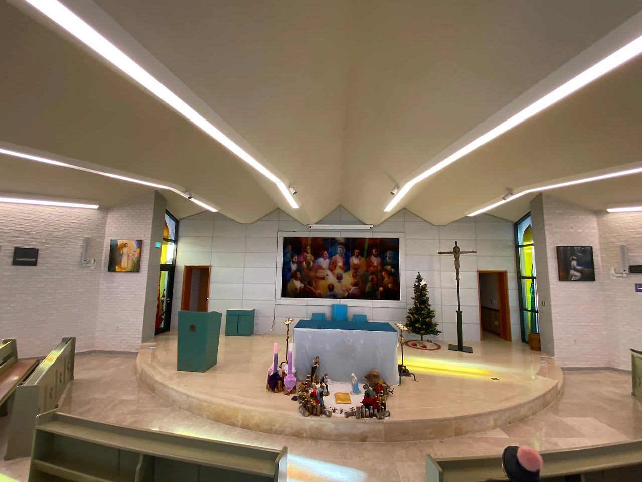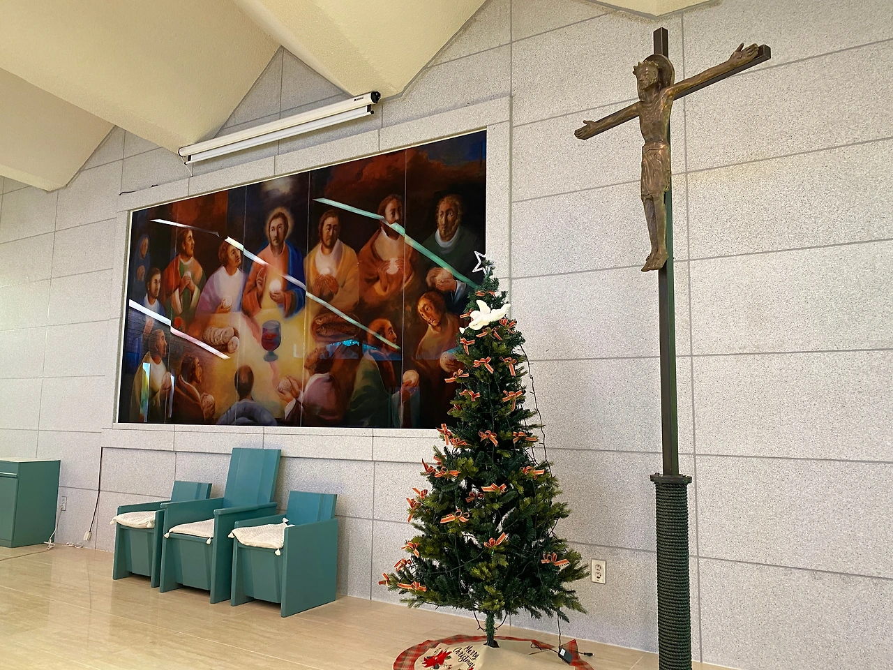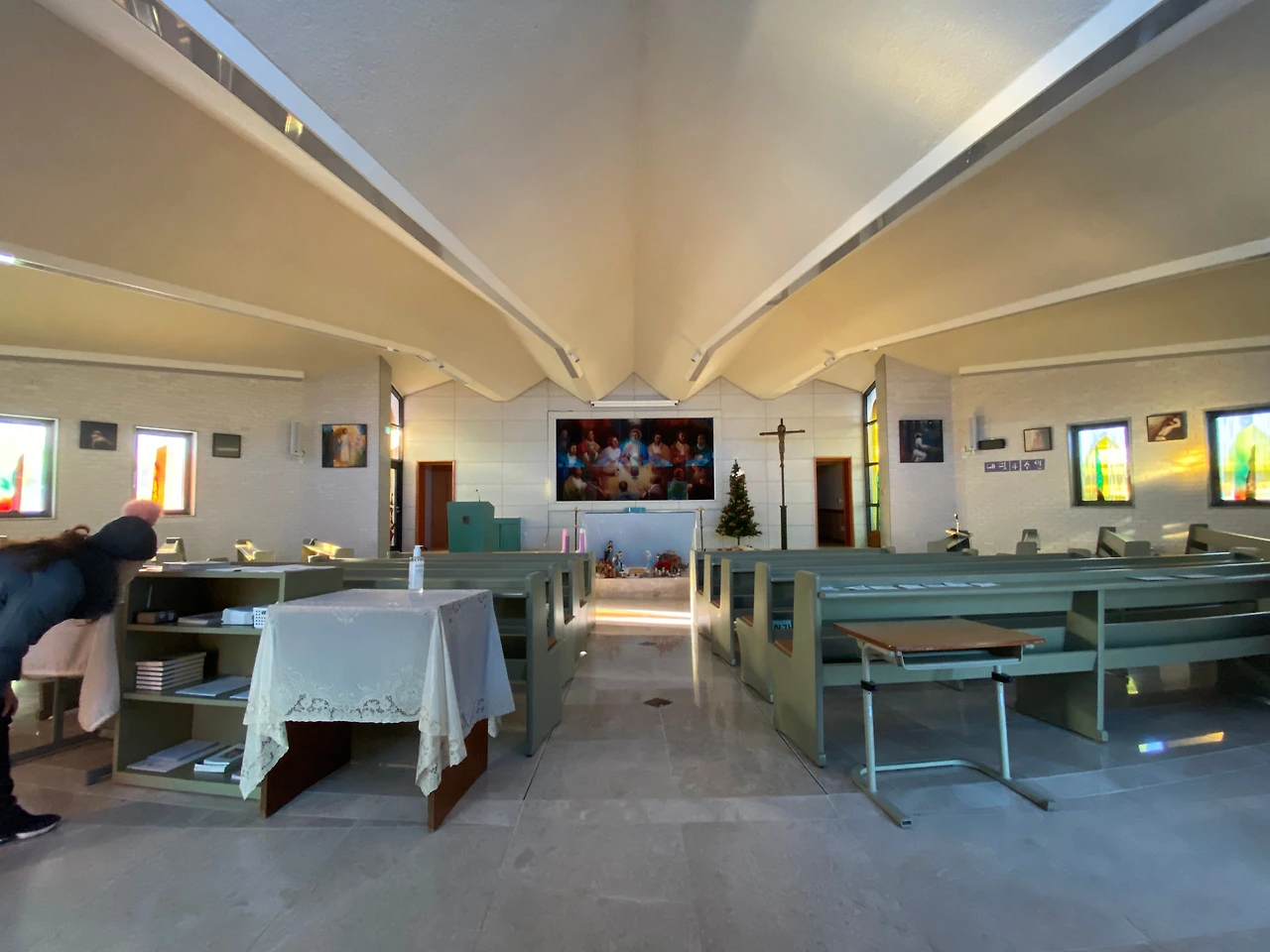 이 성당은 성인 성야고보의 상징인 조가비모양을 하고 있습니다. 정면에서 보면 조가비의 끝모양으로 삼각형의 지붕이 길게 제대쪽으로 향하고 있고 아름다운 스테인 글라스를 통해 들어온 햇빛이 찬란하게 성당안을 비추고 있습니다. 문의 손잡이도 조가비모양을 하고 있는데 그 모양이 너무나 이쁩니다. 설레임 가득 조가비 문을 열면 화사한 분위기의 작지만 환하고 밝은 성당의 아름다운 모습에 마음을 온전히 빼앗기게 됩니다. 먼저 제대 뒷쪽의 최후의 만찬 유리채색화가 보입니다. 제대 양쪽의 예수부활과 겟세마네 기도의 유리채색화도 아름답습니다. 이 작품은 14처의 작품과 함께 변진의 화백의 작품이라고 합니다. 변진의 화백은 수원대 교수로 올해 82세의 노작가 입니다. 가톨릭 주교회의에서 수여하는 가톨릭 미술상 수여자로 유리채색화 부문에서는 상당히 권위가 있는 작가라 합니다. 이처럼 성당안의 아름다운 그림들이 성당안을 환하게 밝혀주어 마치 천국의 어느 한 곳에 와있는 것 같은 신비로운 느낌이 들기도 합니다. 또한 성당의 스테인 글라스는 조광호(인천가톨릭대 조형예술대학 명예교수) 신부가 성당 스테인드글라스 제작에 참여하였다고 합니다 성당의 크기는 자그마하지만 예술작품을 소장한 갤러리 같기도 합니다.