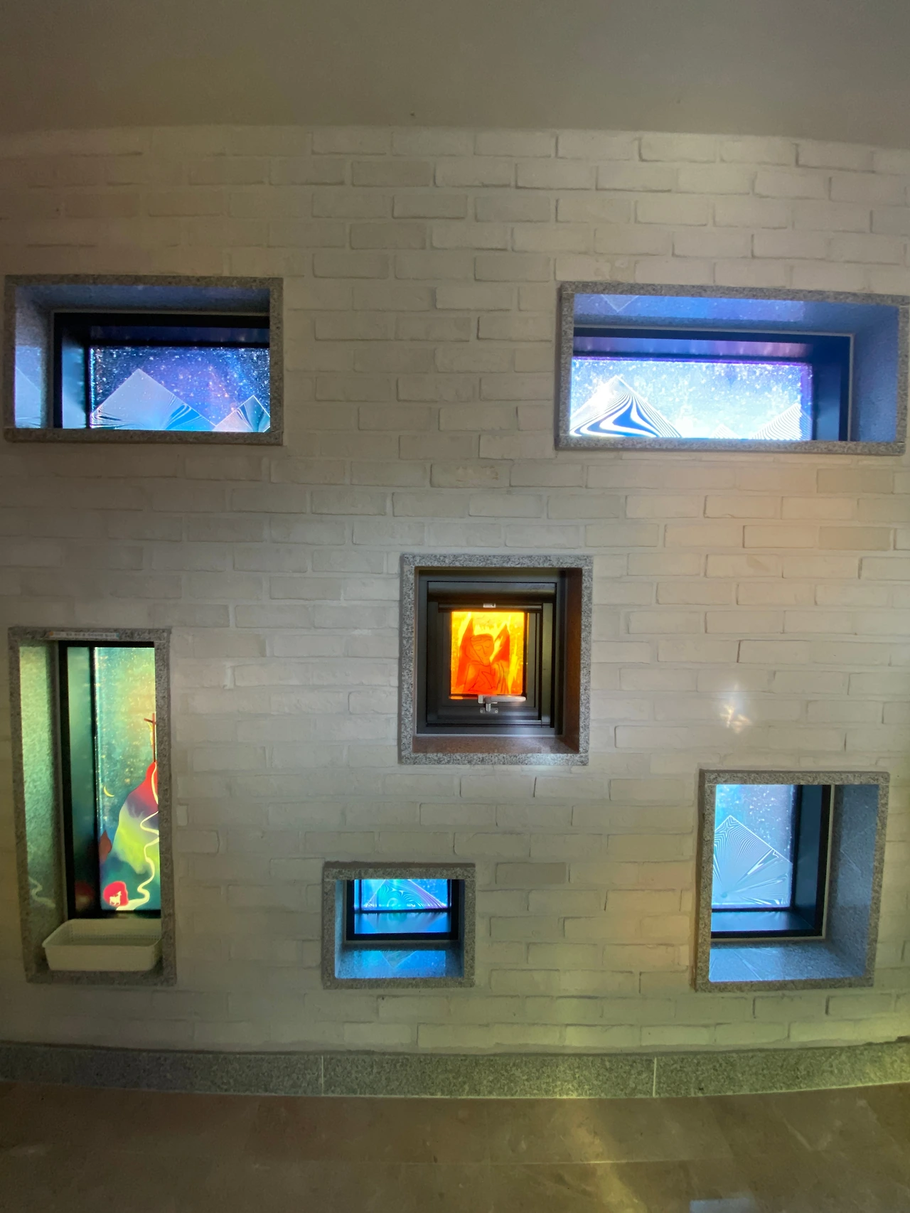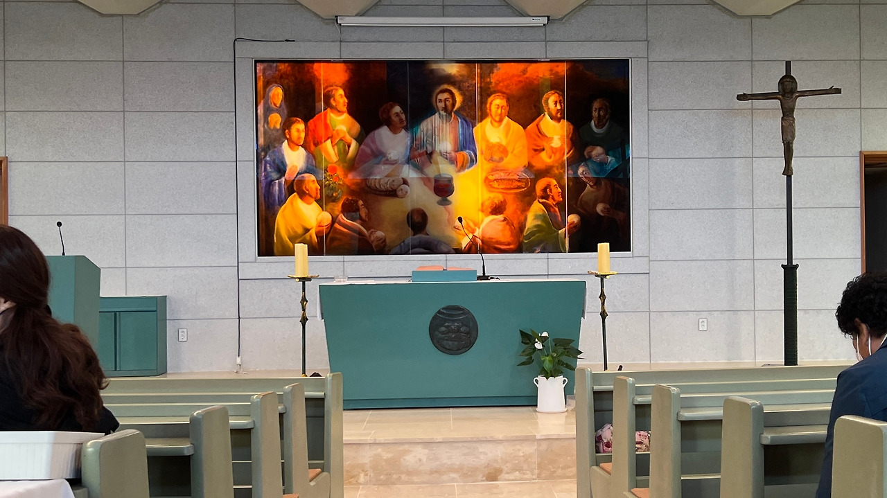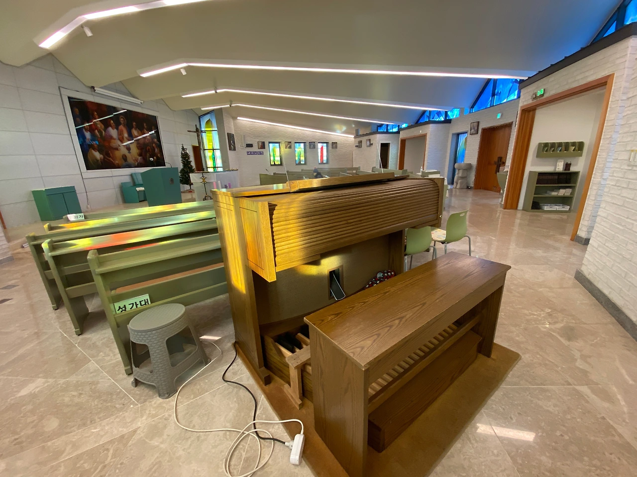 이 성당은 성인 성야고보의 상징인 조가비모양을 하고 있습니다. 정면에서 보면 조가비의 끝모양으로 삼각형의 지붕이 길게 제대쪽으로 향하고 있고 아름다운 스테인 글라스를 통해 들어온 햇빛이 찬란하게 성당안을 비추고 있습니다. 문의 손잡이도 조가비모양을 하고 있는데 그 모양이 너무나 이쁩니다. 설레임 가득 조가비 문을 열면 화사한 분위기의 작지만 환하고 밝은 성당의 아름다운 모습에 마음을 온전히 빼앗기게 됩니다. 먼저 제대 뒷쪽의 최후의 만찬 유리채색화가 보입니다. 제대 양쪽의 예수부활과 겟세마네 기도의 유리채색화도 아름답습니다. 이 작품은 14처의 작품과 함께 변진의 화백의 작품이라고 합니다. 변진의 화백은 수원대 교수로 올해 82세의 노작가 입니다. 가톨릭 주교회의에서 수여하는 가톨릭 미술상 수여자로 유리채색화 부문에서는 상당히 권위가 있는 작가라 합니다. 이처럼 성당안의 아름다운 그림들이 성당안을 환하게 밝혀주어 마치 천국의 어느 한 곳에 와있는 것 같은 신비로운 느낌이 들기도 합니다. 또한 성당의 스테인 글라스는 조광호(인천가톨릭대 조형예술대학 명예교수) 신부가 성당 스테인드글라스 제작에 참여하였다고 합니다 성당의 크기는 자그마하지만 예술작품을 소장한 갤러리 같기도 합니다.