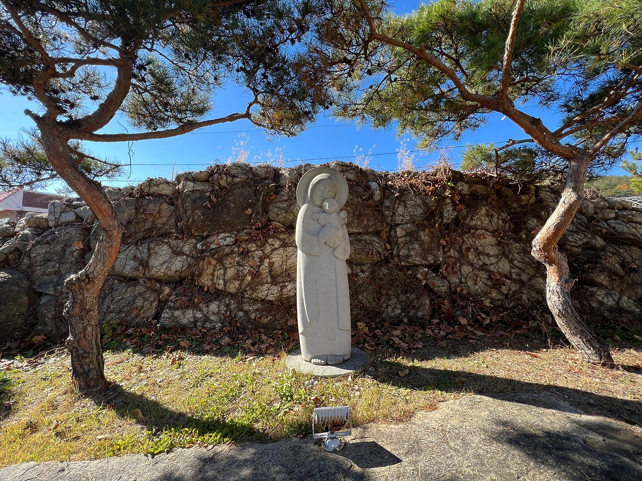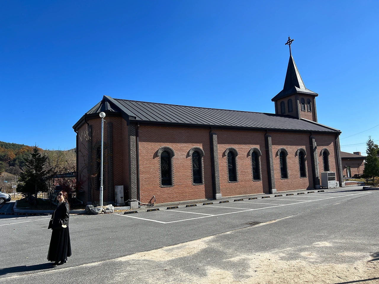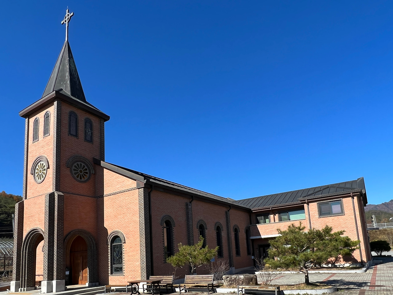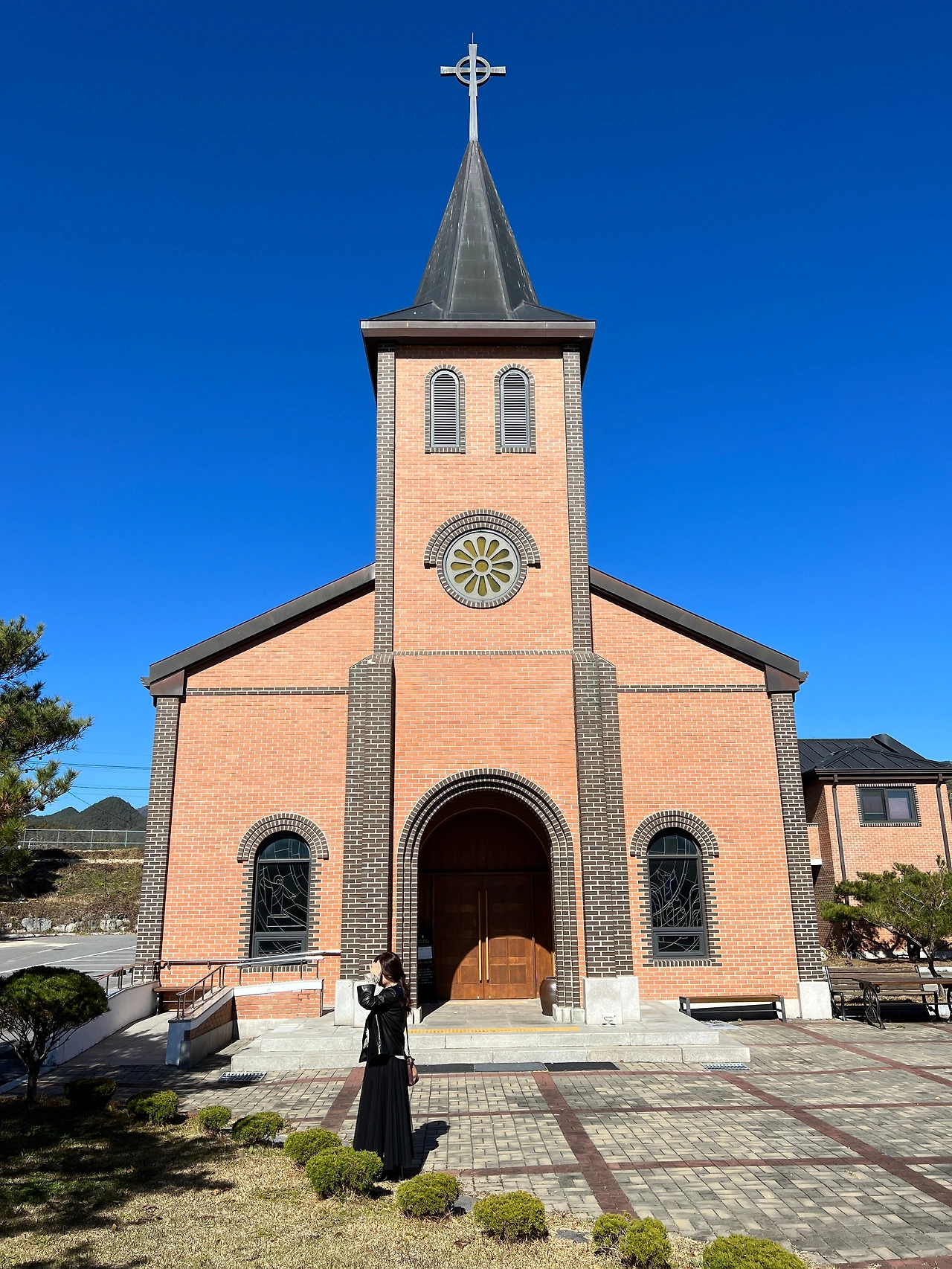 나무로 만든 묵직한 성당문을 열고 들어가 보니 스테인글라스를 통해 들어온 오묘한 빛들이 은은하게 성당 내부를 비춰주고 있습니다. 제대 양쪽엔 단아한 한복을 입고 머리에 쪽을 지은 성모상과 김대건 신부님의 상이 마음을 차분하게 가라앉혀줍니다. 둥근 아치로 창을 내었는데 둥근 아치는 마치 웃고 있는 눈썹 모양이라 부드러운 인상을 줍니다. 아무도 없는 아름다운 시골 성당은 곧바로 나만의 기도처가 됩니다. 빈 공간을 하느님의 음성으로 가득 채우듯 여행에 들뜬 마음을 따뜻하게 눌러줍니다. 일대일로 대면하여, 대화하듯 기도하는 경건한 장소. 하늘엔 구름 한 점 없는 맑고 청명한 하늘. 그 눈 시린 가을 하늘 밑에 세워진 아름다운 성당의 모습이 평온한 천국의 한 자락 같다는 느낌이었습니다.