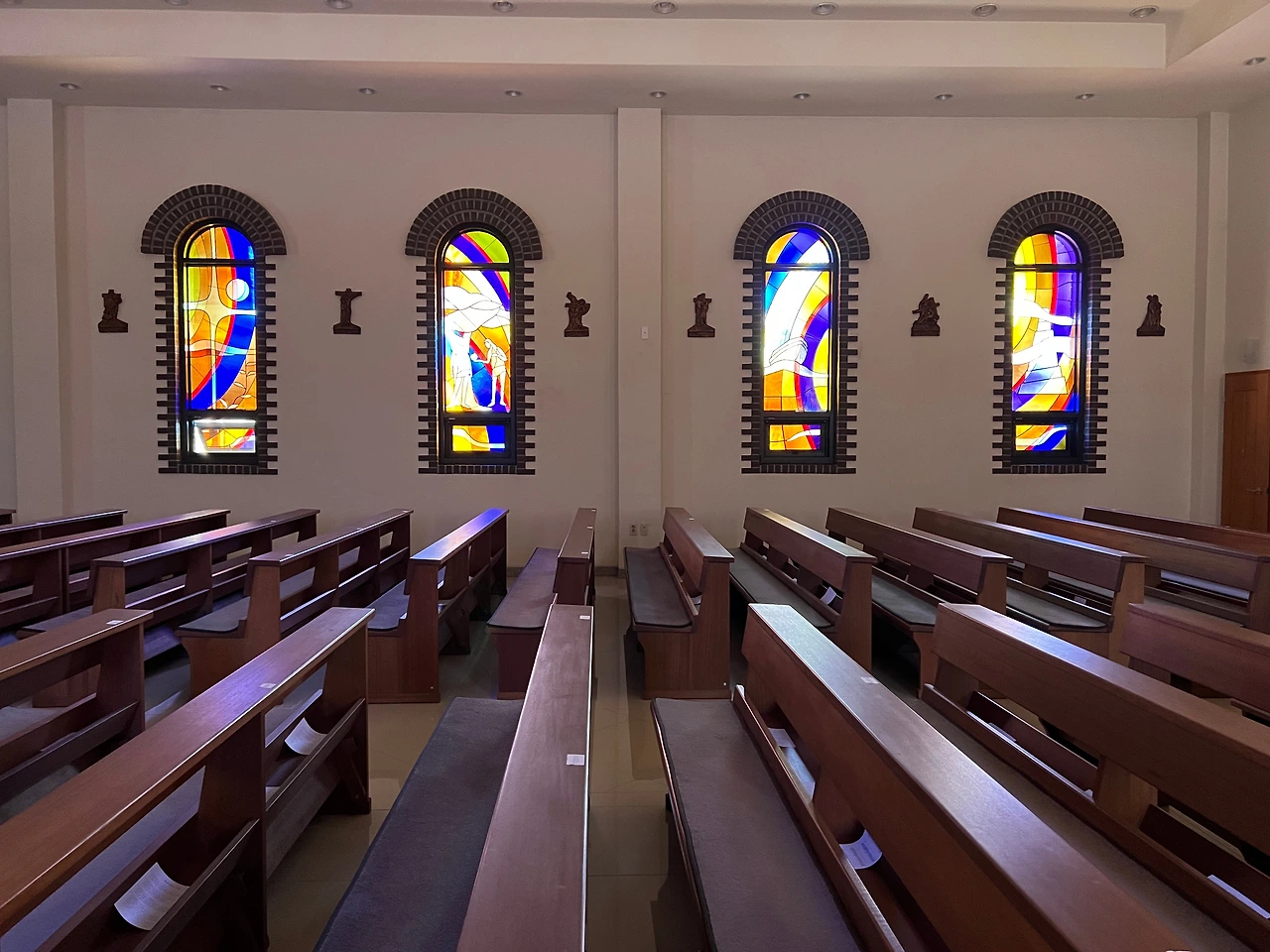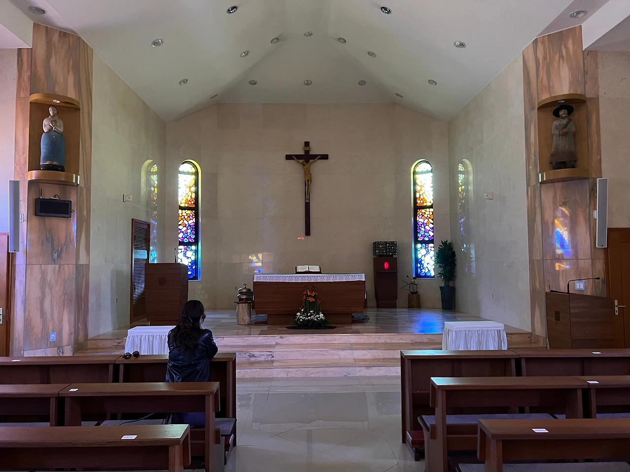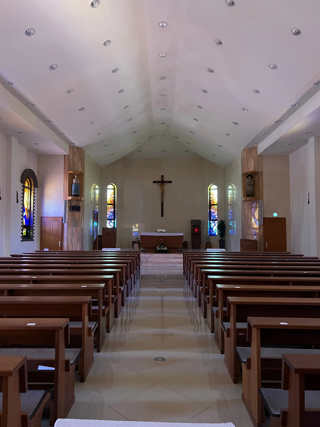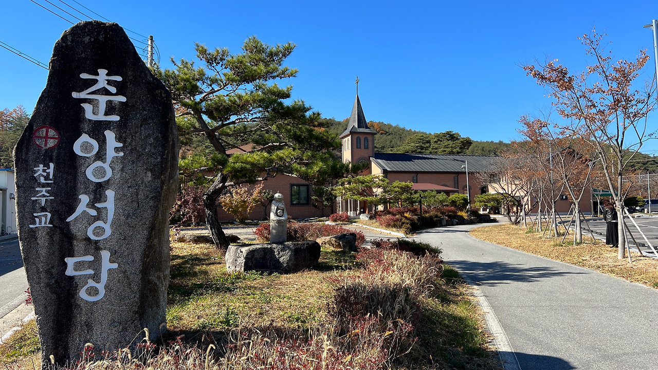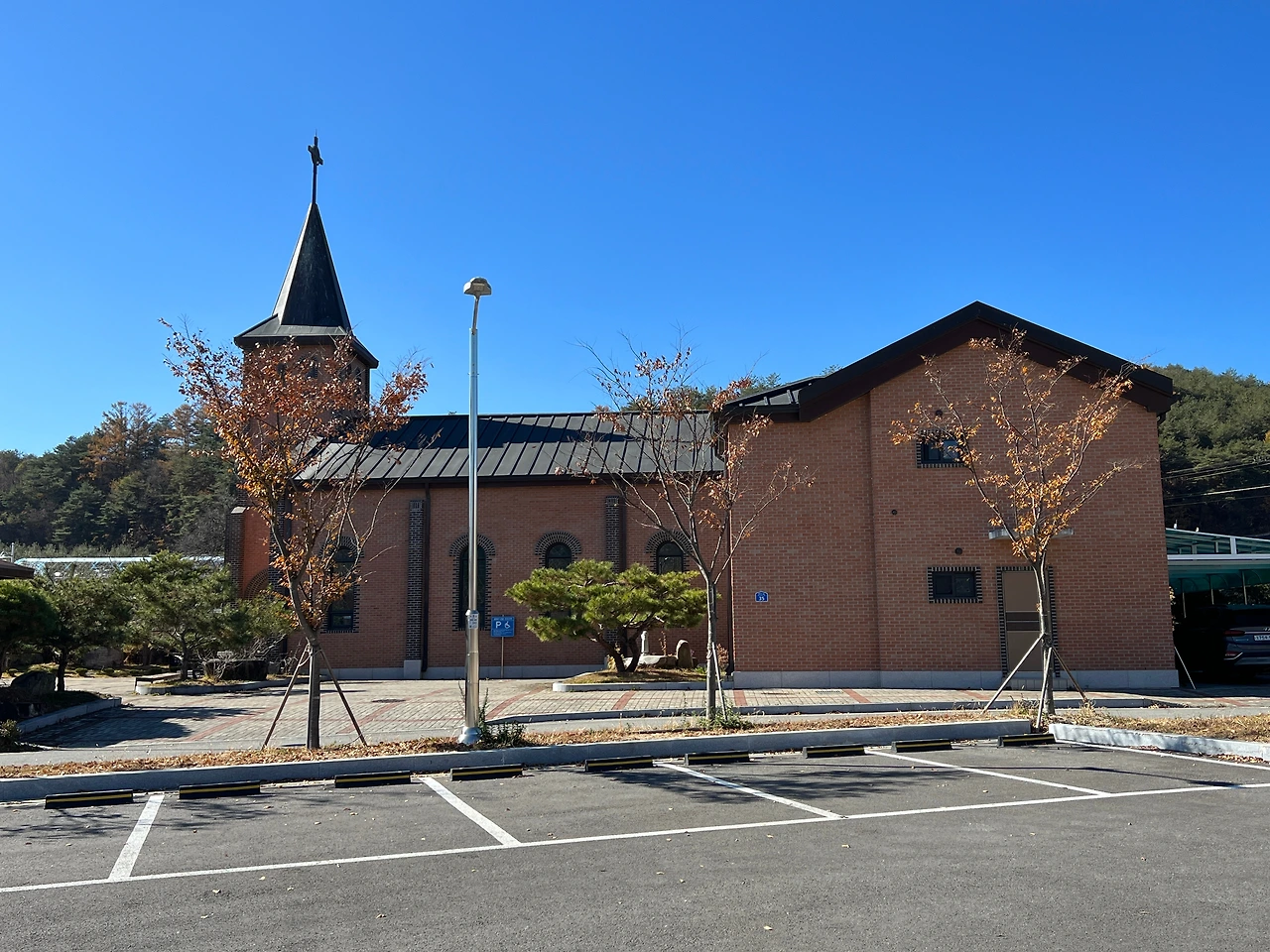 나무로 만든 묵직한 성당문을 열고 들어가 보니 스테인글라스를 통해 들어온 오묘한 빛들이 은은하게 성당 내부를 비춰주고 있습니다. 제대 양쪽엔 단아한 한복을 입고 머리에 쪽을 지은 성모상과 김대건 신부님의 상이 마음을 차분하게 가라앉혀줍니다. 둥근 아치로 창을 내었는데 둥근 아치는 마치 웃고 있는 눈썹 모양이라 부드러운 인상을 줍니다. 아무도 없는 아름다운 시골 성당은 곧바로 나만의 기도처가 됩니다. 빈 공간을 하느님의 음성으로 가득 채우듯 여행에 들뜬 마음을 따뜻하게 눌러줍니다. 일대일로 대면하여, 대화하듯 기도하는 경건한 장소. 하늘엔 구름 한 점 없는 맑고 청명한 하늘. 그 눈 시린 가을 하늘 밑에 세워진 아름다운 성당의 모습이 평온한 천국의 한 자락 같다는 느낌이었습니다.