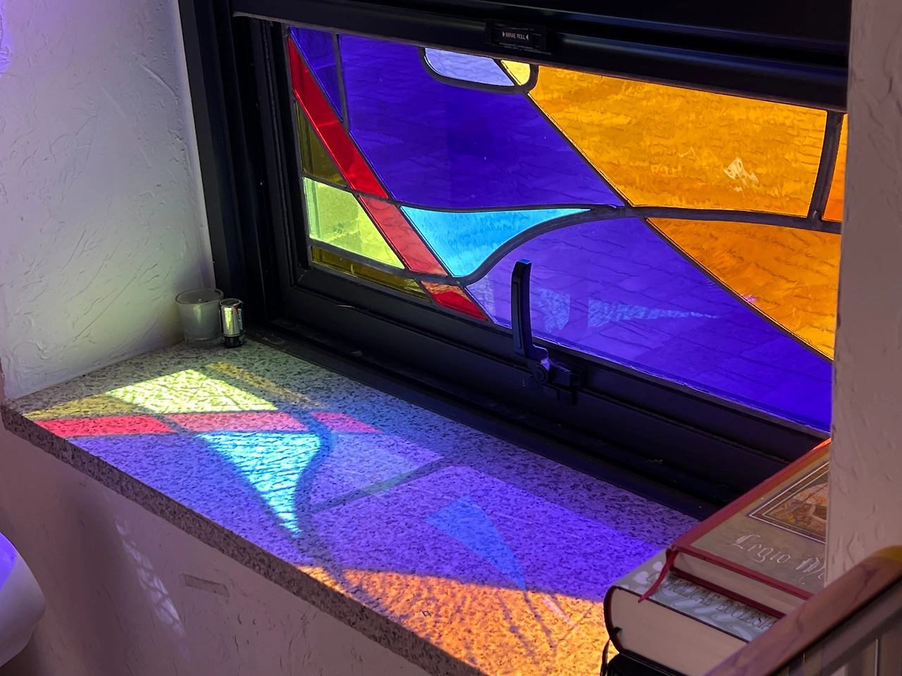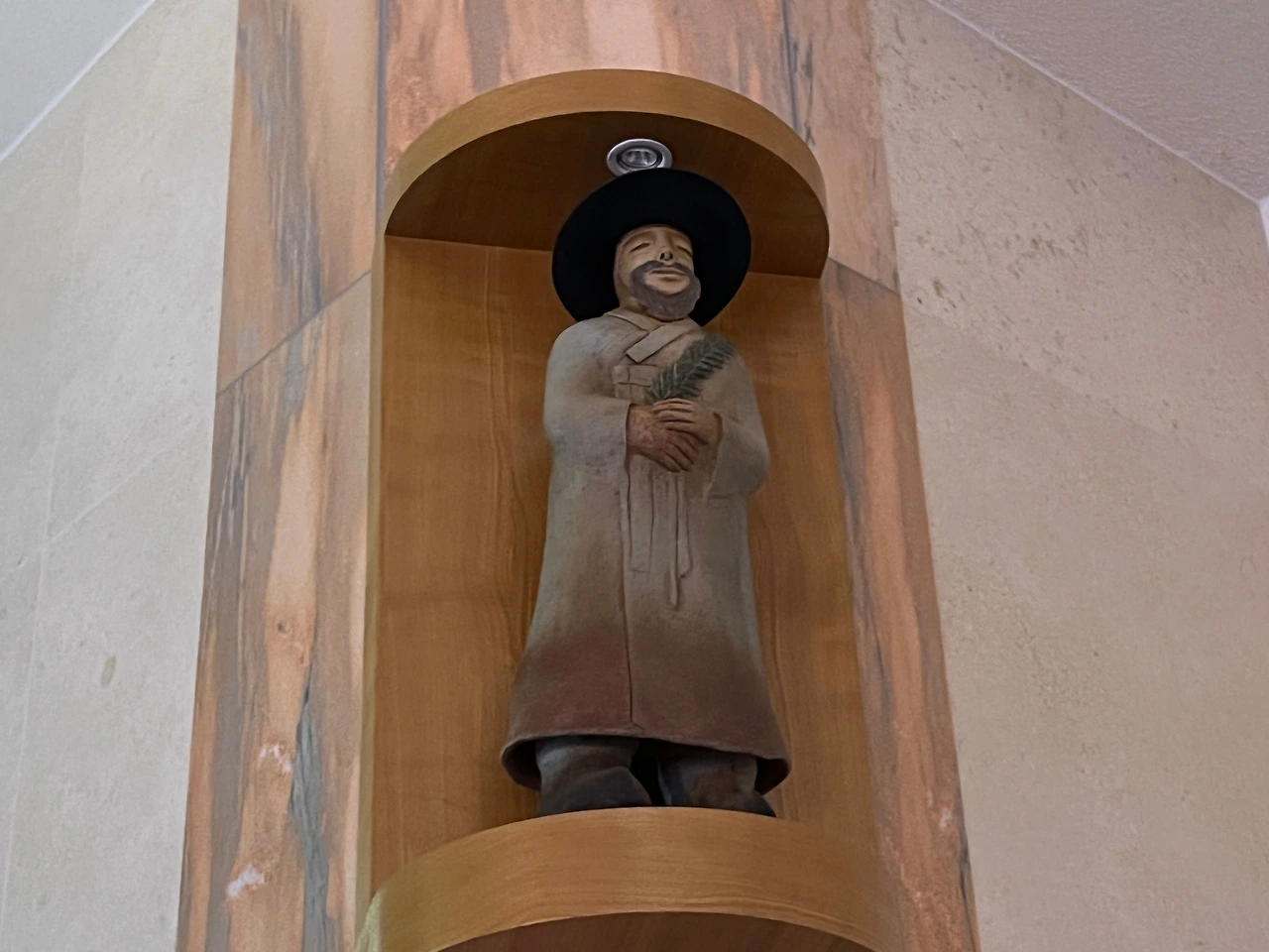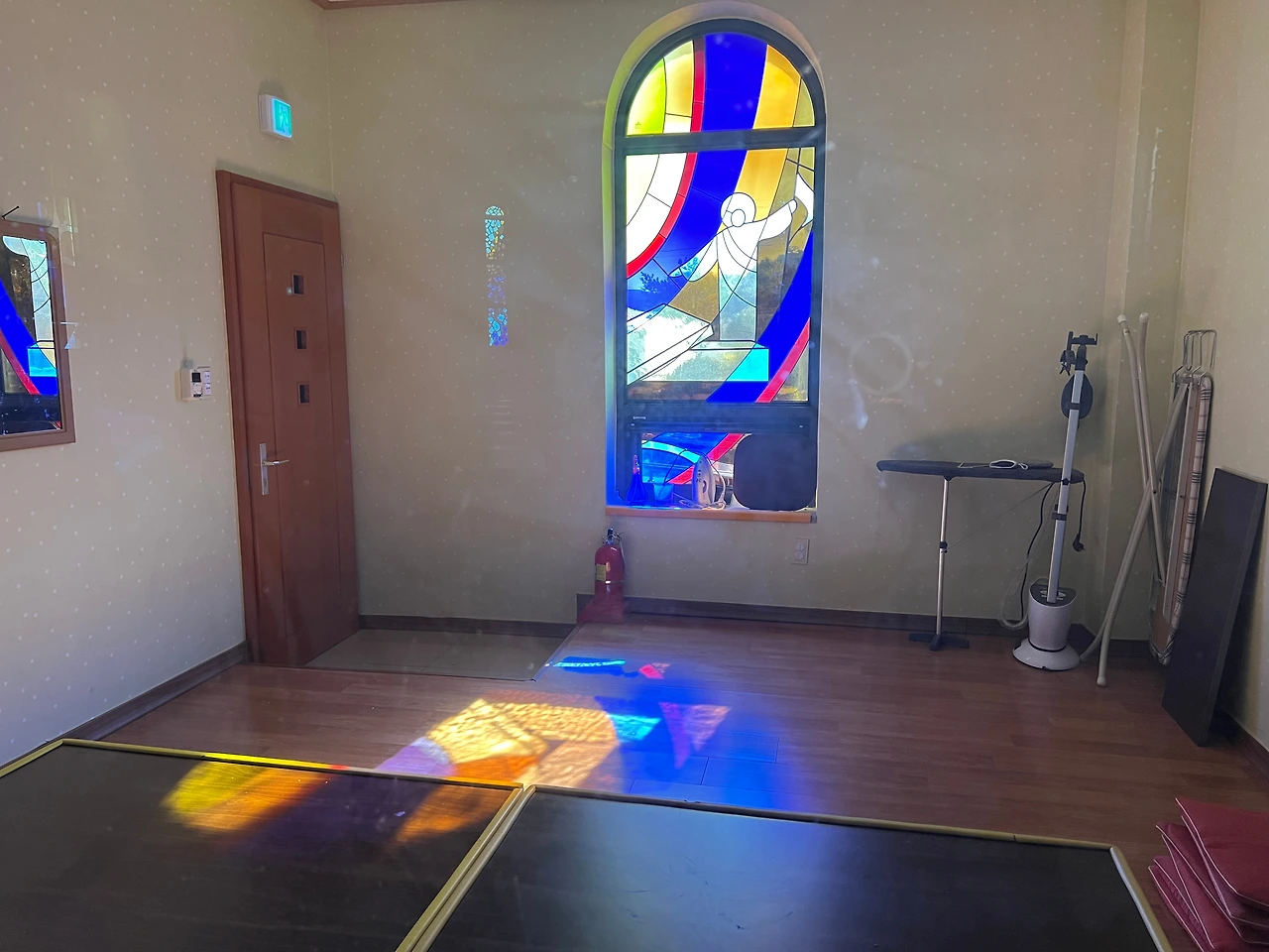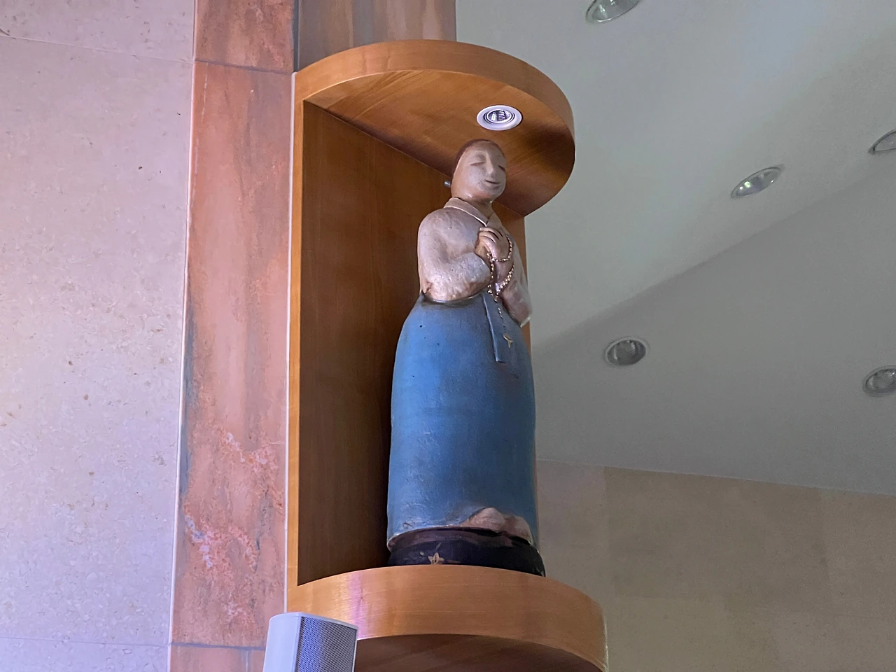 나무로 만든 묵직한 성당문을 열고 들어가 보니 스테인글라스를 통해 들어온 오묘한 빛들이 은은하게 성당 내부를 비춰주고 있습니다. 제대 양쪽엔 단아한 한복을 입고 머리에 쪽을 지은 성모상과 김대건 신부님의 상이 마음을 차분하게 가라앉혀줍니다. 둥근 아치로 창을 내었는데 둥근 아치는 마치 웃고 있는 눈썹 모양이라 부드러운 인상을 줍니다. 아무도 없는 아름다운 시골 성당은 곧바로 나만의 기도처가 됩니다. 빈 공간을 하느님의 음성으로 가득 채우듯 여행에 들뜬 마음을 따뜻하게 눌러줍니다. 일대일로 대면하여, 대화하듯 기도하는 경건한 장소. 하늘엔 구름 한 점 없는 맑고 청명한 하늘. 그 눈 시린 가을 하늘 밑에 세워진 아름다운 성당의 모습이 평온한 천국의 한 자락 같다는 느낌이었습니다.