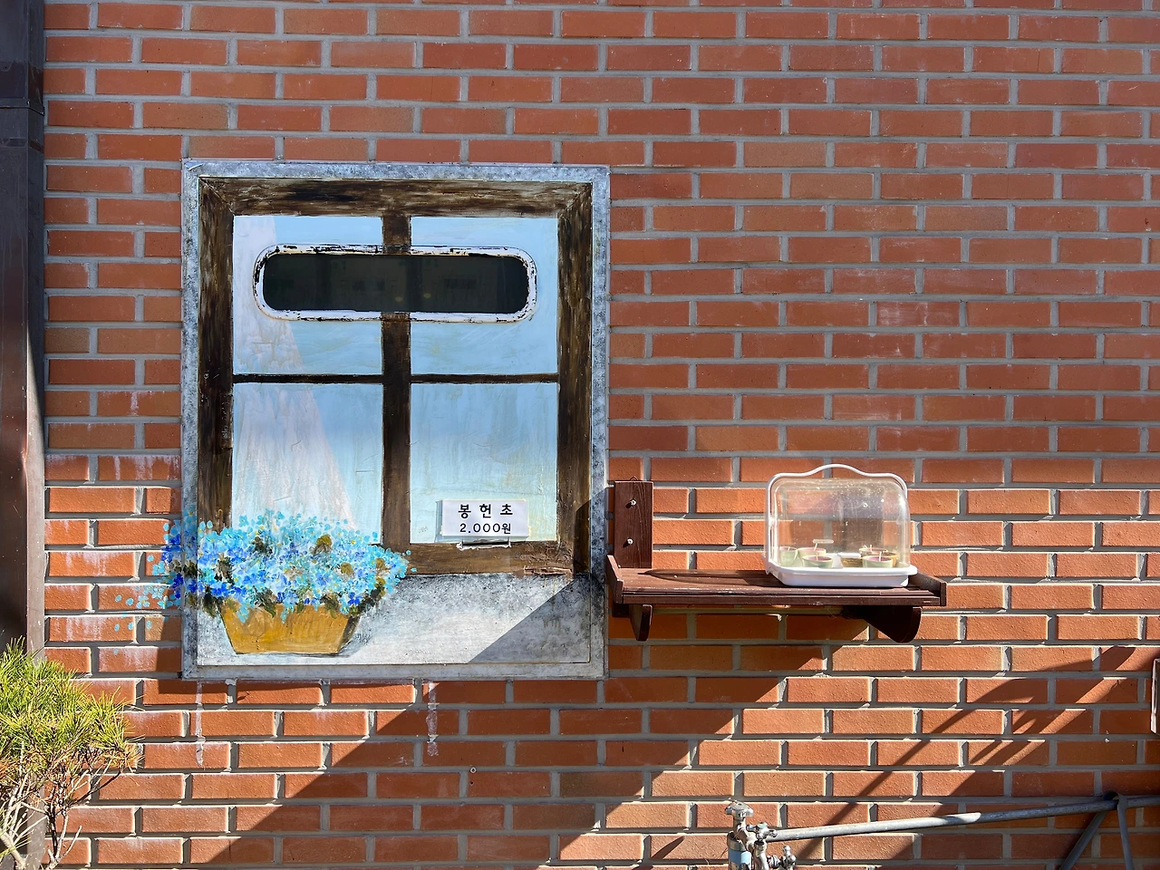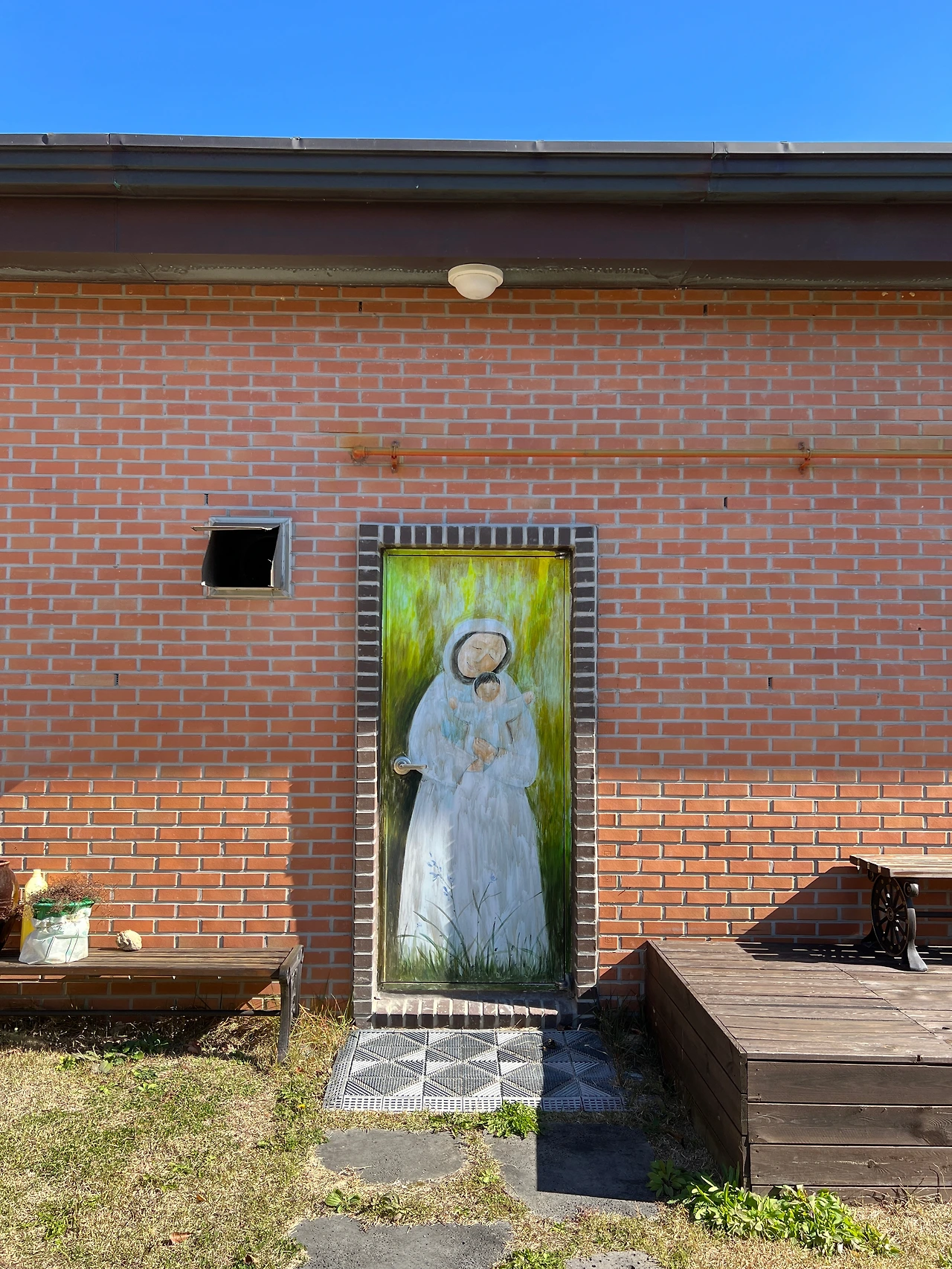 시골의 성당들은 대부분 대지가 넓습니다. 춘양성당도 탁 트인 공간에 성당의 앞뒤 주변이 마치 공원처럼 잘 조경이 되어 있어 성당 주위를 산책하는 맘으로 한 바퀴 돌아보았습니다. 성모상이 있는 곳도 잘 조성되어있고 성당 사무실로 쓰이는 뒤편의 화장실 문에는 아름다운 성모상이 그려져 있었습니다. 봉헌 초가 담긴 봉헌초 보관함 옆에도 십자가를 그린 이쁜 그림. 누가 그렸는지는 모르겠으나 예사 솜씨가 아니었습니다. 붉은 벽돌에 그려진 그림은 주위를 화사하게 만들어 주었습니다. 군데군데 놓인 벤치와 소나무들. 춘양 성당은 그렇게 우연히 오게 된 순례자의 발길을 기분 좋게 만들어 주었습니다.