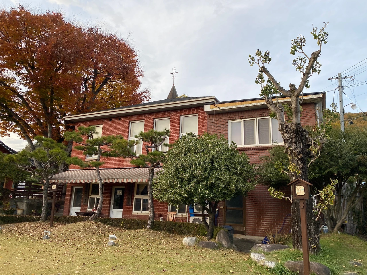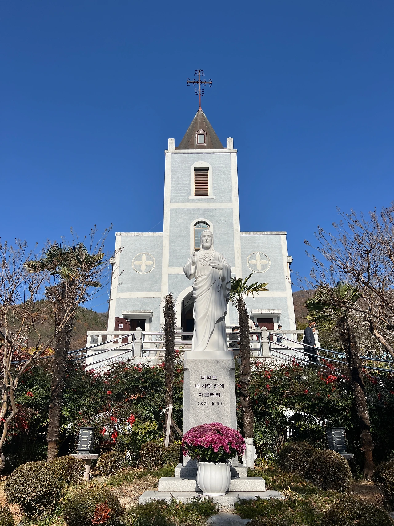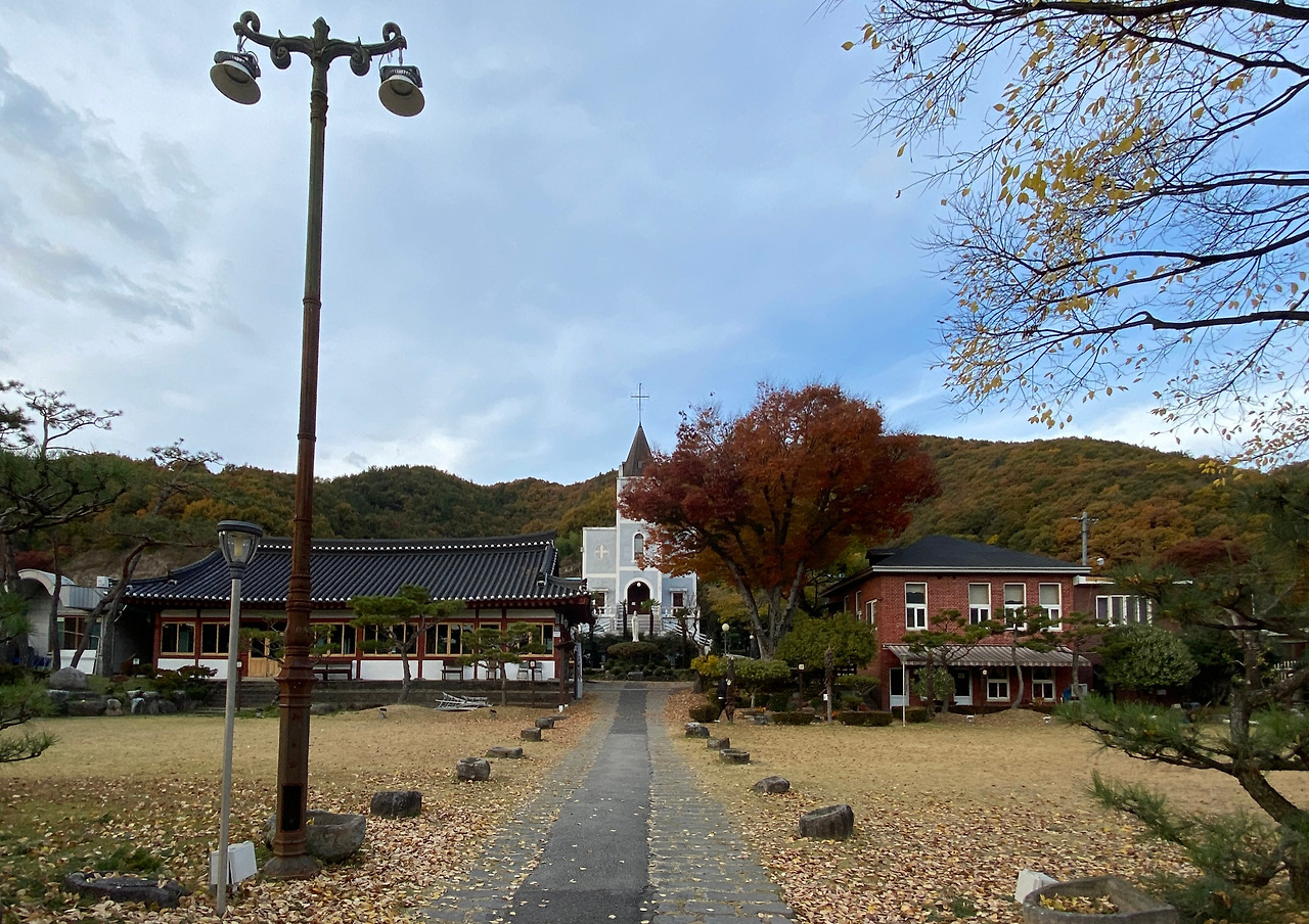 문산성당은 입구부터 잘 정돈되어 마치 문화재가 있는 공공시설 같아 보이기도 합니다. 가운데로 소담하게 길이 나있고 왼쪽엔 한옥성당이 오른쪽엔 사제관이 있습니다. 길의 끝에는 고딕풍의 옅은 청회색의 성당이 보입니다. 성당 뒤로 보이는 야트막한 산들도 오래된 성당과 함께 아름다운 그림을 그리고 있었습니다. 아름다운 성당의 모습을 진주를 방문한 많은 분들이 사진에 담아가기도 합니다. 한적한 분위기 속 이국적인 모습의 서양식 성당과 흔히 볼 수 없는 한옥성당의 단아한 기품이 아마도 많은 방문객들을 부르고 있는 듯합니다.