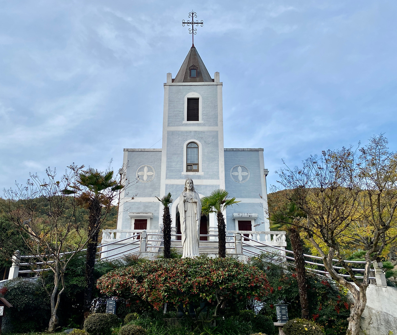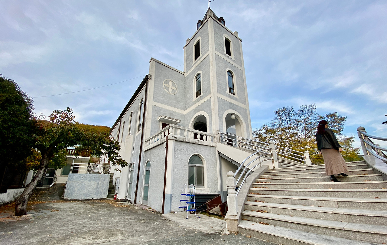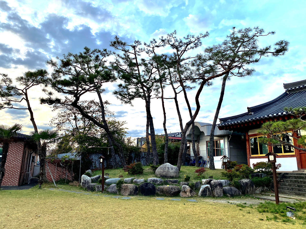문산성당은 입구부터 잘 정돈되어 마치 문화재가 있는 공공시설 같아 보이기도 합니다. 가운데로 소담하게 길이 나있고 왼쪽엔 한옥성당이 오른쪽엔 사제관이 있습니다. 길의 끝에는 고딕풍의 옅은 청회색의 성당이 보입니다. 성당 뒤로 보이는 야트막한 산들도 오래된 성당과 함께 아름다운 그림을 그리고 있었습니다. 아름다운 성당의 모습을 진주를 방문한 많은 분들이 사진에 담아가기도 합니다. 한적한 분위기 속 이국적인 모습의 서양식 성당과 흔히 볼 수 없는 한옥성당의 단아한 기품이 아마도 많은 방문객들을 부르고 있는 듯합니다.