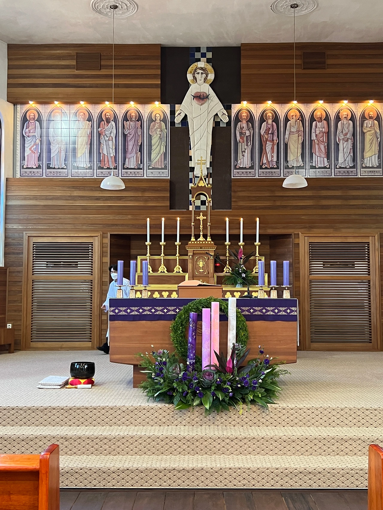 성당의 제대 뒤쪽에는 예수님을 중앙으로 12사도들이 한분씩 세로로 길게 전신상으로 장식되어있습니다. 이 또한 성당에서는 흔하게 볼 수 없는 특이한 모습이었습니다. 제대는 2009년 12월 27일 성당 내에 제2차 바티칸 공의회 이전의 옛 제대를 복원하여 축복식을 가졌다고합니다. 새 제대는 벽을 향해 미사를 봉헌하던 당시 제대를 본래대로 복구한 것으로 현재 감실 제대로 사용하고 있습니다. 회중석은 이랑식으로 장방형으로 제대를 향해 길죽하게 놓여 있습니다.