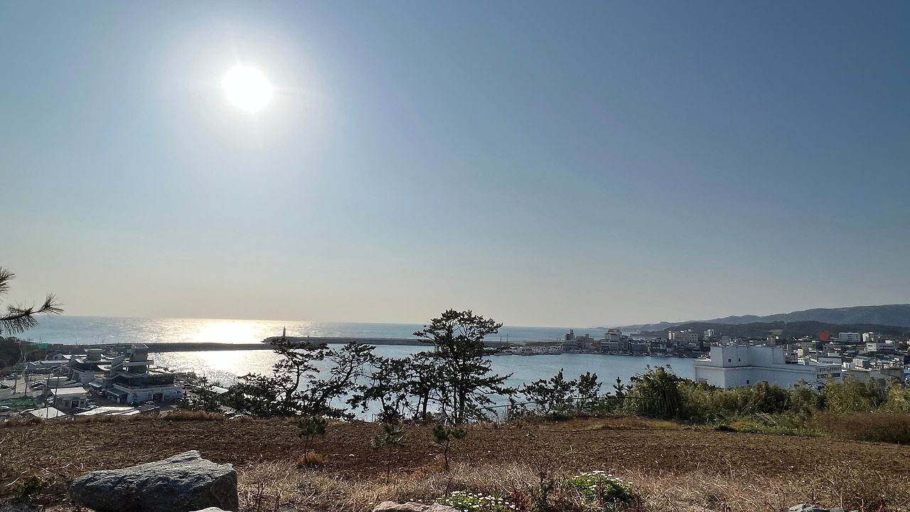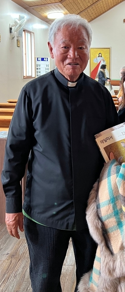 12월 갑자기 추워진 날씨 탓에 감포로 나서는 아침 공기가 차가워 옷깃을 더 여밉니다. 다행히 하늘은 맑아 저녁뉴스의 비 소식을 반신반의하며 출발합니다. 10시경 도착한 널찍한 감포공소 앞마당. 양남 성당처럼 동해바다가 한눈에 보이고 감포항이 시린 하늘 아래 그림처럼 놓여 있습니다. 주차된 차가 몇 대 있어서 벌써 신자분들이 오셨구나 했는데 성당 안에는 아무도 없습니다. 성모동산과 바다를 보고 싶어 밖으로 나오니 나이 드신 사제 한분이 저희를 반갑게 맞아주었습니다. 허연구 모이세 신부님입니다. 허 모이세 신부님은 89세의 은퇴한 노사제로 2021년부터 감포공소를 맡아 직접 미사를 집전하시고 지역 가톨릭 활성화에 크게 애쓰시는 분이십니다.