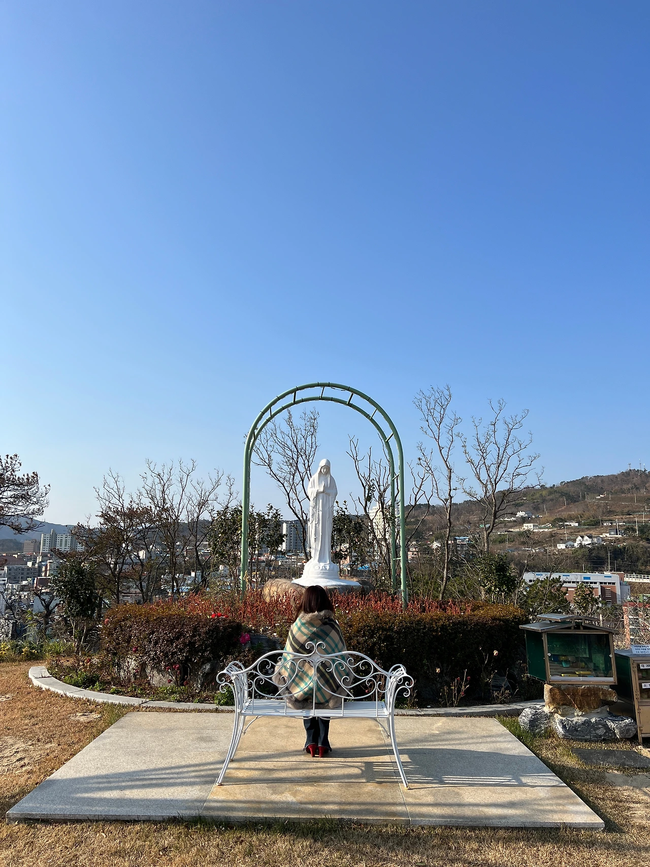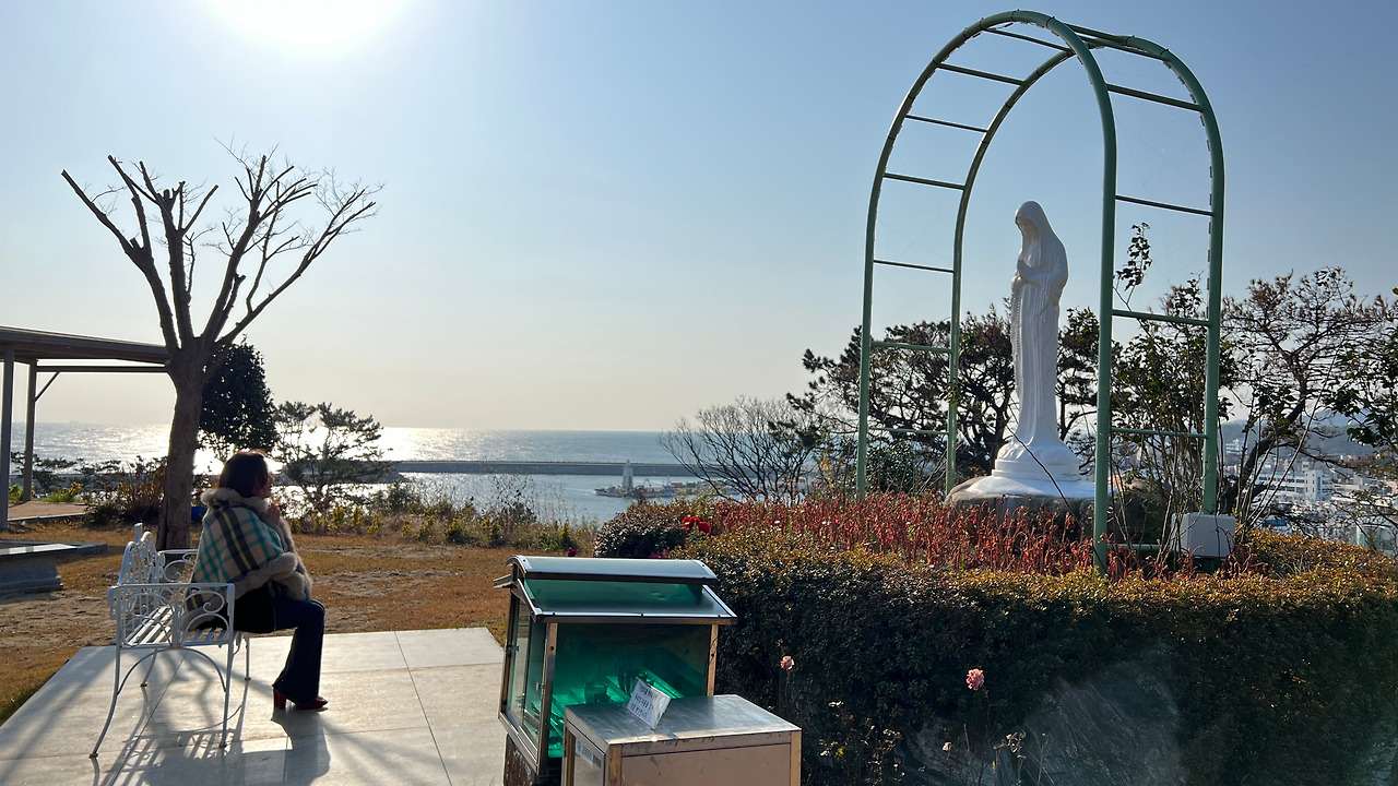 마당 한쪽엔 바다를 품은 성모동산이 있습니다. 하늘과 바다를 등에 지고 두 손을 살포시 모은 성모님의 상이 서로 배색이 되어 하늘에 떠있는 듯합니다. 겨울 초입이라 아름다운 꽃 장식은 없지만 봄엔 이 동산에 수많은 꽃들이 만발할 것을 상상하니 더욱 아름답게 느껴졌습니다. 바로 앞엔 의자도 있어서 자연 속에 기도처가 되어 간구하는 모든 기도제목들이 다 이루어질 듯한 믿음이 절로 생길 듯합니다.