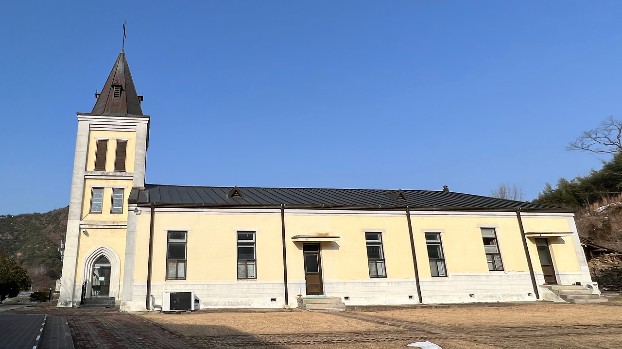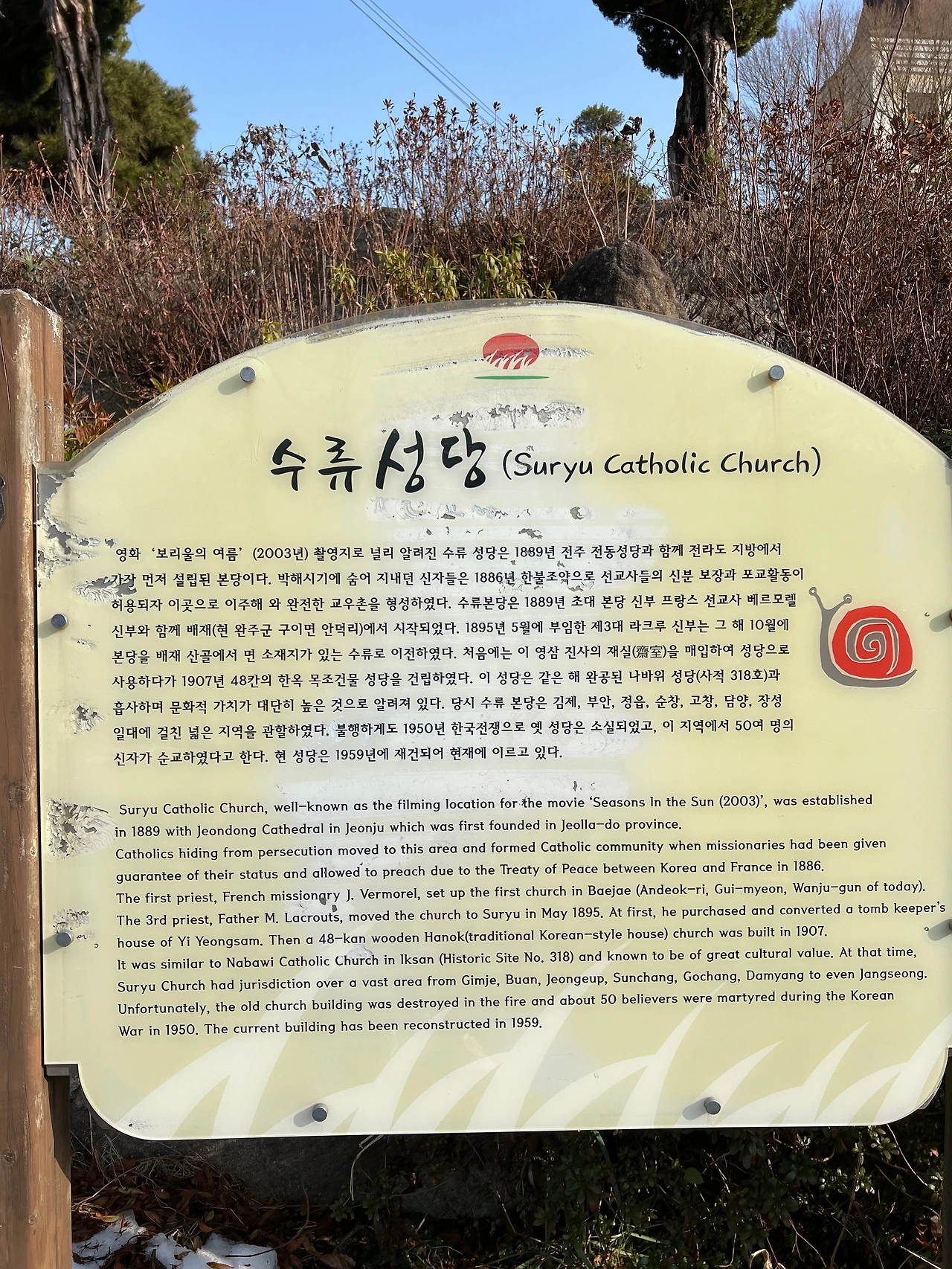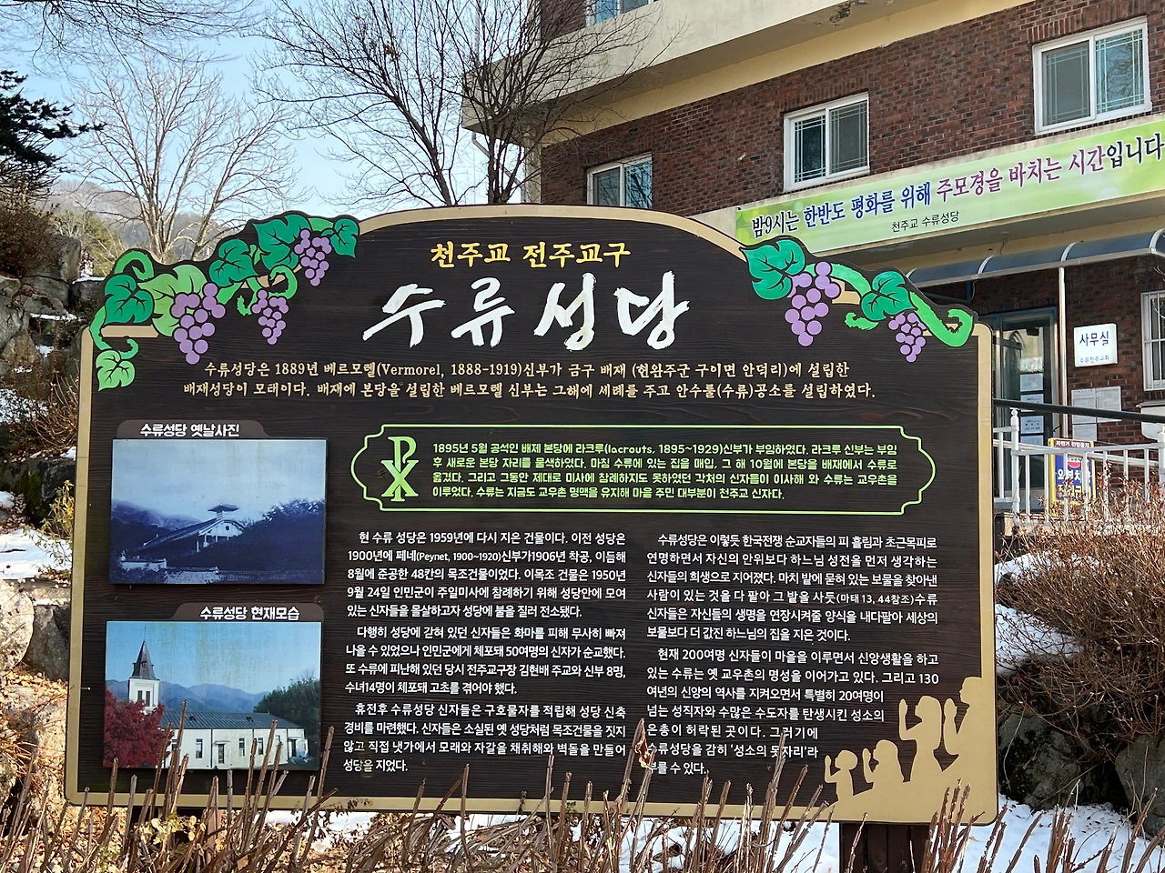 1월경 전날 내린 눈이 아직 녹지않고 군데군데 하얀 꽃처럼 마당에 남아있었습니다. 차갑게 시린 하늘은 파란물이 쏟아질 것처럼 청명하게 떠있습니다. 전북 김제시 금산면 화율리 223번지에 위치한 수류성당은 드넓은 평야와는 조금 떨어진 약간은 오지에 위치합니다. 그도 그럴 것이 화율리는 박해를 피해 이주해온 가톨릭 신자들의 교우촌이 그 모태이기 때문입니다. 1895년 배재 본당에서 이 곳 수류리로 이전하여 수류본당으로 승격하였으니 수류성당의 역사는 지금으로부터 130년 가량이나 거슬러 올라갑니다. 1887년 한불 수호통상 조약으로 박해가 종식되고 비교적 선교가 자유롭게 이루어지던 때였으니 숨어살던 이 지역의 신자들에겐 무엇보다도 성전이 필요했을 것입니다. 마침내 1901년 10월 드망주주교님의 주례로 성당을 봉헌하였다고 합니다. 이 곳 수류리의 수류성당은 처음엔 목조로 지어진 성당이었습니다. 수류성당의 입구쪽에 있는 안내판에는 당시의 성당사진이 있었습니다. 입구쪽에는 목조로 올린 종탑이 아주 격조있게 마을을 내려다 보고 있었습니다.