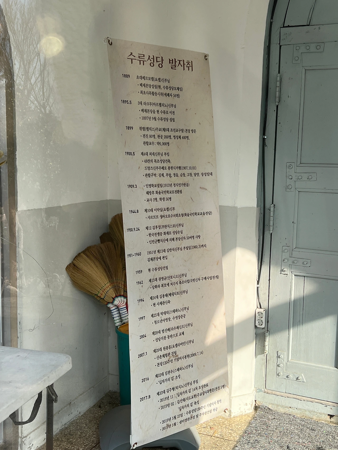 현재의 성당은 1959년에 새로 지어진 성당입니다. 처음 수류성당을 마주하고 너무도 소박하고 단순한 모습에 건축학적으로는 조금 아쉬운 부분이 있었지만 그속에 담겨진 의미를 알고는 그 아름다움을 미처 깨닫지 못한 것이 부끄러웠습니다. 수류성당은 일제말기 인근의 400세대가 모두 신자가 될 만큼 신심이 깊은 곳이었습니다. 하지만 1950년에 발발한 한국전쟁 때 북한군이 신자들을 몰살하고자 미사중에 지른 화재로 목조건물은 전소되었고 화재를 피해 빠져나온 신자 50명이 공산군에 잡혀 순교하였다고 합니다. 수류성당은 이로부터 9년 후인 1959년 먹을 것이 모자라 겨우 연명할 수 있음에도 구호물자를 적립해 건축기금을 모으고 냇가에 가서 직접 모래와 자갈을 날라다 손수 벽돌을 만들어 성당을 건축하였다고 합니다.