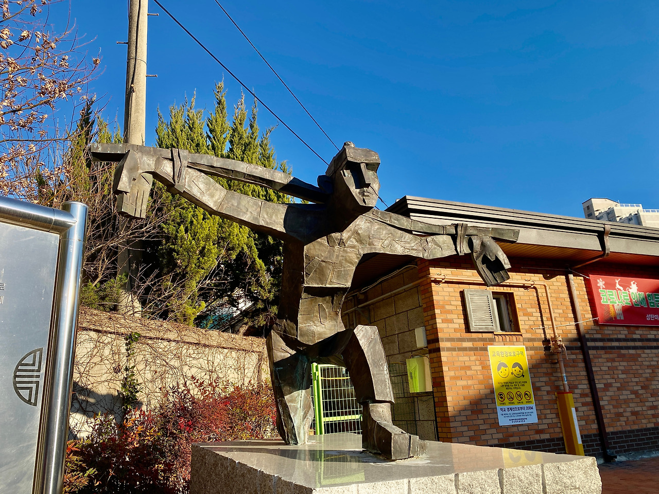 현풍성당의 팔각형 외부의 모습은 주보성인이신 김대건 안드레아 신부님의 갓모양을 형상화 한 것이라고 합니다. 입구에 있는 김대건 신부님의 상 또한 독특한데 일반적으로 김대건 신부님의 상은 갓을 쓰고 한복을 입은 모습인데 반해 현풍성당은 십자가를 진 김대건 신부님의 모습으로 서있습니다. 단순화해서 묘사한 조각이지만 앞으로 나아가는듯한 자세와 강인한 얼굴에서 신부님의 굳은 의지가 느껴지기도 합니다.