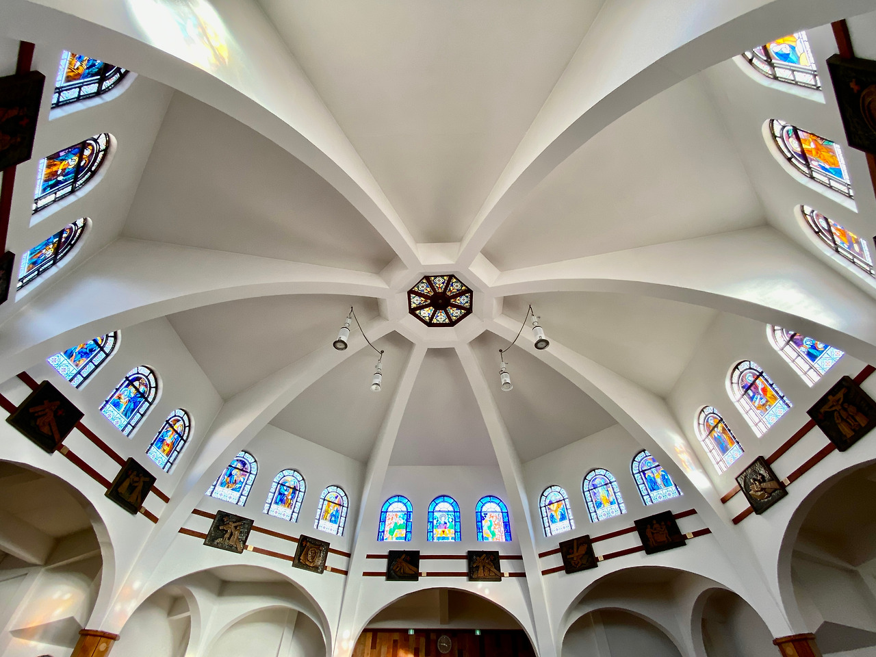 현풍성당은 밝고 화사한 성당의 외형도 아름답지만 내부의 모습 또한 돔형태의 팔각형으로 지붕의 속을 바로 볼 수있게 한 구조가 독특합니다. 한면에 3개의 창을 내고 각각의 면에 유리화로 장식하여 24개의 창을 통해 들어오는 햇빛의 아름다움이 때론 정신을 아득하게 합니다. 성령의 빛줄기 같은 아름다움을 매주 미사시간에 느끼기도 합니다.