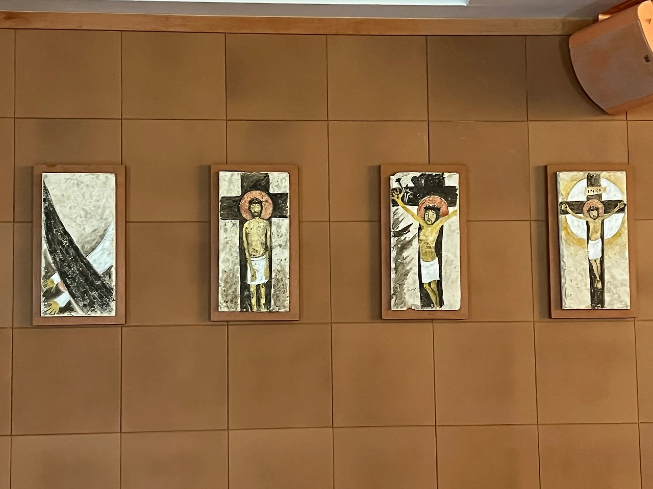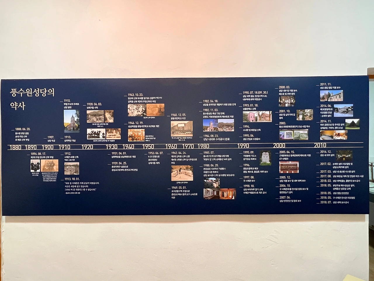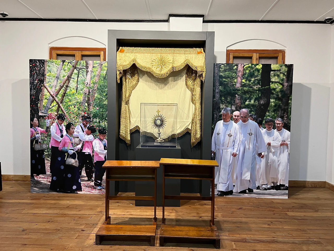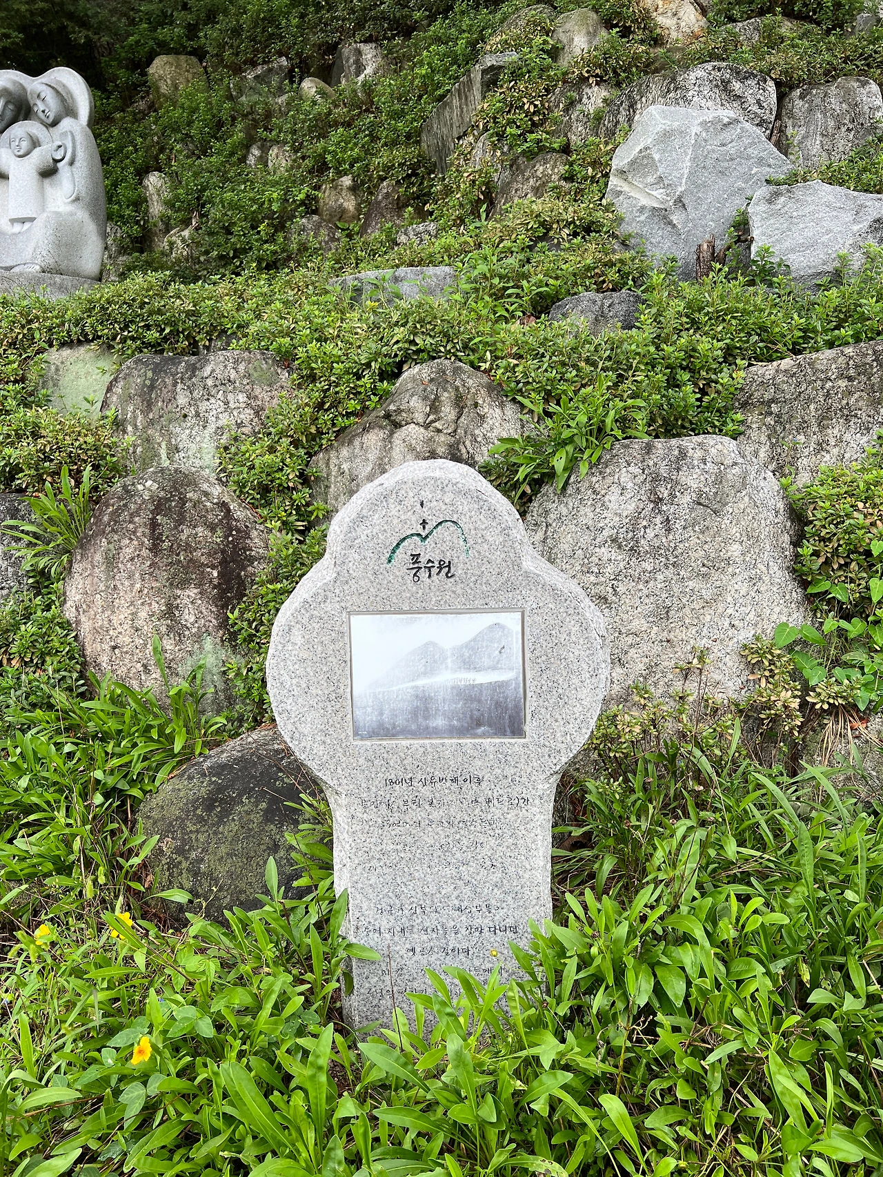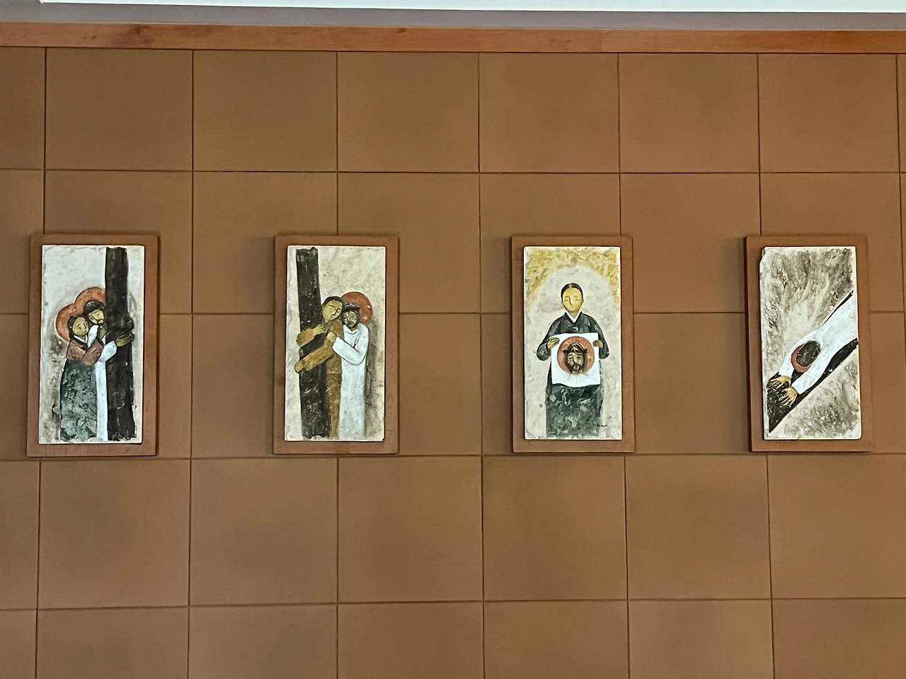 성당을 나와 왼쪽 언덕으로 난길 을 따라 올라가면 약간 아래로 성당의 모습이 한눈에 보이는데 멀리 산허리에 걸친 하얀 구름들과 함께 아름다운 한폭의 그림처럼 보입니다. 풍수원성당은 이처럼 유물 전시관 외에도 성체현양대회를 하는 곳과 성체조배실 등 둘러보아야 할 곳들이 많은 곳입니다. 아름다운 14처의 그림들과 조그만 소품들이 한 순간도 놓치기 힘들 아름답고 은혜로운 공간을 만들어가고 있었습니다.