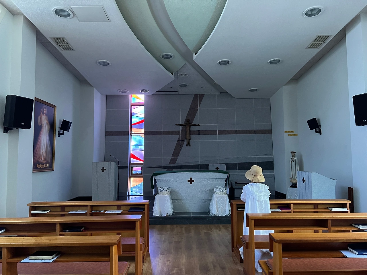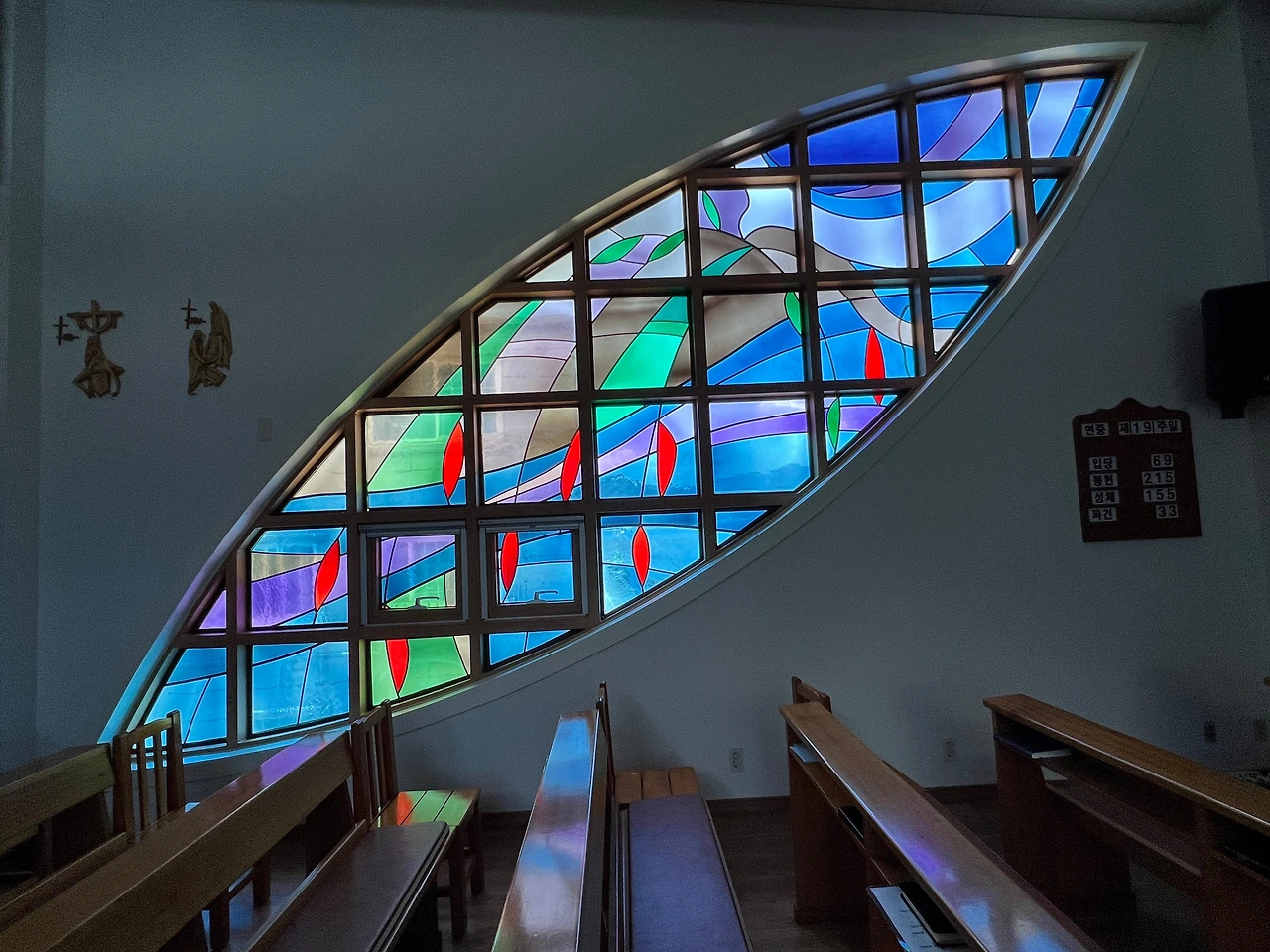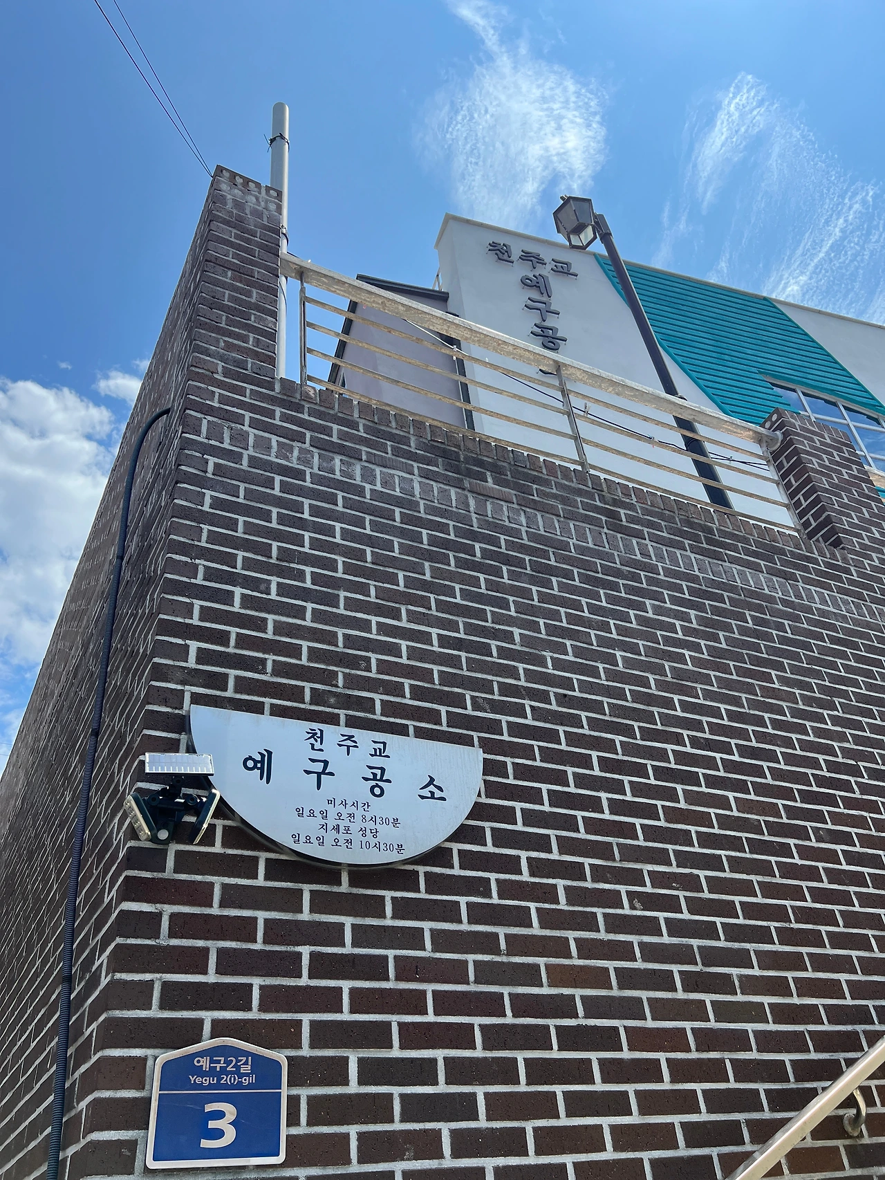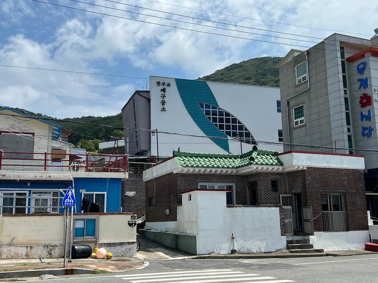 휴가를 맞아 거제도에 있는 성당과 공소를 찾아보기로 하였습니다. 그중 특이하게도 새로 지은 공소인 예구공소를 다녀오기로 했습니다. 전국 대부분의 공소는 오래된 옛집이나 지은 지 오래된 작은 서양식 건물들이 많습니다. 인구가 줄어드는 시골지역이 많아 공소의 역할이 축소되거나 멸실되기도 합니다. 그래서 공소를 재건축하는 일이 무척 드문데 예구공소는 2011년에 오래된 건물을 허물고 새로 지어진 공소입니다. 바닷가 마을들이 그런 것처럼 약간은 가파른 언덕에 촘촘히 집들이 모여 있는 곳 그리 높지 않은 곳에 천주교 예구공소가 보입니다. 어촌마을에 조금은 특이한 현대식 디자인의 건물이기도 하고 외관의 하얀색 벽과 물고기 모양의 창 때문에 한눈에 들어옵니다.