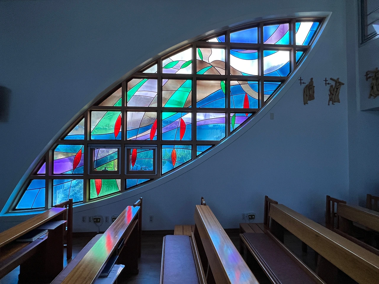 기념성전의 천정과 좌우 유리화는 익투스모양의 물고기를 형상화하고 있습니다. 익투스는 헬라어로 물고기를 뜻하며 초기 기독교 신자들이 비밀스럽게 사용했다고 전해지는 기독교의 상징으로 두 개의 곡선을 겹쳐 만든 물고기 모양으로 나타냅니다. 예수그리스도 하느님의 아들 구세주라는 고백의 뜻을 가지고 있습니다. 각 단어마다 한 글자씩 따서 익투스라고 발음합니다. 박해를 피해 거제도에 온 윤봉문 요셉가족이 은둔하며 이 지역 복음화에 힘쓴 것을 단적으로 표현하는 것 같았습니다.