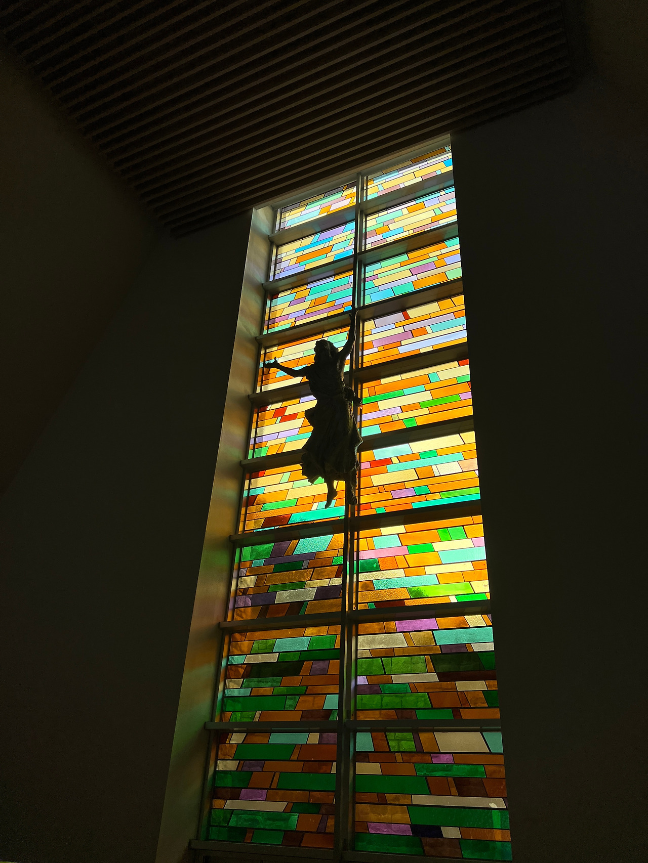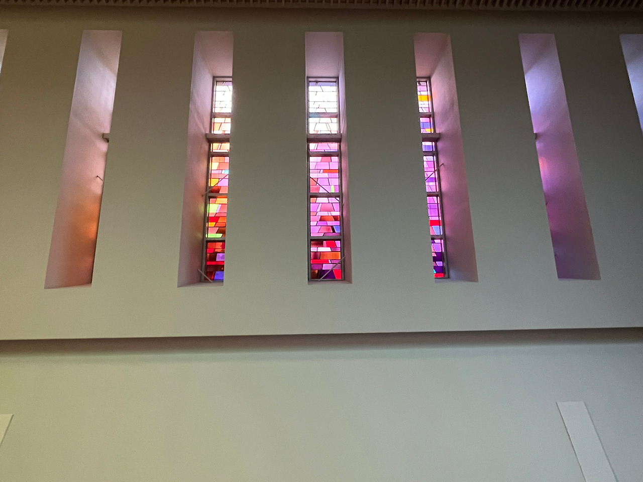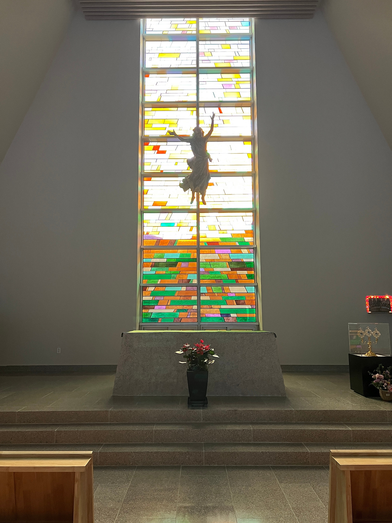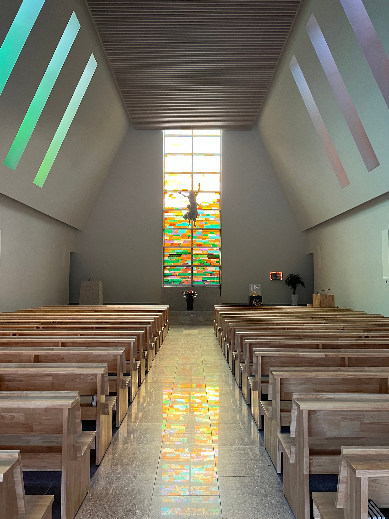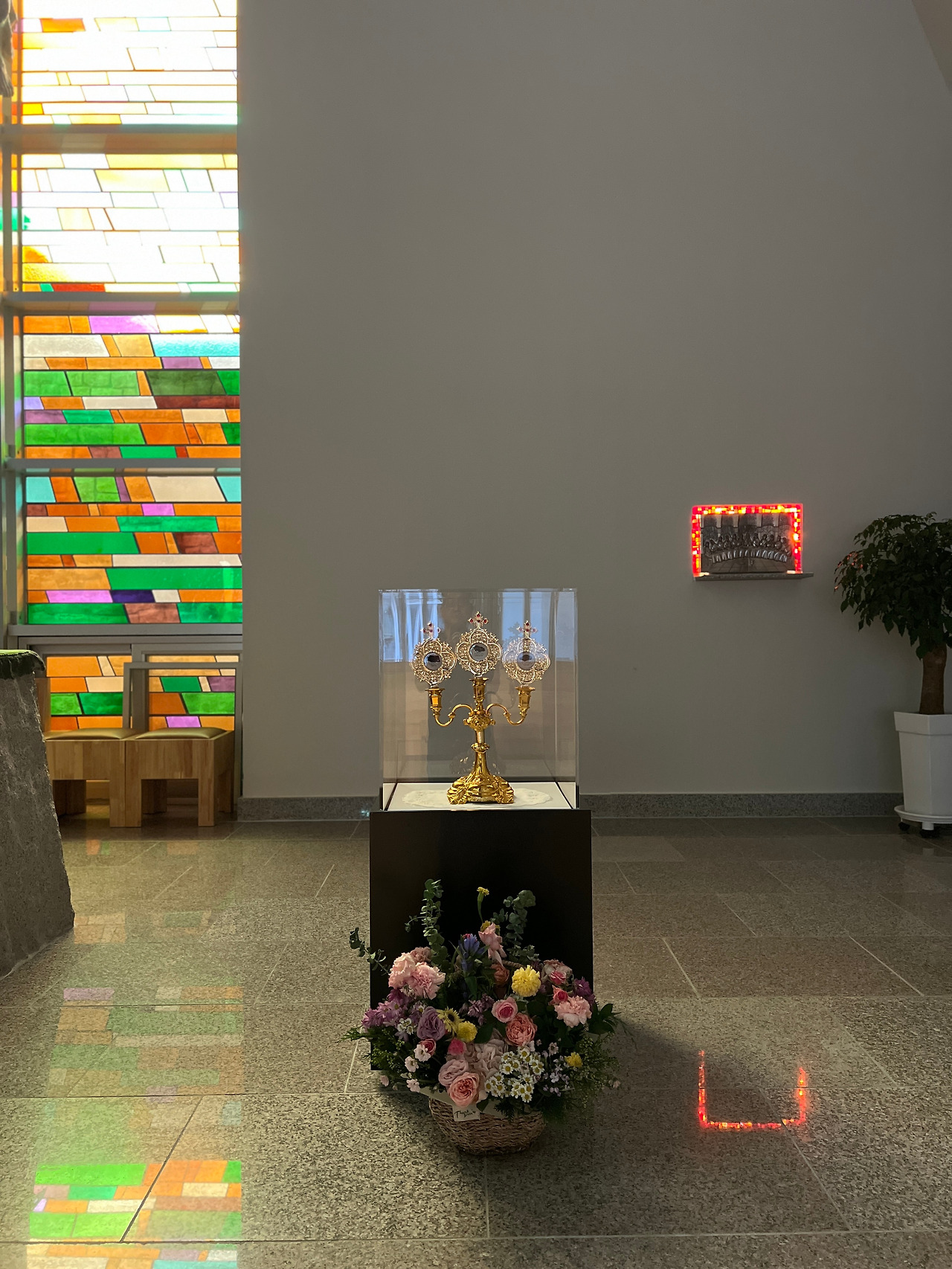 새 성전은 그리크지 않지만 십자고상을 대신하여 제대뒤쪽 승천하는 예수님상이 상당히 인상적이었습니다. 유리화를 뒤로 하고 하늘로 오르시는 예수님의 모습이 역동적이고 신비스럽게 보였습니다. 자연스레 두손을 모으고 예수님을 향해 기도하는 손이 되었습니다. 제대옆에는 순교자 세분의 유해를 모시고 있는 장식이 있습니다. 간결하지만 신비스런 성전의 모습이 오래도록 잊혀지지 않을 듯합니다.