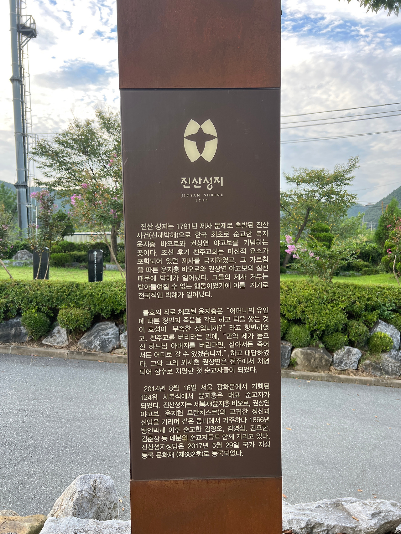 충남 금산의 작은 마을 진산에 있는 진산성지는 천주교 교리를 따르기 위해 조상의 위패를 불사르고 유교식 제사를 거부해 전주풍남문에서 참수된 첫 순교자 윤지충·권상연 복자 그리고 신유박해 때, 순교한 윤지헌 복자를 기념하기위한 성지입니다. 아직은 조선의 가톨릭이 겨우 첫발을 떼던 그 당시 사제도 없는 곳에서 피어난 신앙이 죽음을 내어줄 만큼 강한 신념으로 남을 수 있었는지 그 믿음을 주시고 키워주신 하느님의 은혜가 고스란히 내린 진산땅이라는 생각이 들었습니다. 그 축복받은 땅에 새롭게 조성된 성지는 순례길과 함께 성스러운 하느님의 땅이 되어가고 있었습니다.