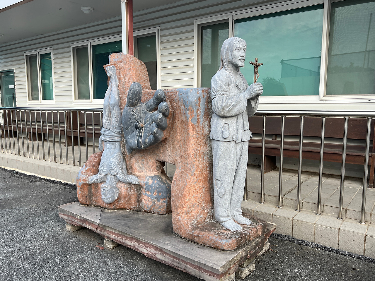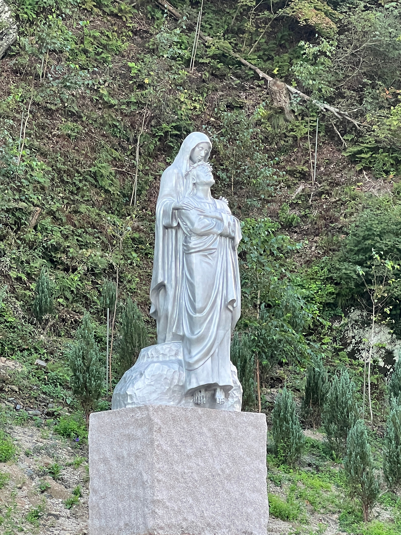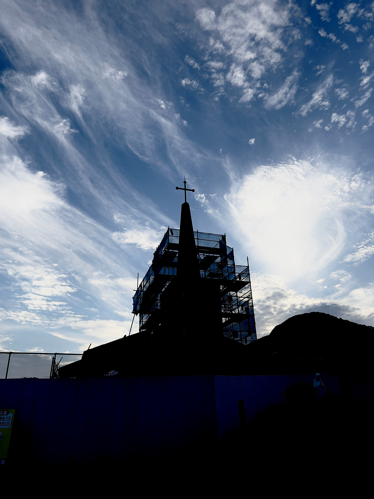 작지만 소박하고 아름다운 진산성지성당을 순례하기로 정하고 이른 아침부터 길을 재촉합니다. 길가 약간 오르막진 곳에 위치한 진산성지성당은 오래되어 칠이 벗겨지고 군데군데 낡아 보수가 필요하다는 말을 인터넷 어딘가에서 본 기억이 있었습니다. 1927년 건립된 성당으로 아직도 미사공간으로 사용할 정도로 그 원형이 아름답게 보존되어있다고 들었습니다. 하지만 늦은 오후 겨우 도착한 진산성지성당은 마침 복원공사중이었습니다. 초가을의 하늘 아래 군데군데 떠있는 파란하늘이 유독 공사중인 성당 첩탑의 십자가를 더욱 또렸하게 보이게 하여 아쉬운 마음이 더 깊었습니다. 올해 4월부터 시작한 공사로 내년 1월이나 되어야 복원이 마무리 된다고 합니다. 너른 대지 위 잘 자란 잔디밭위에 돌로된 야외제대가 있고 그옆에 조그마한 동상이 하나 있습니다. 애기를 포대기에 업은 모습인데 성모상인가 싶기도 하고 순교하신 윤지충바오로의 어머니 모습인가 싶기도 했습니다. 별다른 설명이 없어 알수는 없으나 성모님과 같은 마음을 품고 순종의 삶을 살아간 윤지충바오로의 어머니와 그 아들의 모습이라고 해도 크게 이상하지 않을 듯합니다. 사무실쪽으로 가보니 모든 미사가 새로 지어진 성전에서 집전된다는 안내문구가 있었습니다. 기대감을 품고 3분정도 거리에 있는 새성전을 순례하기 위해 발길을 돌렸습니다.