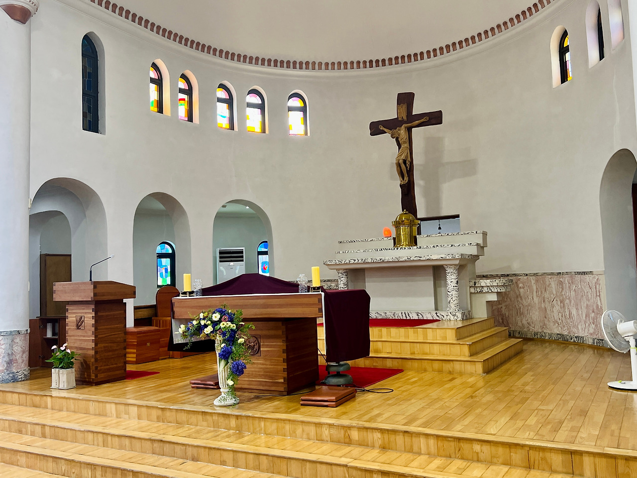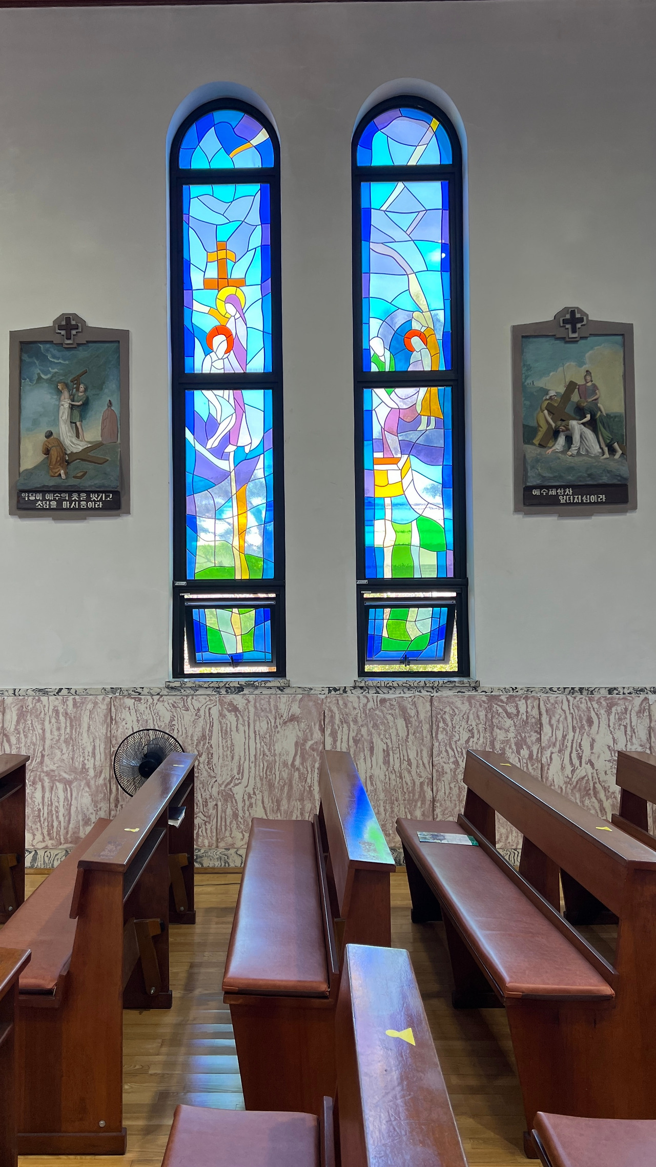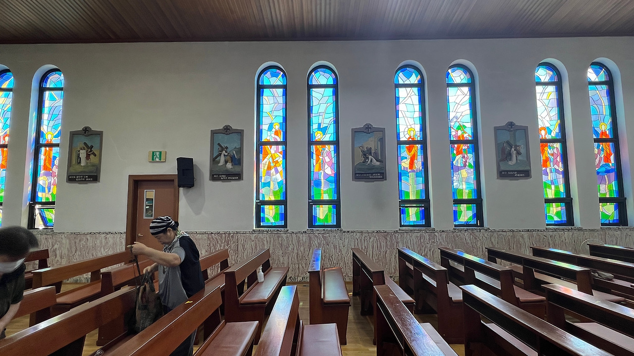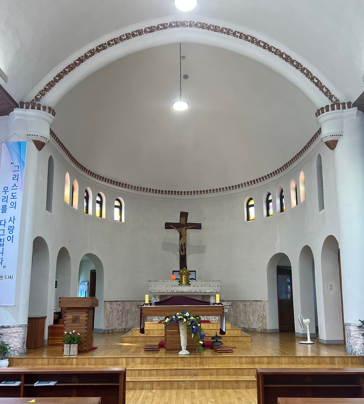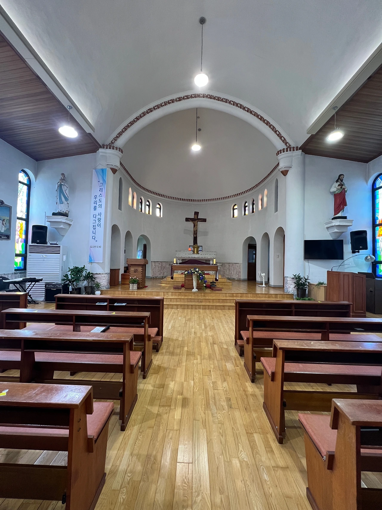 교중미사가 10분전이라 서둘러 본당안으로 들어갑니다. 긴 장방형의 회중석은 시골의 성당이지만 꽤나 많은 신자들이 미사참례를 할 수 있을 만큼 넓어 보였습니다. 성당안의 제대와 창들역시 부드럽고 온화한 아치형입니다. 장식할 수 있는 모든 것이 눈썹모양의 아치형이라 그 부드러운 곡선미가 성당에 들어선 모든 신자들을미소띤 얼굴로 만들고 있는 듯합니다.