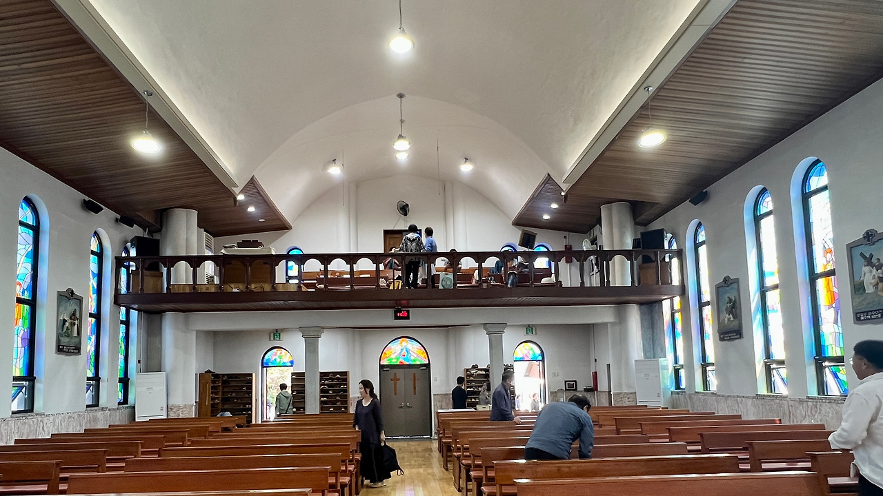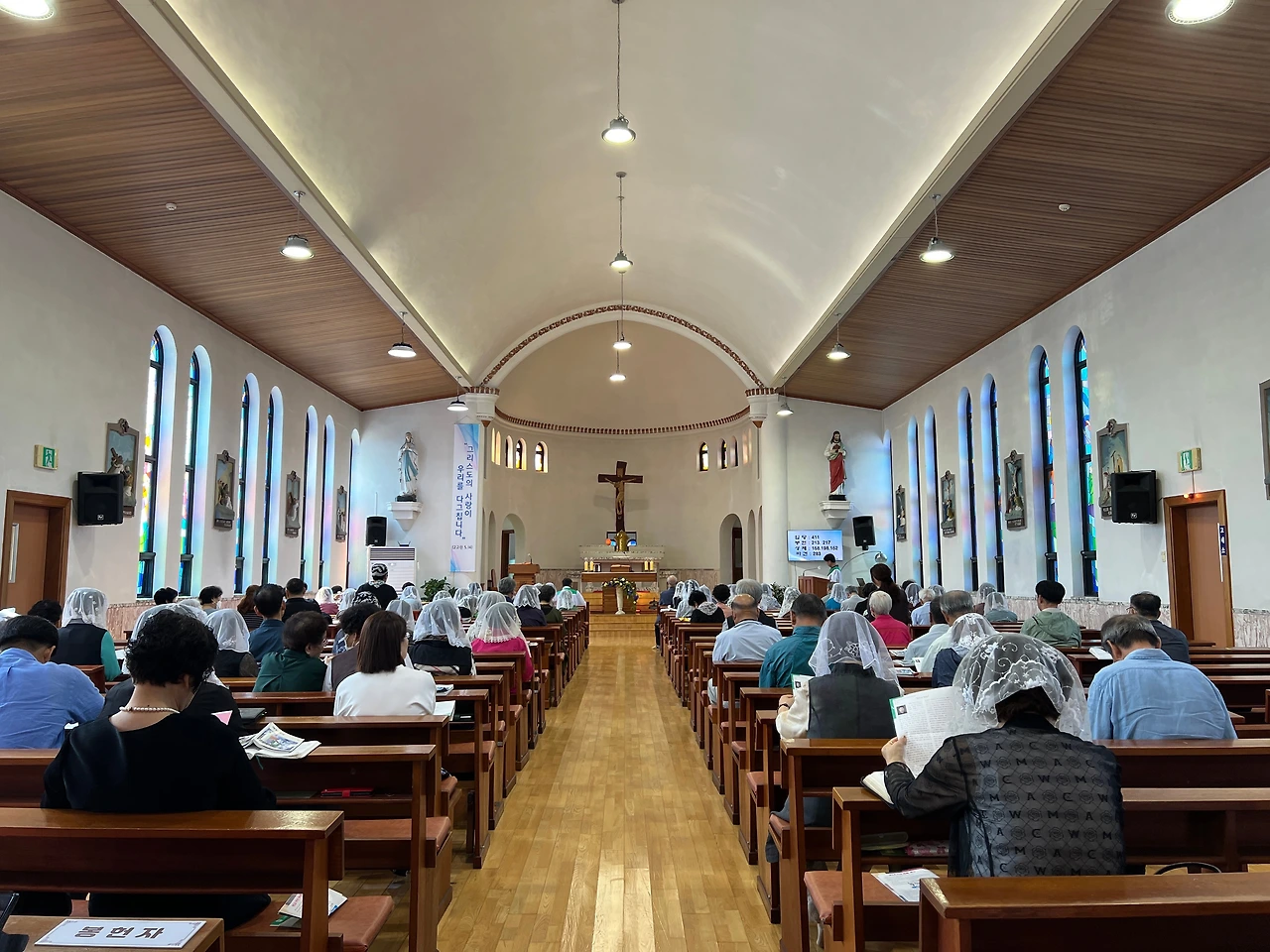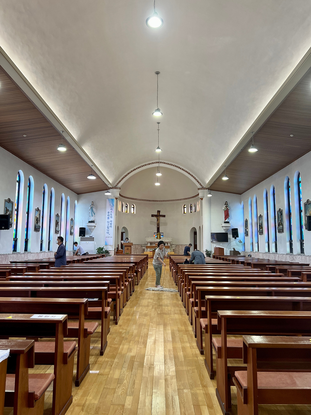 곧이어 뒷쪽 성가대의 입당송과 함께 미사가 시작됩니다. 뒤쪽 2층의 성가대에서 들리는 성가소리는 앞쪽으로 퍼지듯 흘러나와 천장과 벽에 부딧히고 공명되어 더욱 아름답게 들립니다. 신자들이 부르는 성가도 왠지 이곳에서 만큼은 활기차게 들렸습니다. 김정훈 스테파노 주임신부님의 강론중에도 신부님의 물음에 일일이 화답하는 신자들의 목소리가 노령의 신자들이지만 씩씩하고 자신감이 가득차 있어 무척 인상적이었습니다. 모든 것을 공평하게 주시는 하느님의 은혜를 들으며 절로 아멘하는 소리가 나오기도 합니다.