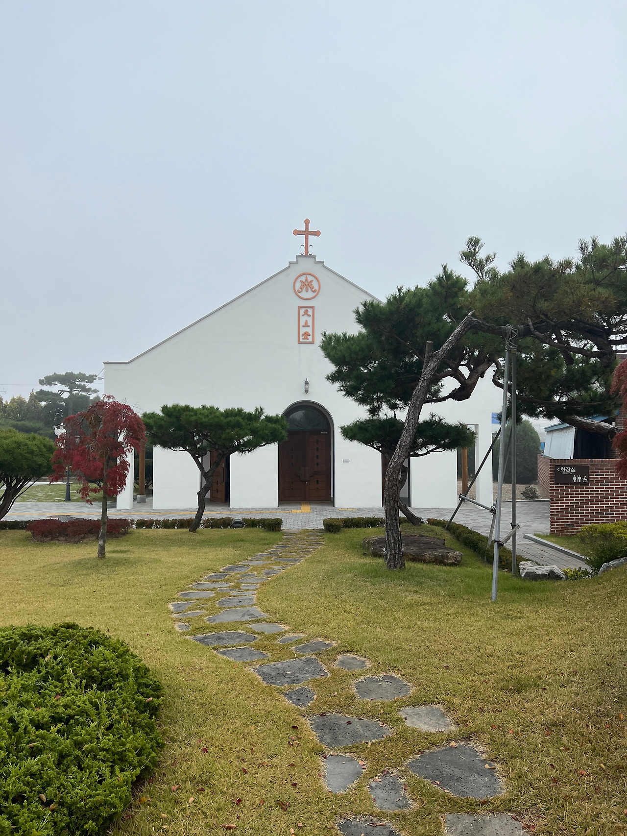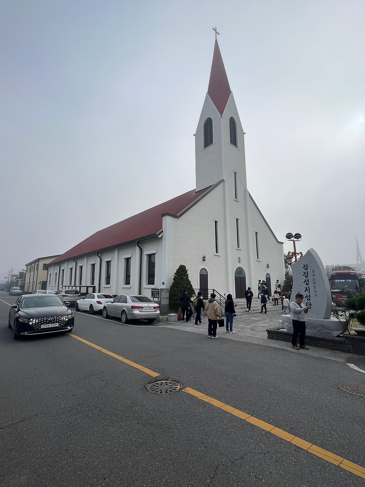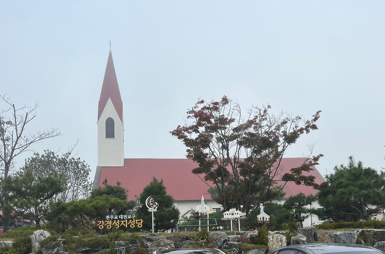 이러한 역사를 간직한 강경성당은 1961년에 건립된 성당으로 흔히 볼 수 없는 특이한 구조의 아름다운 성당입니다. 도착한 시간이 오전 9시경이었는데 안개가 성당 주변을 감싸는 듯 내려앉아 더욱 아름답고 성스럽게 느껴기도 하였습니다. 성당의 전면엔 1개의 주출입문과 작은 2개의 문이 아치형으로 나있으며 별다른 장식 없는 평면이지만 하얀색 벽면이 세련되고 웅장해 보입니다. 측면은 밝은 색 벽체와 붉은색 지붕이 너무도 조화로워 1961년에 지어진 건축물이지만 현대식 건축물이라 해도 전혀 어색하지 않을 만큼 군더더기 없는 건축적 디자인입니다. 당시 건축에 조예가 깊은 보드뱅신부의 설계와 감독으로 지어졌다고 합니다.