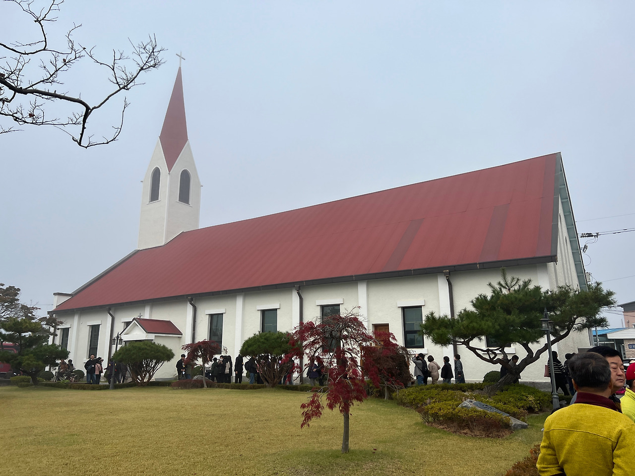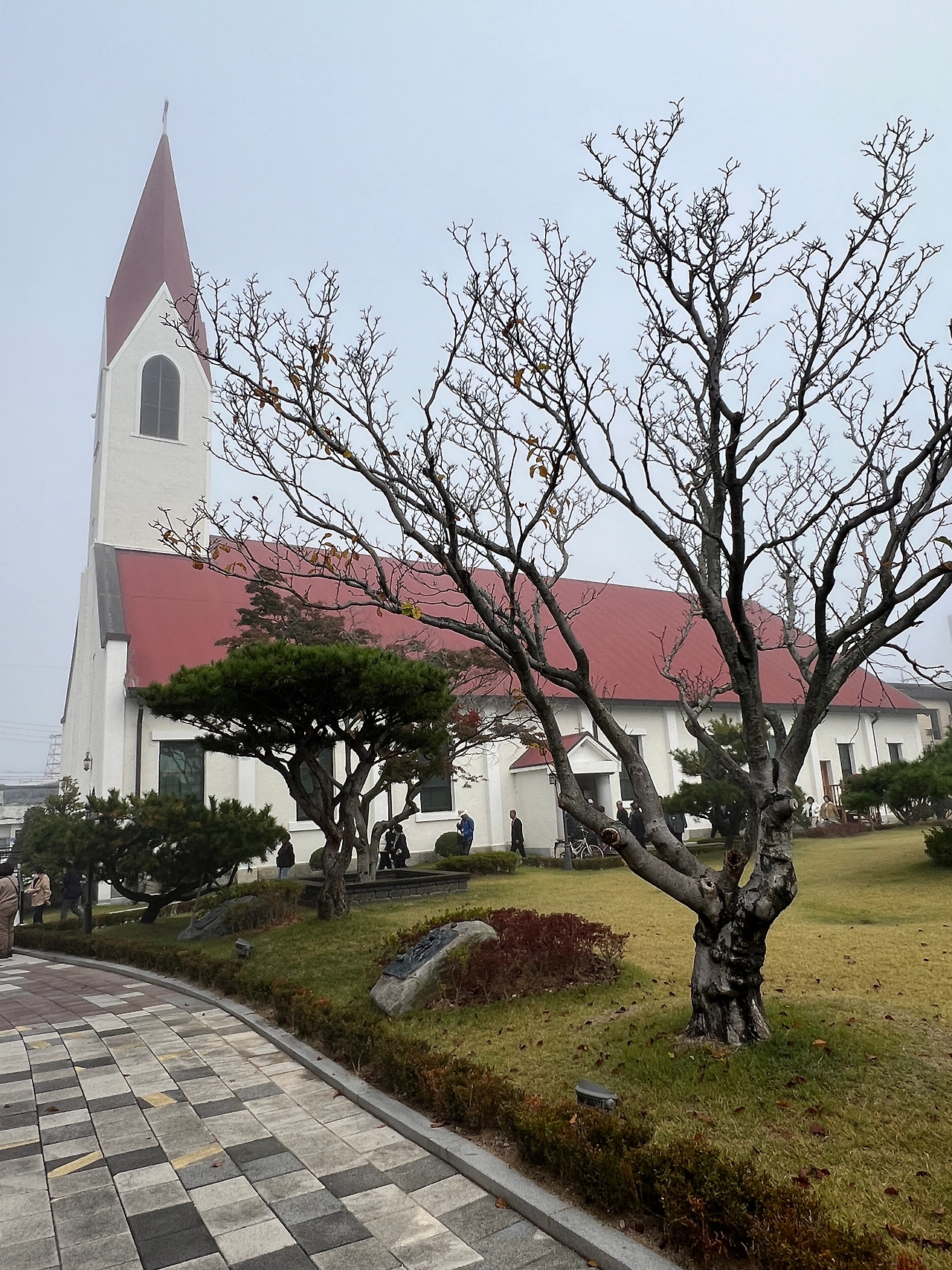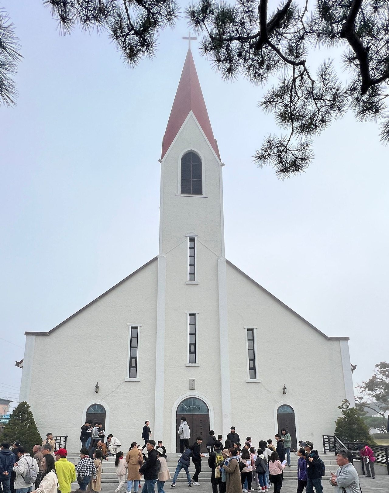 이러한 역사를 간직한 강경성당은 1961년에 건립된 성당으로 흔히 볼 수 없는 특이한 구조의 아름다운 성당입니다. 도착한 시간이 오전 9시경이었는데 안개가 성당 주변을 감싸는 듯 내려앉아 더욱 아름답고 성스럽게 느껴기도 하였습니다. 성당의 전면엔 1개의 주출입문과 작은 2개의 문이 아치형으로 나있으며 별다른 장식 없는 평면이지만 하얀색 벽면이 세련되고 웅장해 보입니다. 측면은 밝은 색 벽체와 붉은색 지붕이 너무도 조화로워 1961년에 지어진 건축물이지만 현대식 건축물이라 해도 전혀 어색하지 않을 만큼 군더더기 없는 건축적 디자인입니다. 당시 건축에 조예가 깊은 보드뱅신부의 설계와 감독으로 지어졌다고 합니다.