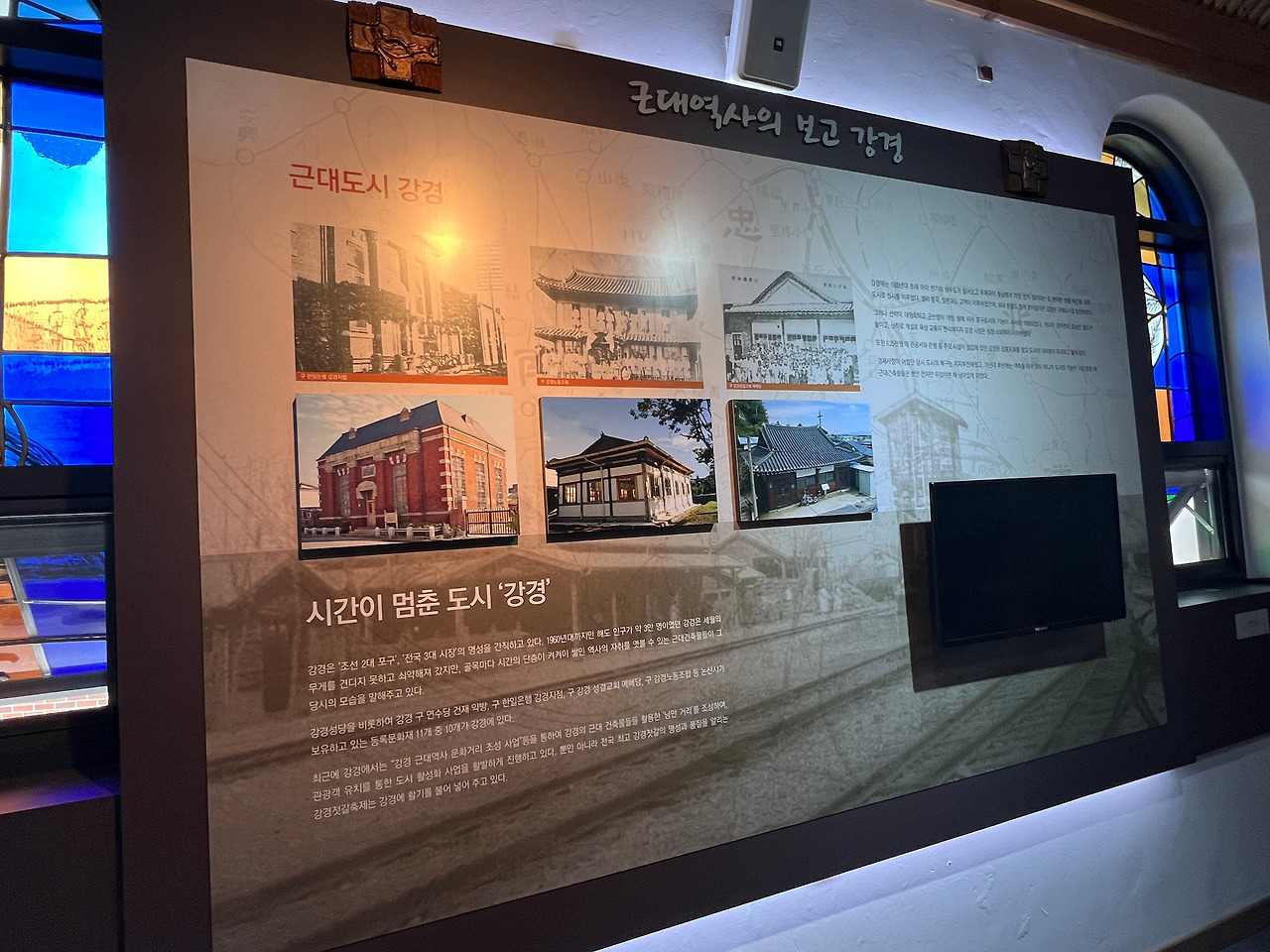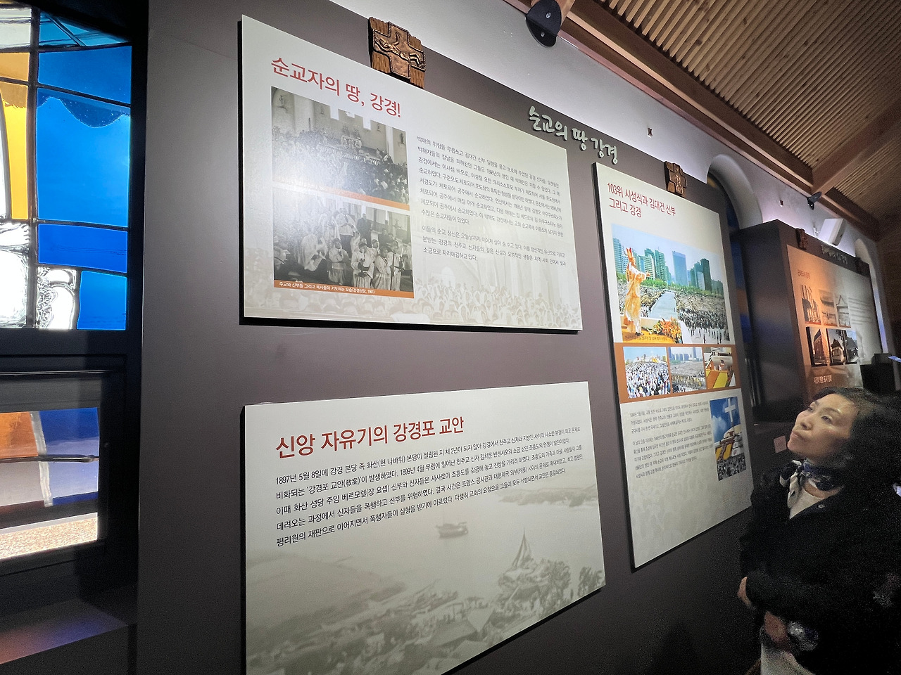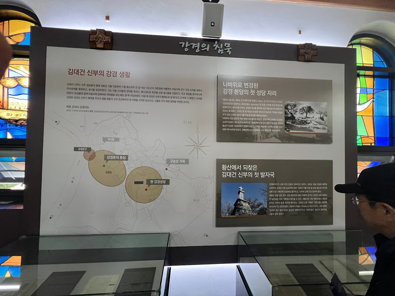 성당의 앞마당엔 천주당이라는 작은 건물이 있습니다. 이 건물은 상해의 김가항성당을 그대로 재현한 건물로 작은 경당으로 사용하기도 하고 강경의 역사를 담은 박물관으로도 활용되고 있습니다. 벽면엔 강경의 종교적인 역사와 지리적 특징 등을 전시해 두었고 유리화는 김대건신부님께서 강경에 도착하기까지의 여정이 잘 표현되어있어 보는 이들로 하여금 당시의 어려웠던 상황을 짐작할 수 있도록 합니다.