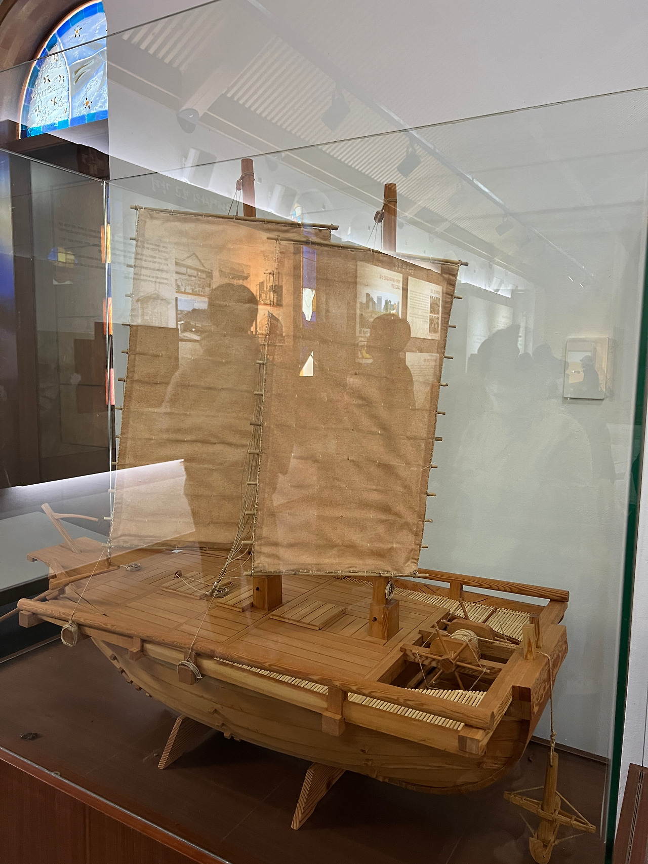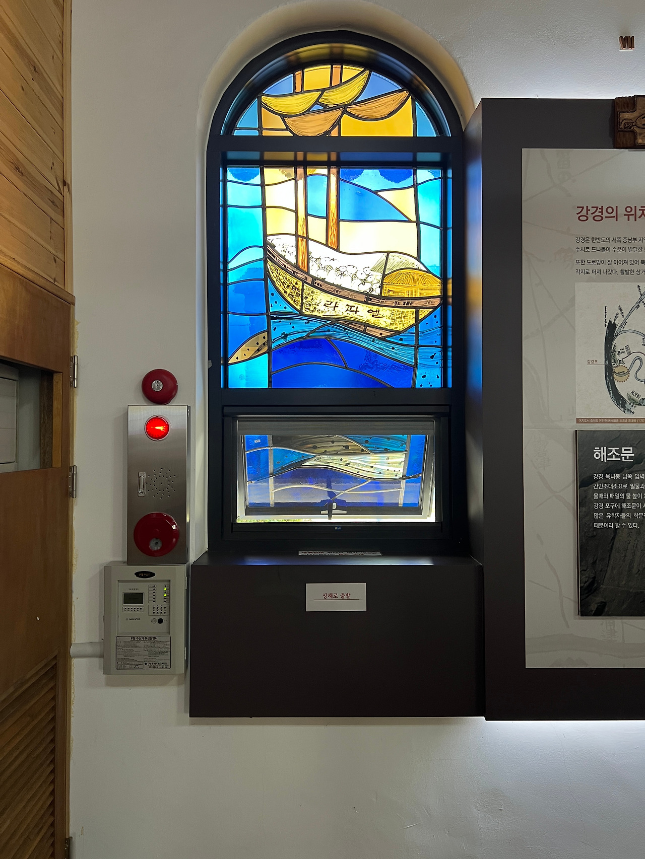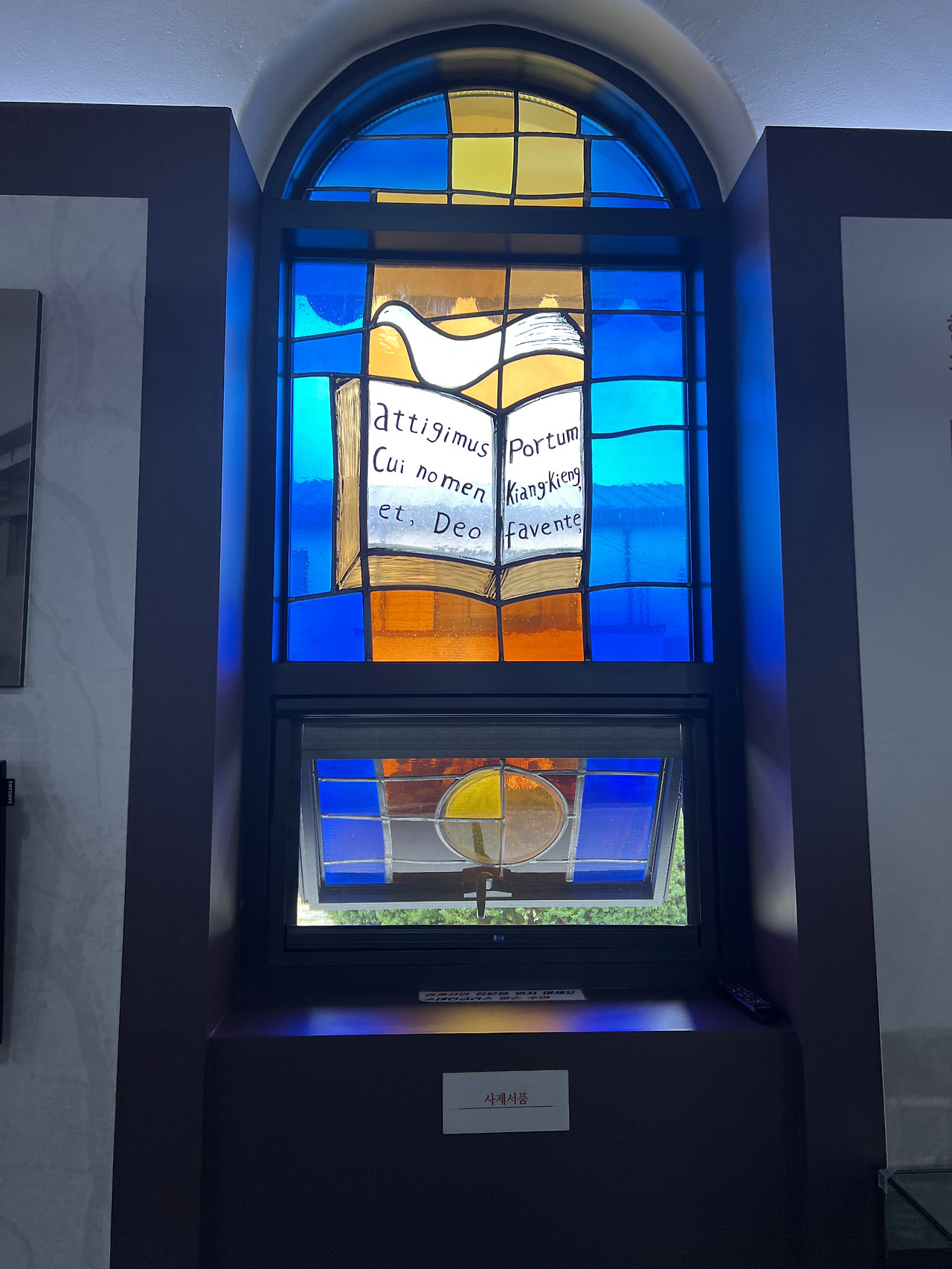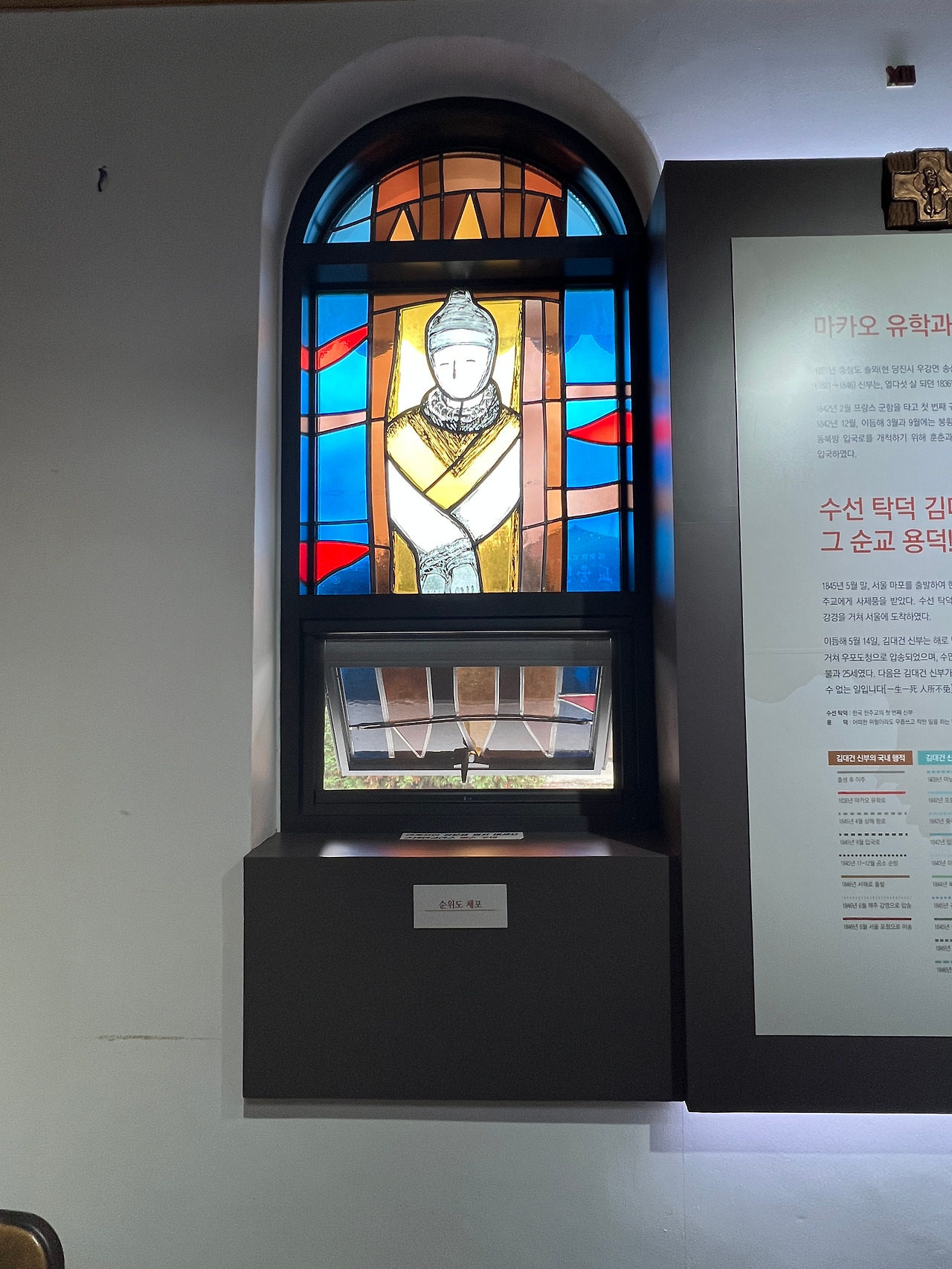 성당의 앞마당엔 천주당이라는 작은 건물이 있습니다. 이 건물은 상해의 김가항성당을 그대로 재현한 건물로 작은 경당으로 사용하기도 하고 강경의 역사를 담은 박물관으로도 활용되고 있습니다. 벽면엔 강경의 종교적인 역사와 지리적 특징 등을 전시해 두었고 유리화는 김대건신부님께서 강경에 도착하기까지의 여정이 잘 표현되어있어 보는 이들로 하여금 당시의 어려웠던 상황을 짐작할 수 있도록 합니다.