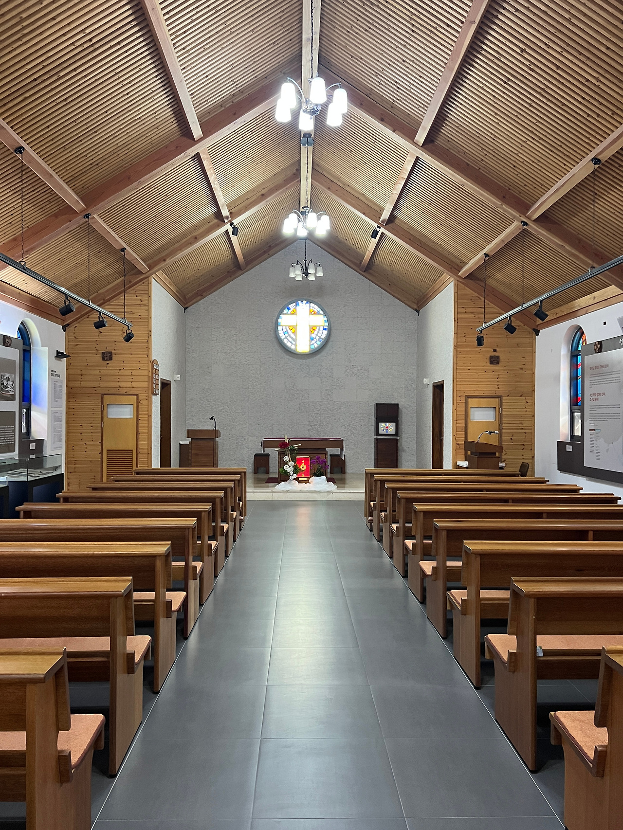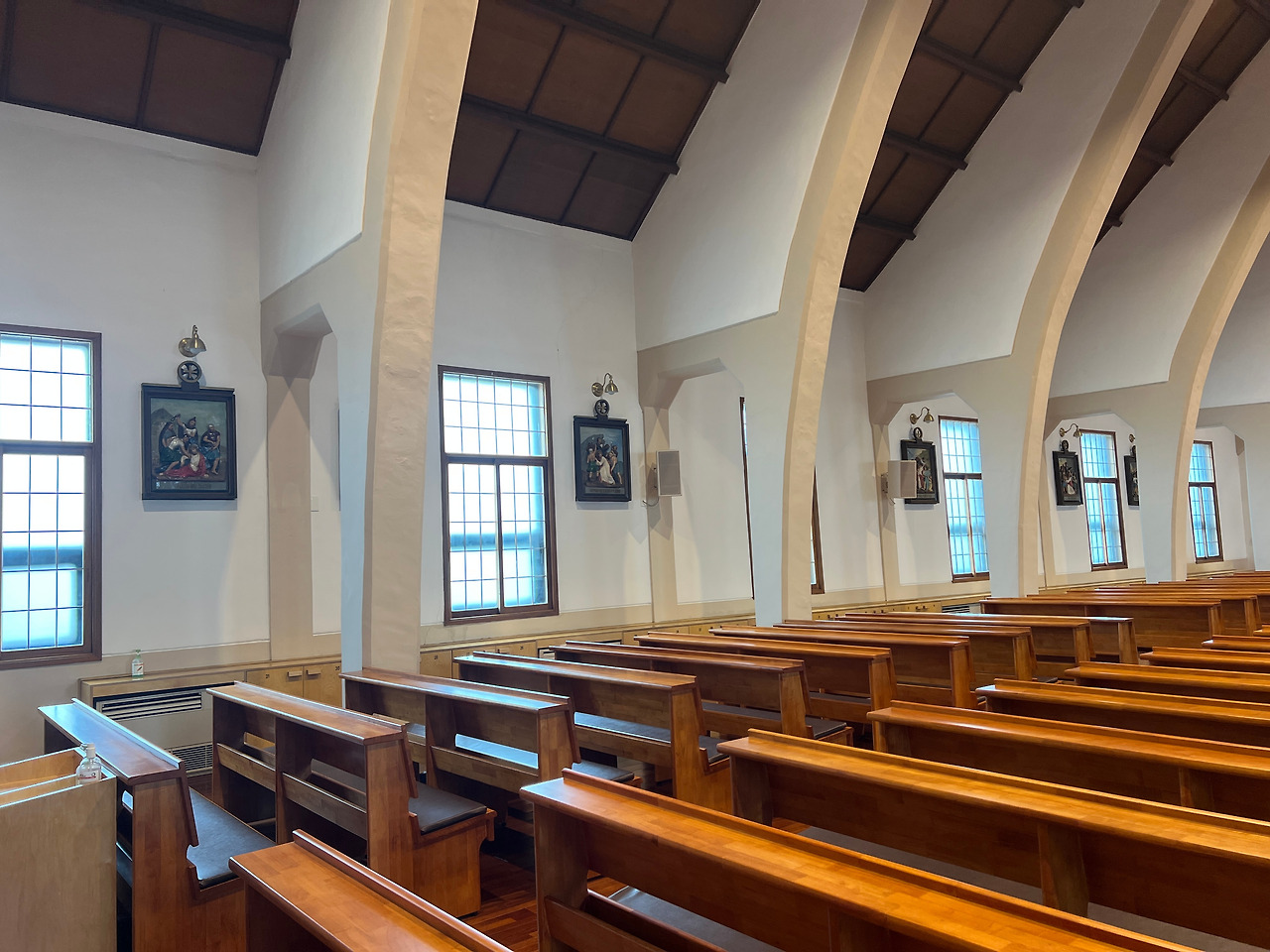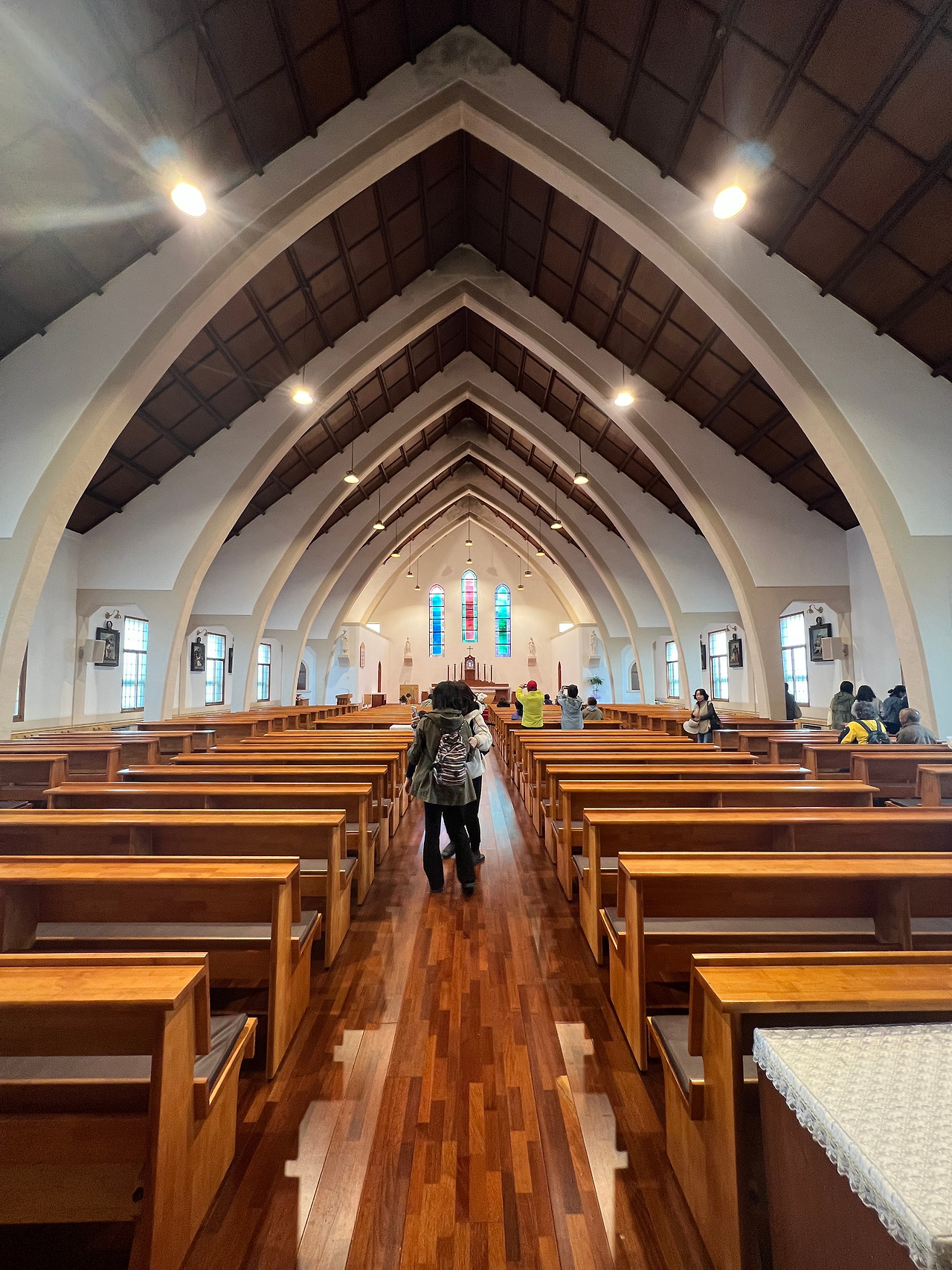 성전내부는 첨두형아치보라는 특이한 공법으로 지어진 성당인데 외부에서 보는 모습과는 달리 내부가 상당히 넓게 보였습니다. 아무래도 아치형의 천장이 높다 보니 내부공간이 실제면적보다 훨씬 더 넓어 보이는 것 같기도 하였습니다. 첨두형 아치보는 배의 구조중 하단부를 형상화했다는 것으로 보아 라파엘호를 상징하는 것 같기도 합니다. 흔히 볼 수 있는 스테인드글라스 장식은 제대뒤쪽에만 있고 측면의 창은 은은한 유리색으로 사각의 목재틀로 창을 내어 장식하였는데 우리나라 고유의 한옥창문같이 보이기도 합니다. 전체적으로 담백한 모양이면서 현대적 세련미가 돋보이기도 합니다.