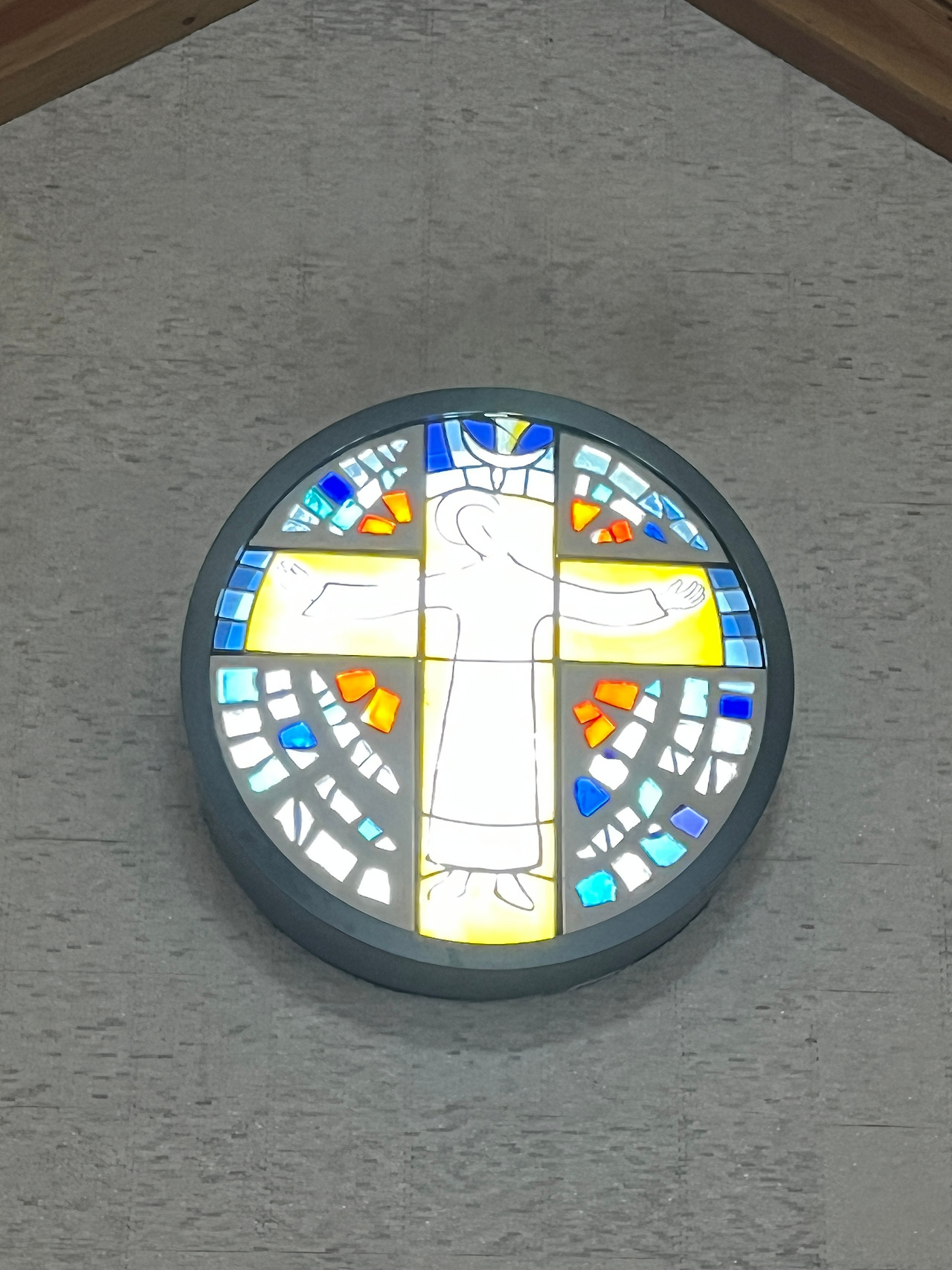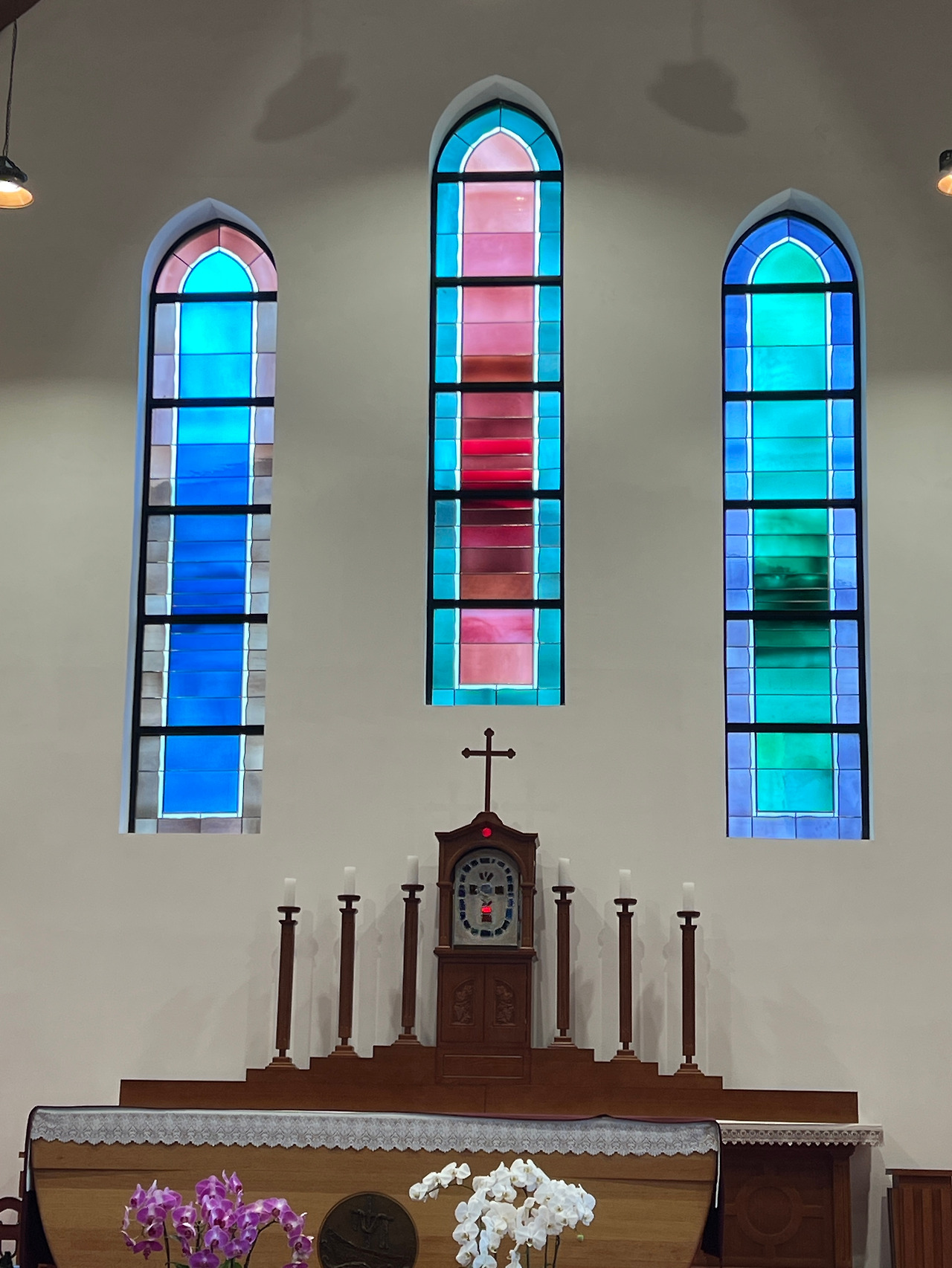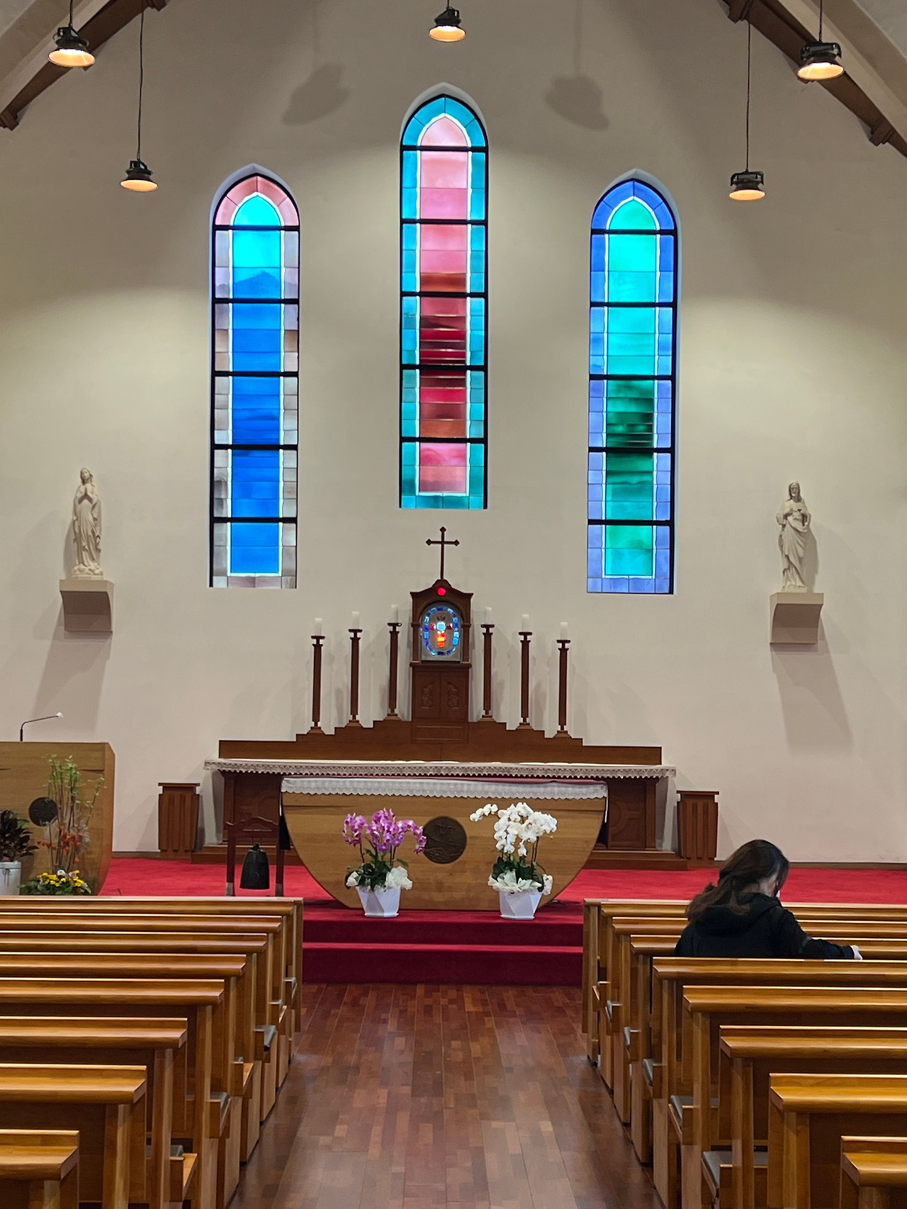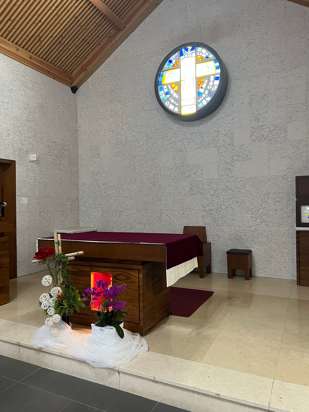 성전내부는 첨두형아치보라는 특이한 공법으로 지어진 성당인데 외부에서 보는 모습과는 달리 내부가 상당히 넓게 보였습니다. 아무래도 아치형의 천장이 높다 보니 내부공간이 실제면적보다 훨씬 더 넓어 보이는 것 같기도 하였습니다. 첨두형 아치보는 배의 구조중 하단부를 형상화했다는 것으로 보아 라파엘호를 상징하는 것 같기도 합니다. 흔히 볼 수 있는 스테인드글라스 장식은 제대뒤쪽에만 있고 측면의 창은 은은한 유리색으로 사각의 목재틀로 창을 내어 장식하였는데 우리나라 고유의 한옥창문같이 보이기도 합니다. 전체적으로 담백한 모양이면서 현대적 세련미가 돋보이기도 합니다.