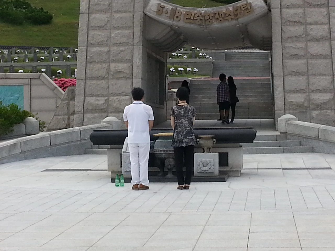 문을 들어서자 커다란 추모탑이 보이고 그 앞에 참배하는 분들이 여럿보인다. 항시 향을 준비해두는 것같다. 이곳을 찾는 참배객들은 너나 할 것없이 그 앞에서 남의 시선같은건 아랑곳하지 않고 한참을 고개를 숙이고 그자리에 서있었다. 많은 곳을 다녀봤지만 이렇듯 진심어린 참배를하는 시민을 보는 것은 흔치않는 일이다. 동작동 국립묘지는 그렇치 않다. 동작동은 자신의 혈육이나 관계가 있는 묘지 앞에서만 헌화한다. 하지만 여긴 그렇지 않다. 적어도 5.18민주항쟁에 대한 남다른 관심과 아픔을 공감하는 분들이 찾는 만큼 참배하는 진심도 그 깊은 애도의 마음도 그 깊이가 다르리라 생각된다. 참배객들은 나 대신 저곳에 누워있는 시민들을 애도하는 것이다.