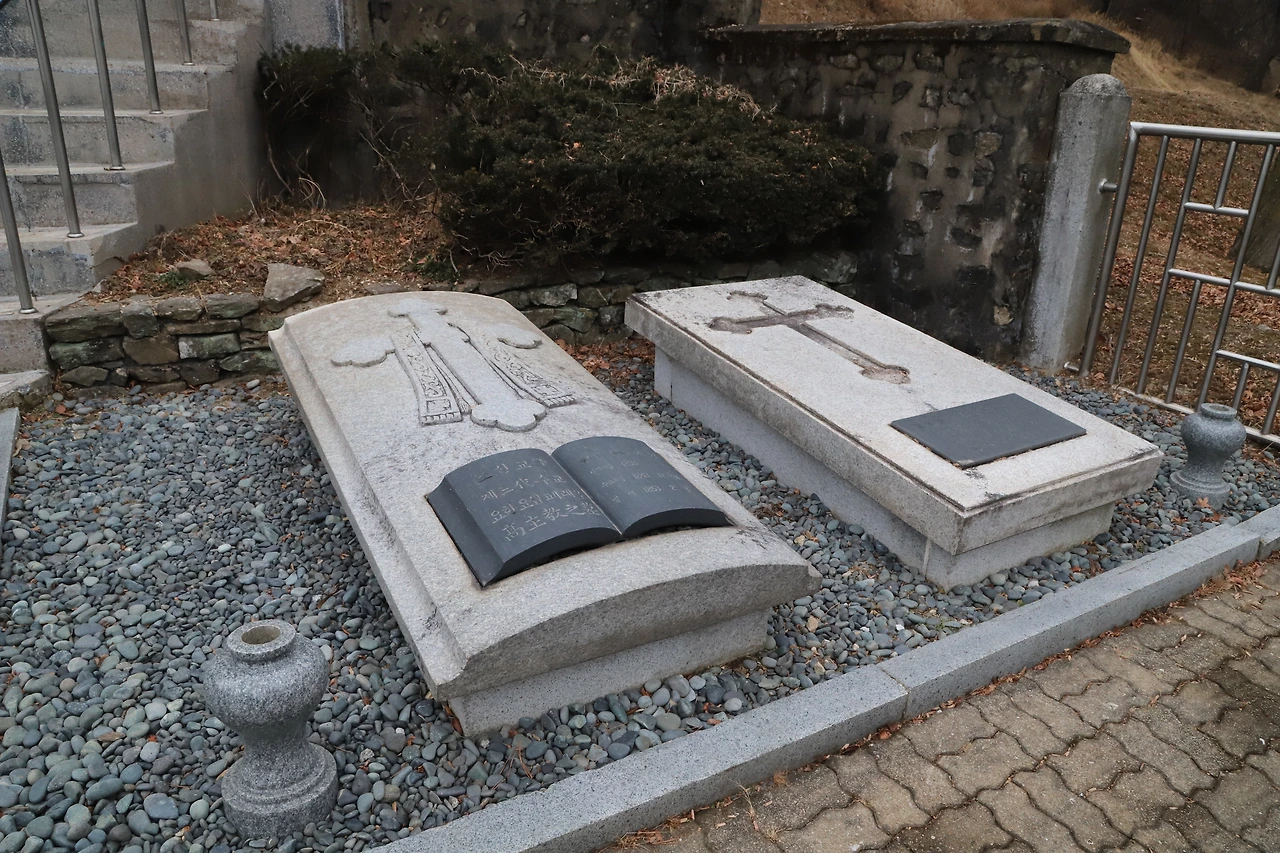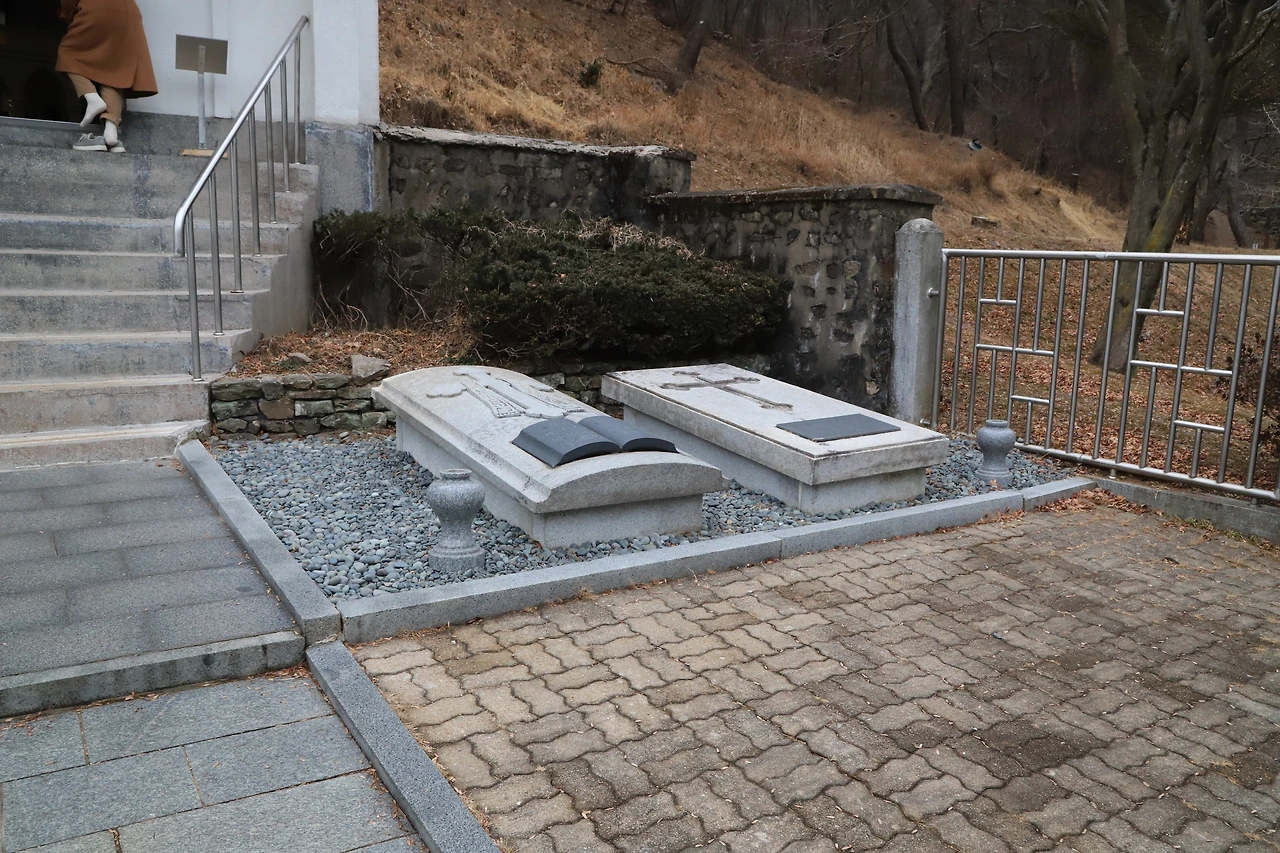 기념성당 앞쪽에는 김대건 신부님과 김대건 신부님께 사제서품을 주신 페레올 주교님의 묘역이 조성되어있습니다. 폐레올 주교님은 “내가 죽거든 나의 고향 프랑스로 가지말고 거룩한 순교자 김대건 신부옆에 묻어달라”고 유언하셨다고 합니다. 김대건 신부님의 순교 이후 외방전교회 교장에게 쓰신 서신에는 “이 젊은 사제를 잃은 것이 저에게 얼마나 큰 충격이며 슬픔인지 신부님들께서도 아실 것입니다. 저는 그를 아비가 자식을 사랑하듯 사랑했습니다.”라고 쓰셨다고 합니다. 또한 김대건신부님의 순교 이후 7년간이나 내포지역에 숨어계시면서 김대건 신부님에 대한 행적을 조사하시고 정리해서 바티칸으로 보내셨다고 합니다. 두분이 나란히 계신 묘역은 서로에 대한 아낌없는 사랑과 페레올 주교님의 김대건 신부님에 대한 순교자로서의 존경과 애뜻함이 순례자에게 오롯이 느껴지는 아름다운 공간이었습니다.