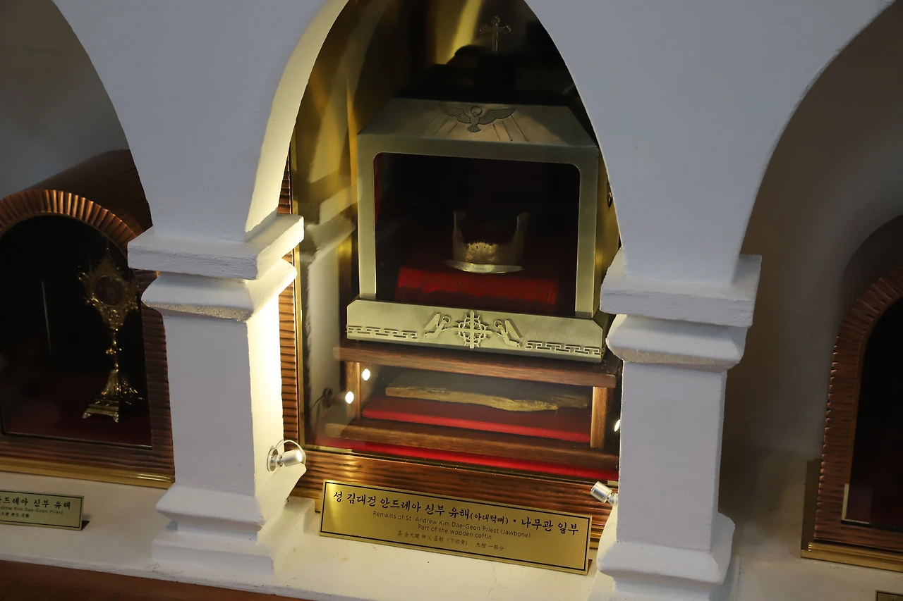 기념성당 앞쪽으로는 피에타상이 조각되어있습니다. 특이하게도 한복을 입으신 성모님 무릎에 상투와 두건을 쓴 예수님의 시신이 안겨져 있습니다. 마치 순교하신 김대건 신부님을 안고 슬퍼하시는 신부님의 어머니 고 우르슬라처럼 느껴져 순교하신 때의 모습이 눈앞에 그려지기도 하였습니다. 기념성당 제대 아래쪽에는 신부님의 턱뼈를 모시어 성인의 숨결을 느끼며 기도할 수 있기도 합니다. 어쩌면 세계에서 가장 작은 성당 중 하나이기도한 이 기념성당은 순교자 김대건 신부님의 희생과 신앙을 깊이 묵상하게 할 만큼의 무겁고 경건한 정적과 함께 세상과 경계지을 만큼의 성스런 침묵이 흐르고 있었습니다.