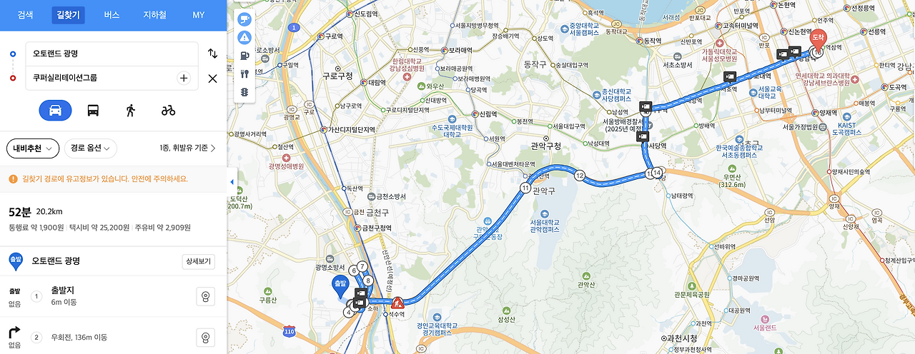 카카오맵으로 중간 중간 교통 사정을 실시간으로 알아보았다.