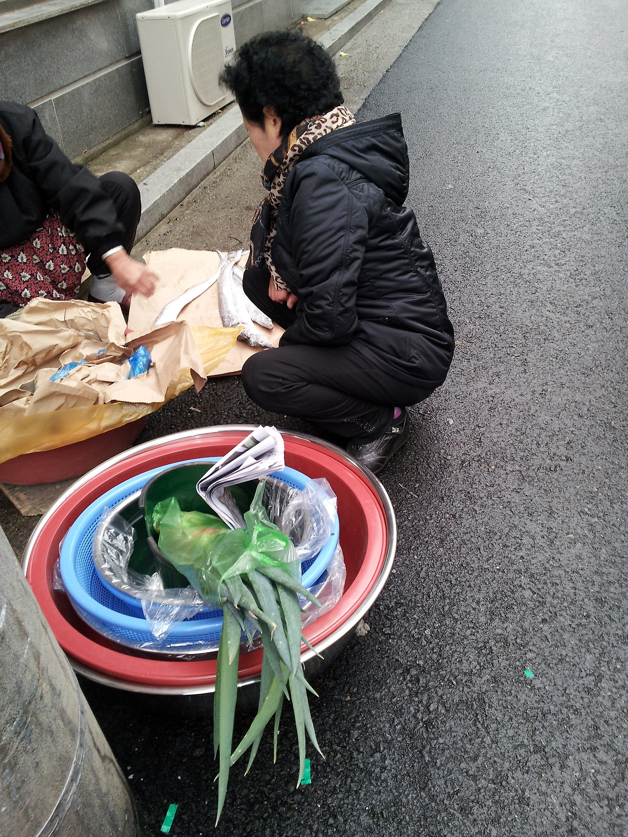 올라와 길가에 생선장사 앞에 쪼그려 앉아