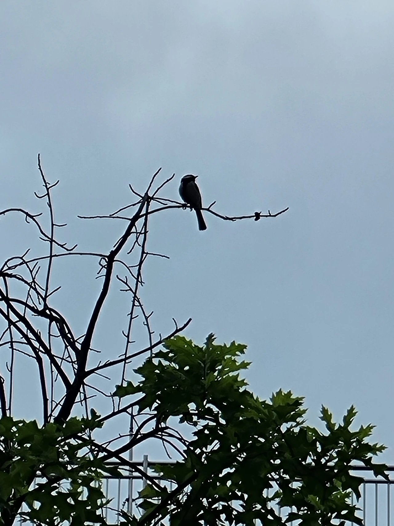 나무 끝에 새 한 마리 앉아 짹짹인지 쌕쌕인지 생기 넘치는 소리를 내며 아침을 알리고 있다.