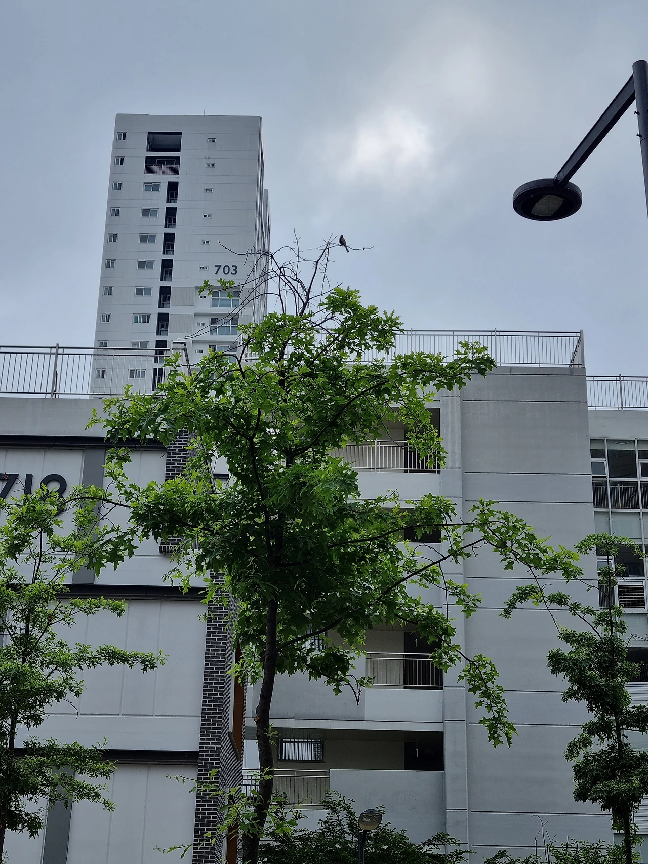 줄 서있는 나무에 정신 팔려 걷다 유난히 커진 새소리에 하늘 올려다본다.